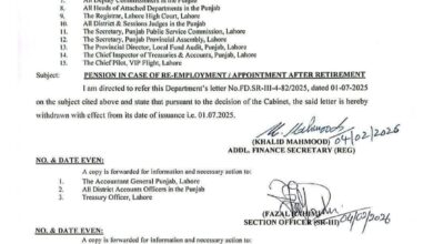 دوبارہ ملازمت کی صورت میں تنخواہ یا پنشن میں سے کسی ایک کے انتخاب،حکومت پنجاب نے نوٹیفکیشن واپس لے لیا