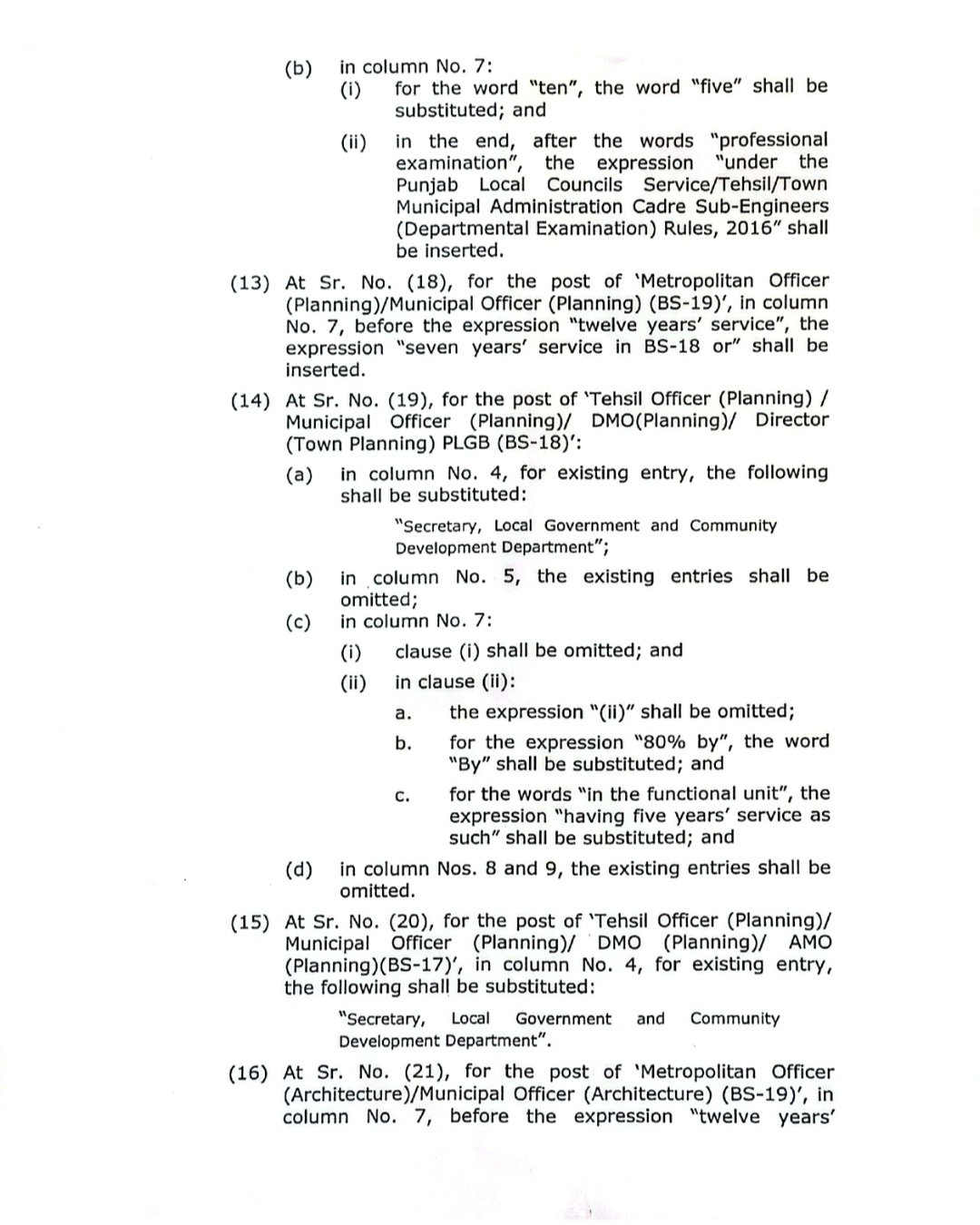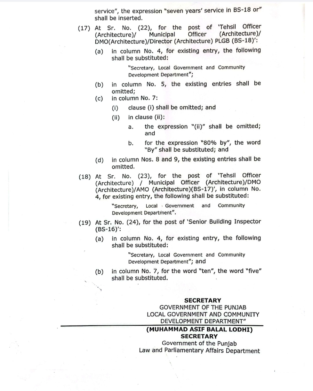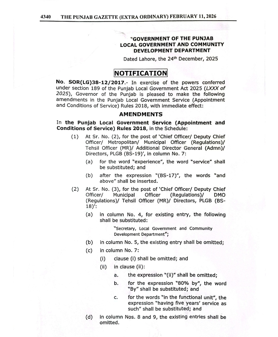 پنجاب لوکل گورنمنٹ سروس( تقرری اور سروس کی شرائط)رولز 2018 میں ترامیم کا گزٹ نوٹیفکیشن محکمہ قانون اور محکمہ بلدیات پنجاب کے سیکرٹریز کے دستخطوں سے جاری کیا گیا ہے۔