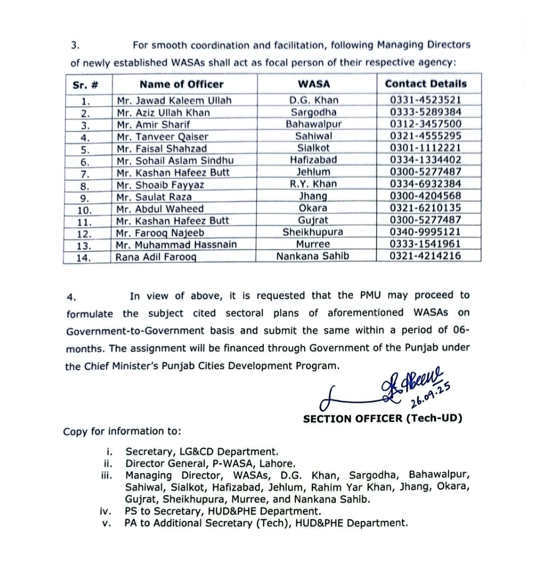 محکمہ ہاؤسنگ اور لوکل گورنمنٹ کے اشتراک سے 6 ماہ میں ماسٹر پلان مکمل کیے جائیں گے۔سیکرٹری ہاؤسنگ نورالامین مینگل کی ہدایت پر پراجیکٹ ڈائریکٹر لوکل گورنمنٹ کو خط ارسال کر دیا گیا ہے۔خط کے مطابق تمام اضلاع کی واسا ایجنسیوں کے ایم ڈی فوکل پرسن مقرر کئے گئے ہیں۔موجودہ واٹر سپلائی،سیوریج اور برساتی نالوں کے نظام کو اسیسمنٹ کی جائے گی۔مراسلہ کے مطابق حال اور مستقبل کے تناظر میں اربن پلاننگ کی جائے۔موسمیاتی اثرات کے پیش نظر پلاننگ فریم ورک تشکیل دیا جائے۔انفراسٹرکچر کی بہتری کے لیے مرحلہ وار فنانشل پلان تشکیل دی جائے گی۔واسا ایجنسیوں کی کپیسٹی بلڈنگ اور ادارہ جاتی مضبوطی پر کام کیا جائے۔نئے تشکیل کردہ واسا ایجنسیوں کو دن بدن مضبوط بنایا جا رہا ہے۔ترجمان محکمہ ہاؤسنگ کے مطابق متعلقہ اداروں کے اشتراک سے پلاننگ اور ڈویلپمنٹ میں مدد ملتی ہے۔وزیر اعلیٰ پنجاب کی ہدایات کے مطابق واسا ایجنسیوں کو مزید اضلاع تک لے جایا جائے گا۔ جن 14 اضلاع کا ماسٹر پلان تشکیل دینے کا فیصلہ کیا گیا ہے ان میں ڈی جی خان، سرگودھا، بہاولپور، ساہیوال، سیالکوٹ، حافظ آباد، جہلم،رحیم یار خان، جھنگ، اکاڑہ، گجرات، شیخوپورہ، مری، اور ننکانہ صاحب شامل ہیں۔