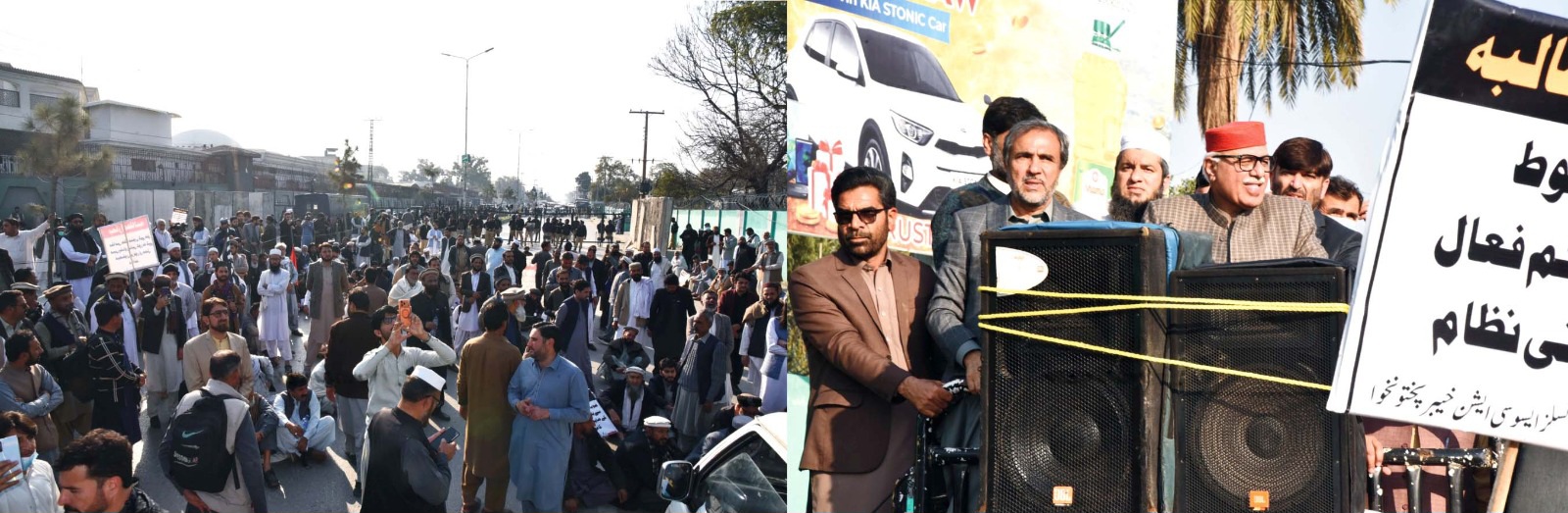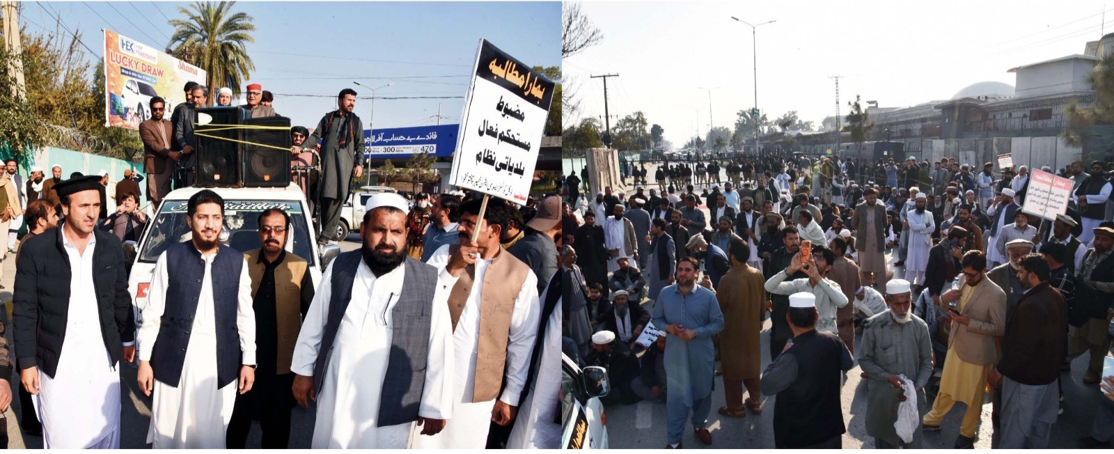خیبر پختونخوا کے بلدیاتی نمائندوں کا میئر پشاورحاجی زبیر علی اور میئر مردان حمایت اللہ مایار کی سربراہی میں خیبرپختونخوا اسمبلی کے سامنے دھرنا ‘ مطالبات کی منظوری تک دھرنا جاری رہیگا’ اس دوران اے این پی کے رہنما میاں ا فتخاربھی انکے ہمراہ تھے۔اس سلسلے میں مئیر پشاور حاجی زبیر علی، حمایت اللہ مایار صدر لوکل کونسلز ایسوسی ایشن خیبرپختونخوا مئیر مردان کی قیادت میں خیبر پختونخوا کے میئرز ‘ تحصیل چیئرمینز اور تمام صوبے کے بلدیاتی نمائندے جناح پارک میں اکھٹے ہوئے اس دوران جمعة المبارک کی نماز کے بعد تمام بلدیاتی نمائندے اکھٹے ہوئے اس دوران ترجمان ایسوسی ایشن عزیز اللہ مروت، سربراہ انتظامی کمیٹی ہارون صفت چئیرمین تحصیل لوکل گورنمنٹ پشتخرہ پشاور، غلام حقانی تحصیل چئیرمین رزڑ صوابی، عادل خان تحصیل چیئرمین لاہور صوابی، انتظار خلیل کوارڈنیٹر لوکل کونسلز ایسوسی ایشن خیبرپختونخوا، سید بادشاہ تحصیل چئیرمین خار باجوڑ، رفیع اللہ تحصیل چئیرمین دیر بالا، رحیم جدون تحصیل چئیرمین ٹوپی صوابی بلدیاتی نمائندوں ارباب وصال، ضیا الرحمن، نور غلام، میاں محفوظ الرحمن، طارق باچا، فرہاد مروت، نیک محمد، زیشان غزنی خیل سمت صوبہ بھر سے ممبران ایسوسی ایشن نے شرکت کرتے ہوئے