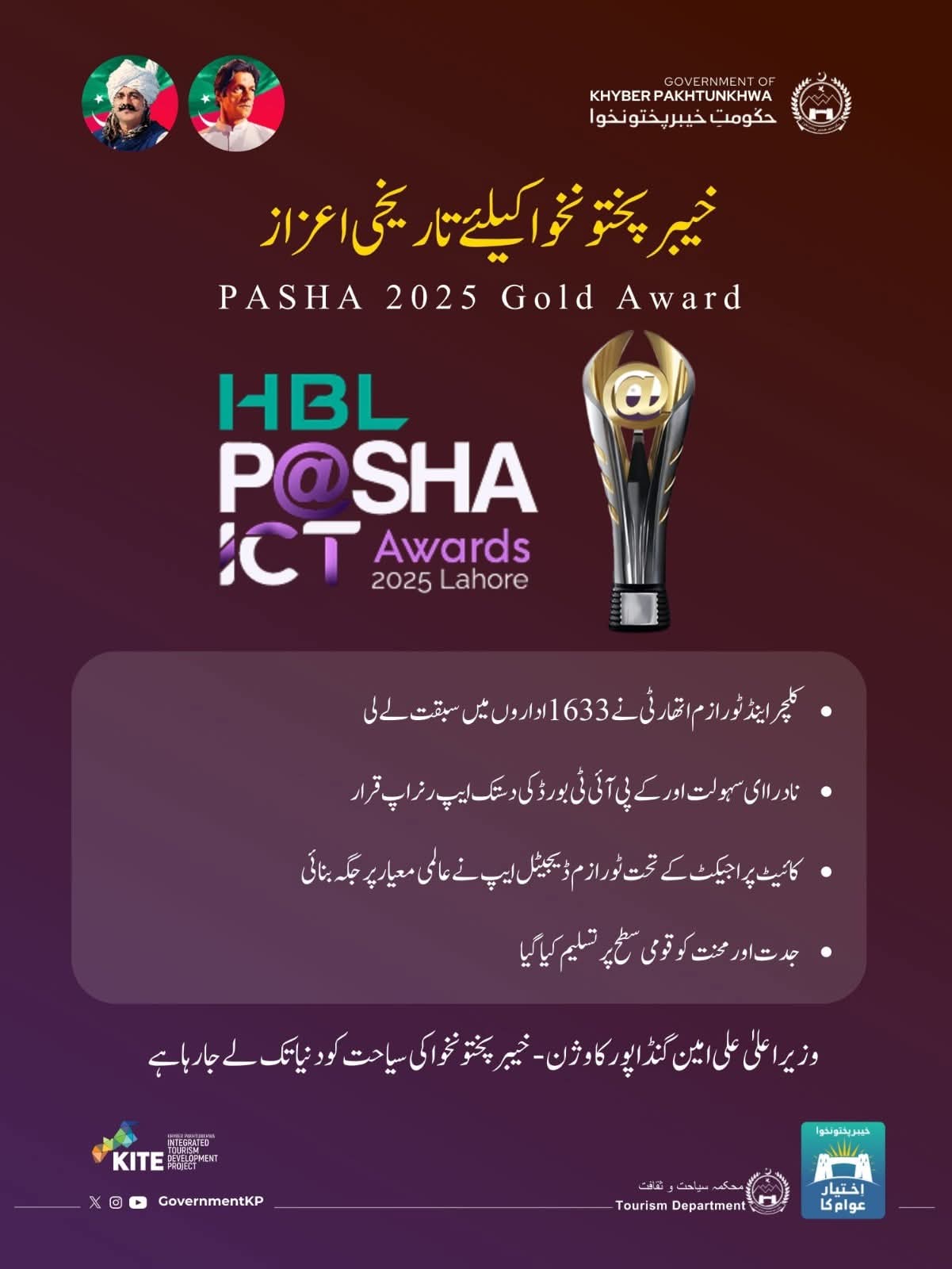 نادرا ای سہولت اور خیبر پختونخوا انفارمیشن تیکنالوجی بورڈ کی دستک ایپ رنر اپ قرار پائیں، جبکہ کائیٹ پراجیکٹ کے تحت تیار کردہ ٹورازم ڈیجیٹل ایپ نے قومی سطح پر خیبرپختونخوا کا نام مزید روشن کیا۔ترجمان خیبرپختونخوا حکومت کے مطابق یہ سنگ میل عمران خان کے ویژن اور وزیراعلیٰ علی امین گنڈا پور کی قیادت میں محکمہ سیاحت کی جدت و محنت کا واضح اعتراف ہے۔