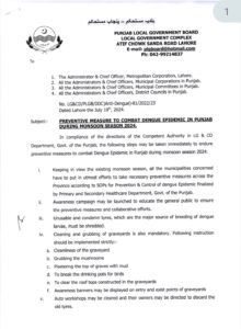 ایل جی اور سی ڈی ڈیپارٹمنٹ میں مجاز اتھارٹی کی ہدایات کی تعمیل میں، حکومت۔ پنجاب کے مون سون سیزن 2024 کے دوران پنجاب میں ڈینگی کی وبا سے نمٹنے کے لیے احتیاطی تدابیر کو برداشت کرنے کے لیے فوری طور پر درج ذیل اقدامات کیے جا سکتے ہیں۔