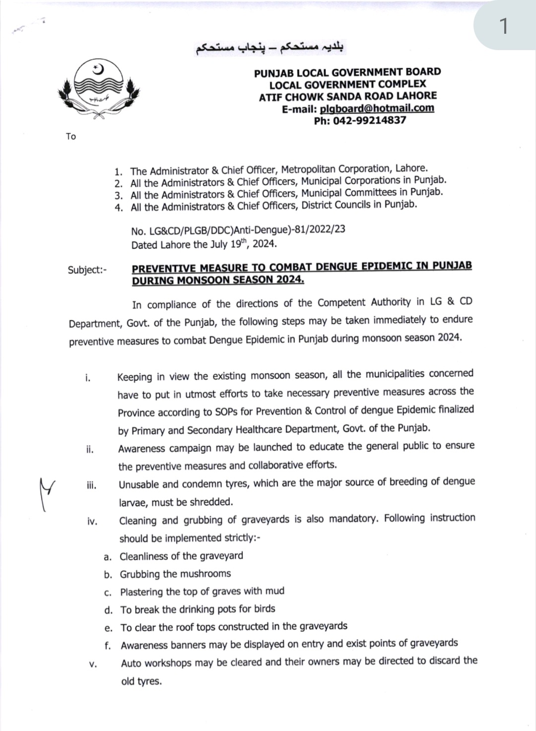 X. چیئر کی طرف سے یہ بھی ہدایت کی گئی کہ تمام دفتری احاطے بشمول چھت کی چوٹیوں کی ہاؤس کیپنگ کو یقینی بنایا جائے اور ہر دفتر کے متعلقہ سربراہ کی طرف سے یہ سرٹیفکیٹ جاری کیا جائے کہ پوری عمارت کو صاف کر دیا گیا ہے اور لاروا کی افزائش کی کوئی جگہ نہیں ہے۔ . یہ سرٹیفکیٹ تصویروں کے ساتھ plgbaord@hotmail.com پر ای میل کے ذریعے بھیجا جا سکتا ہے۔
