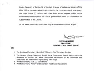 ایکٹ کے سیکشن 36 کی شق (i) کے تحت، ہنگامی حالات میں متعلقہ حکام کی مدد کرنا چیف آفیسر کے فرائض اور اختیارات میں سے ایک ہے۔ اور شق (k) کے تحت ایسے دیگر فرائض انجام دے گا جو اسے حکومت/ سیکرٹری/ مقامی حکومت/ کونسل کے سربراہ یا کونسل کی کمیٹی یا ذیلی کمیٹی کے ذریعے تفویض کیے گئے ہیں۔