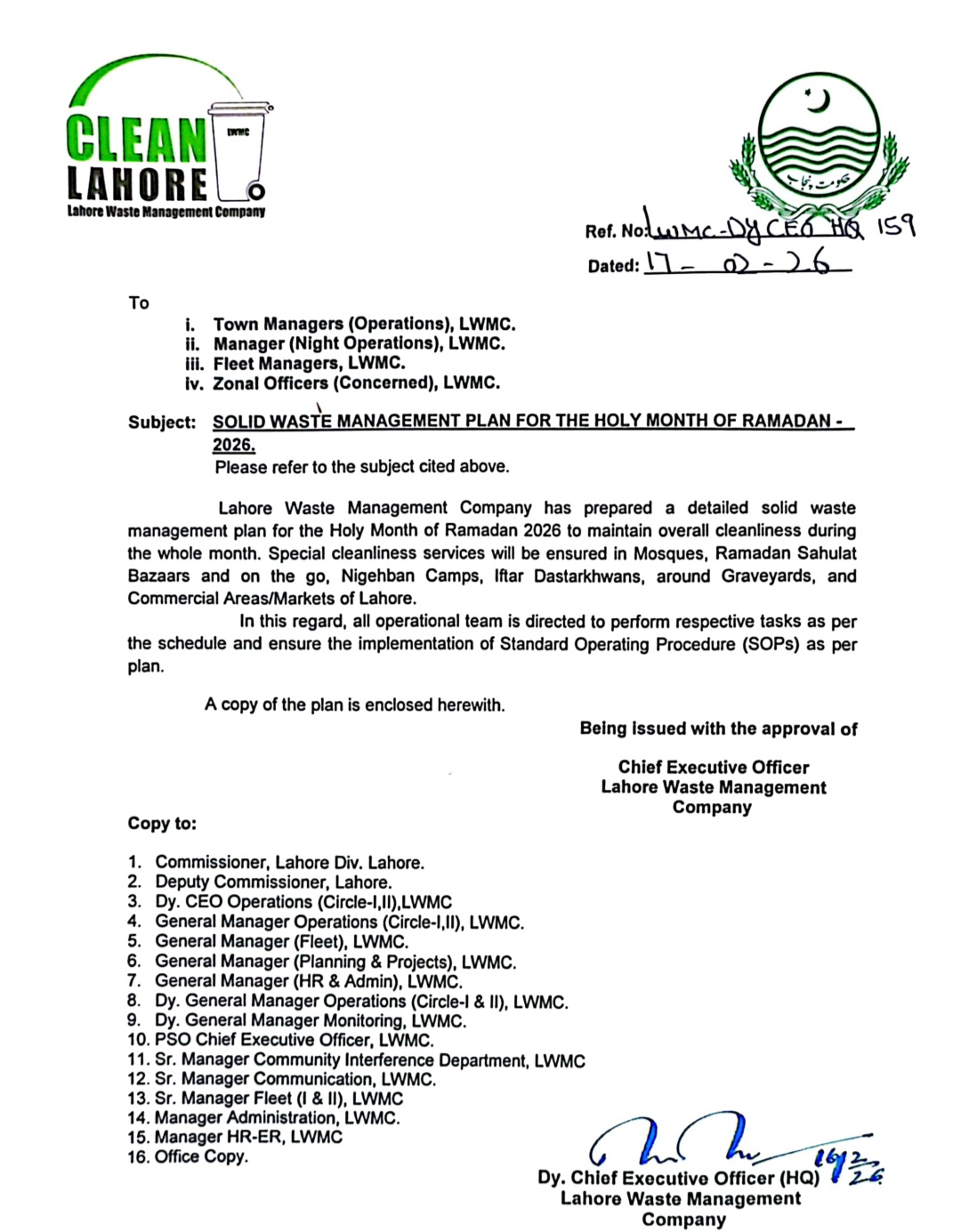 وزیرِ اعلٰی پنجاب مریم نواز شریف کے ویژن ستھرا پنجاب کے تحت ایل ڈبلیو ایم سی نے شہریوں کو صاف ستھرا ماحول فراہم کرنے کے لیے رمضان صفائی پلان جاری کر دیا ہے۔رمضان المبارک کے دوران شہر کے تمام ٹاؤنز میں تراویح کے مقامات، جامع مساجد اور ممکنہ راستوں پر خصوصی صفائی ٹیمیں تعینات کر دی گئی ہیں۔ایل ڈبلیو ایم سی آپریشن ٹیموں کو 1500سے زائد مساجد کی صفائی اور دھلائی کا ہدف دیا گیا ہے جبکہ روزانہ کی بنیاد پر 160 مساجدکی واشنگ یقینی بنائی جائے گی۔ضلعی انتظامیہ کی جانب سے قائم کیے جانے والے 23 رمضان بازاروں میں خصوصی صفائی عملہ تعینات کر دیا گیا ہے۔ رمضان کے موقع پر لگائے گئے ماڈل اور سہولت بازاروں میں ایل ڈبلیو ایم سی کے 156 ورکرز دو شفٹوں میں ڈیوٹی پر موجود ہیں۔ رمضان بازاروں کے اطراف اضافی ویسٹ کنٹینرز اور بنز نصب کر دیے گئے ہیں۔شہر میں موجود 250 چھوٹے بڑے قبرستانوں میں بھی روزانہ کی بنیاد پر صفائی کا عمل جاری ہے۔ ایل ڈبلیو ایم سی کے 21 واشر رکشے اور 210 ورکرزشہر میں سجنے والے 21 بڑے افطار دستر خوانوں کی صفائی ستھرائی یقینی بنائیں گے۔ شہریوں کی سہولت کے لیے قائم رمضان نگہبان بازاروں میں بھی صفائی عملہ تعینات کر دیا گیا ہے۔مزید برآں سی ای او ایل ڈبلیو ایم سی بابر صاحب دین نے رمضان بازاروں سے موصول ہونے والی شکایات کو فوری طور پر حل کرنے کے احکامات بھی جاری کر دیئے گئے ہیں۔ شہری کسی بھی شکایت کی صورت میں ایل ڈبلیو ایم سی کی ہیلپ لائن1139 پر رابطہ کر سکتے ہیں یا سوشل میڈیا کا استعمال بھی کر سکتے ہیں۔