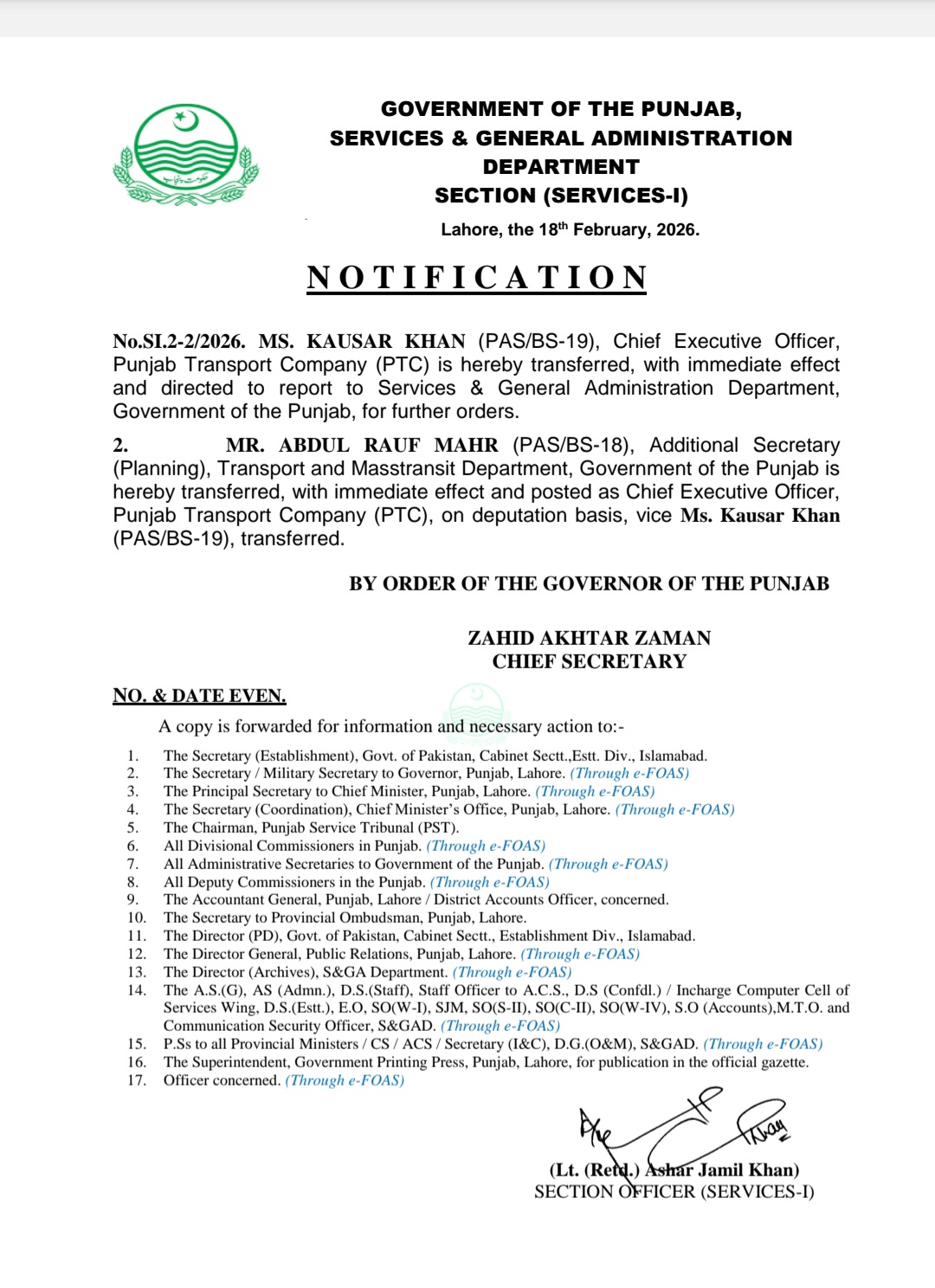 جبکہ عبدالرؤف مہر ایڈیشنل سیکرٹری پلاننگ ٹرانسپورٹ اینڈ ماس ٹرانزٹ تبدیل کر کے چیف ایگزیکٹو آفیسر پنجاب ٹرانسپورٹ کمپنی تعینات کیا گیا ہے۔ایم ڈی چولستان ڈویلپمنٹ اتھارٹی طارق محمود بخاری کو تبدیل کر کے او ایس ڈی بنا دیا گیا ہے انھیں ایس اینڈ جی اے ڈی میں رپورٹ کرنے کی ہدایت کی گئی ہے اور کمشنر بہاولپور ڈویژن مسرت جبین کو ایم ڈی چولستان ڈویلپمنٹ اتھارٹی کے عہدہ کا اضافی چارج دے دیا گیا ہے۔