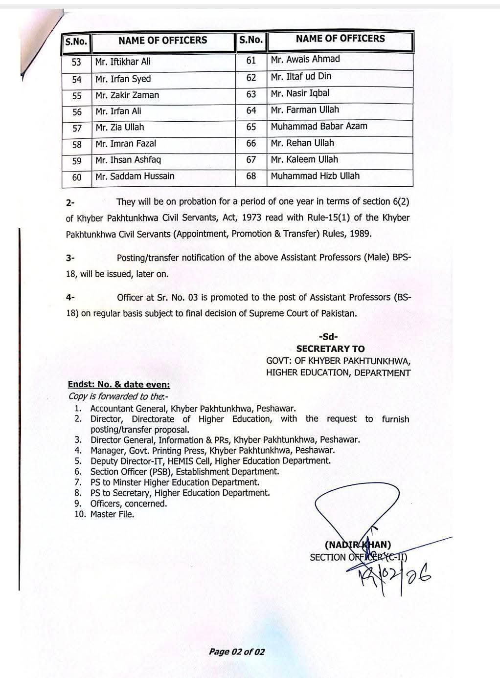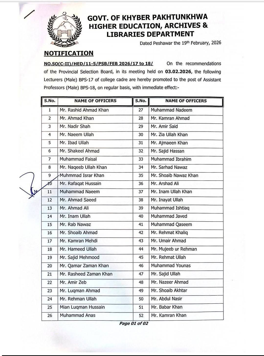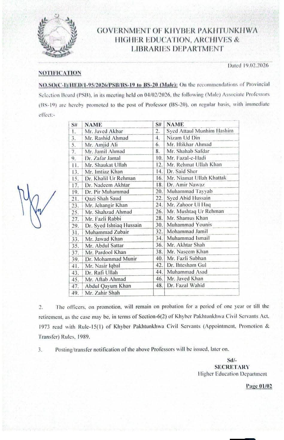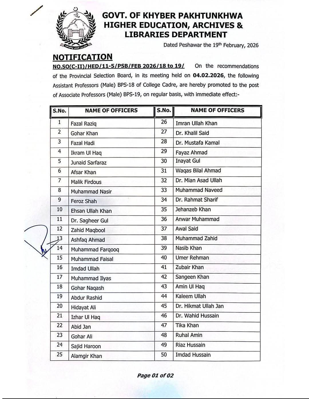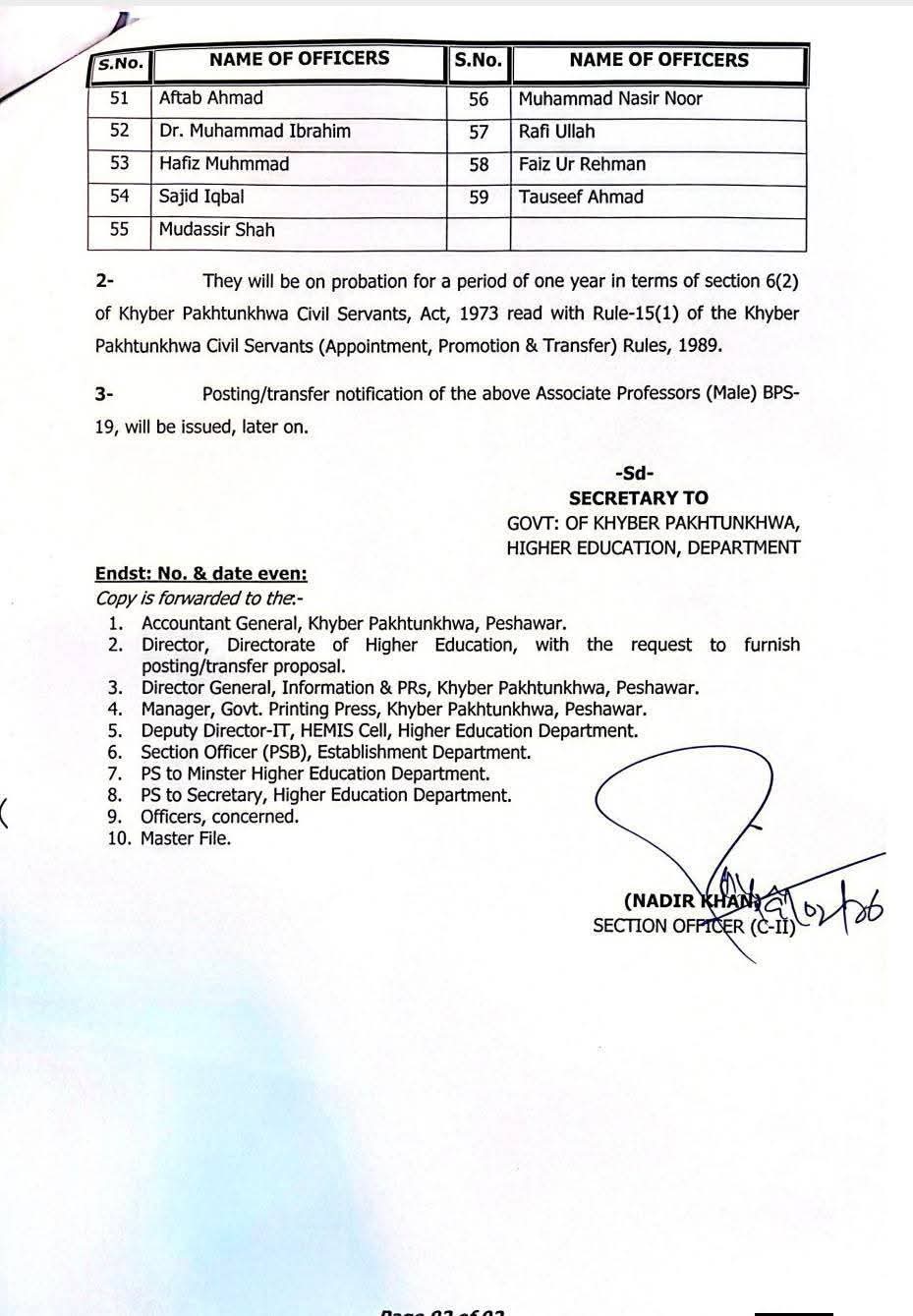 محکمہ تعلیم کے ہائر ایجوکیشن کی طرف سے 49 ایسوسی ایٹ پروفیسرز کو سکیل 19 سے سکیل 20 میں ترقی ہانے والے پروفیسرز کو مبارکباد دیتے ہوئے کہا کہ تمام ترقی پانے والے پروفیسرز احتشام گل کیانی سمیت سے آئندہ بھی اپنی محنت اور قابلیت ہر مزید کامیابیاں حاصل کریں گے۔یاد رہے کہ صوبائی حکومت نے گریڈ 18 کے 59 اسسٹنٹ پروفیسرز کو سکیل 19 میں ایسوسی ایٹ پروفیسرز کی اسامیوں پر ترقی کے احکام جاری کئے ہیں جب کہ گریڈ 17 کے 68 لیکچررز کو سکیل 18 میں ترقی دے کر اسسٹنٹ پروفیسرز تعینات کرنے کا نوٹیفیکیشن جاری کیا ھے۔ لوکل گورنمنٹ ایمپلائز رجسٹرڈ خیبرپختونخوا کے عہدیداران نے تمام ترقی پانے والے پروفیسرز، ایسوسی ایٹ پروفیسرز اور اسسٹنٹ پروفیسرز کو ان کی ترقی و تعیناتی پر مبارکباد دیتے ہوئے اس توقع کا اظہار کیا ہے کہ ترقی پانے والے افسران تعلیمی میدان میں بچوں کو تعلیم دینے میں اپنا بھر پور کردار ادا کریں گے۔
