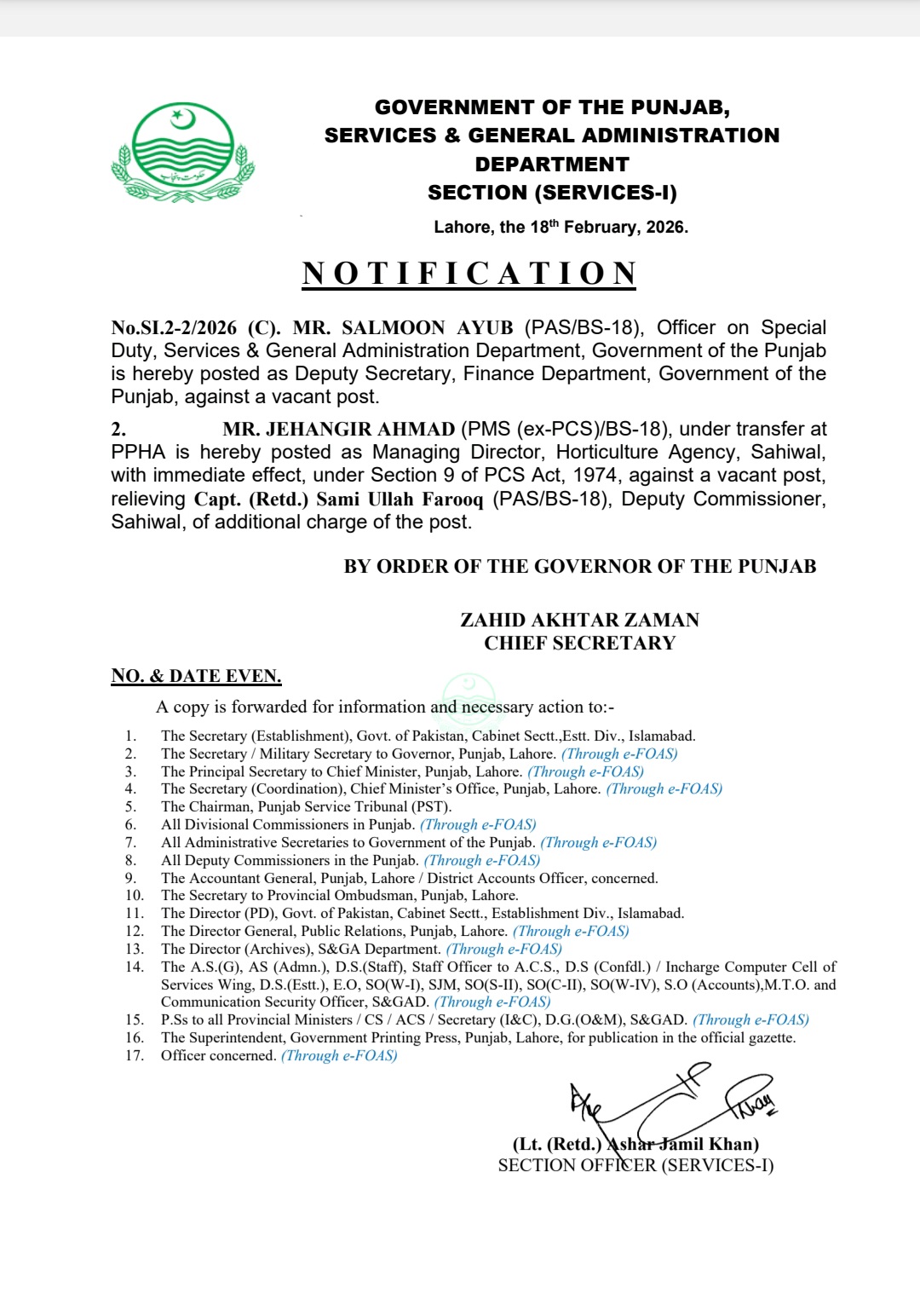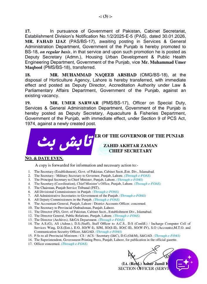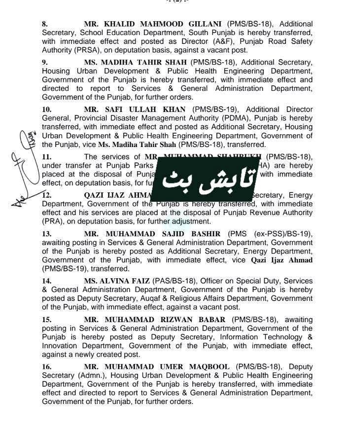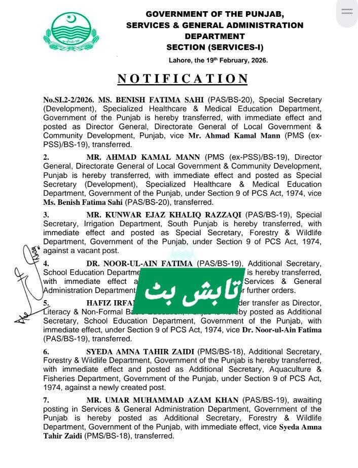 کنور اعجاز خالق رزاقی کو اسپیشل سیکرٹری جنگلات و وائلڈ لائف تعینات کر دیا گیا ہے۔ڈاکٹر نورالعین فاطمہ کو ایس اینڈ جی اے ڈی رپورٹ کرنے کی ہدایت کی گئی ہے۔حافظ عرفان حمید ایڈیشنل سیکرٹری اسکول ایجوکیشن مقرر کیا گیا ہے۔سیدہ آمنہ طاہر زیدی کو ایڈیشنل سیکرٹری ایکواکلچر و فشریز تعینات کردیا گیا ہے۔عمر محمد اعظم خان ایڈیشنل سیکرٹری جنگلات مقرر کیا گیا ہے۔خالد محمود گیلانی پی آر ایس اے میں ڈائریکٹر تعینات کیا گیا ہے۔مدیحہ طاہر شاہ کو ایس اینڈ جی اے ڈی رپورٹ کرنے کی ہدایت کی گئی ہے۔صفی اللہ خان ایڈیشنل سیکرٹری ہاؤسنگ تعینات کیا گیا ہے۔محمد شاہ رخ کی خدمات پنجاب ریونیو اتھارٹی کے سپرد کر دی گئی ہیں۔قاضی اعجاز احمد کی خدمات بھی پنجاب ریونیو اتھارٹی کے حوالے کی گئی ہیں۔محمد ساجد بشیر ایڈیشنل سیکرٹری انرجی تعینات کیا گیا ہے۔الوینا فیض ڈپٹی سیکرٹری اوقاف مقرر کیا گیا ہے۔محمد رضوان بابر ڈپٹی سیکرٹری آئی ٹی اینڈ انوویشن تعینات کیا گیا ہے۔محمد عمر مقبول کو ایس اینڈ جی اے ڈی رپورٹ کرنے کی ہدایت کی گئی ہے۔فہد اعجاز کو ڈپٹی سیکرٹری ہاؤسنگ تعینات کیا گیا ہے۔محمد نقیب ارشد کوڈپٹی ڈائریکٹر ایکریڈیٹیشن اتھارٹی تعینات کیا گیا ہے۔عمر سرور ڈپٹی سیکرٹری ایکواکلچر و فشریز مقرر کیا گیا ہے۔ سلمون ایوب ڈپٹی سیکرٹری محکمہ خزانہ تعینات کر دیا گیا ہے۔جہانگیر احمد کو ایم ڈی پارکس اینڈ ہارٹیکلچر اتھارٹی ساہیوال تعینات کیا گیا ہے۔ڈپٹی کمشنر ساہیوال کیپٹن(ر) سمیع اللہ فاروق سے ایم ڈی پی ایچ اے ساہیوال کا اضافی چارج واپس لے لیا گیا ہے۔