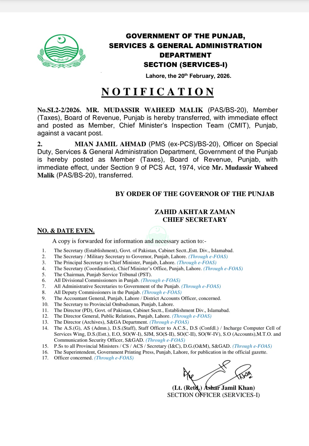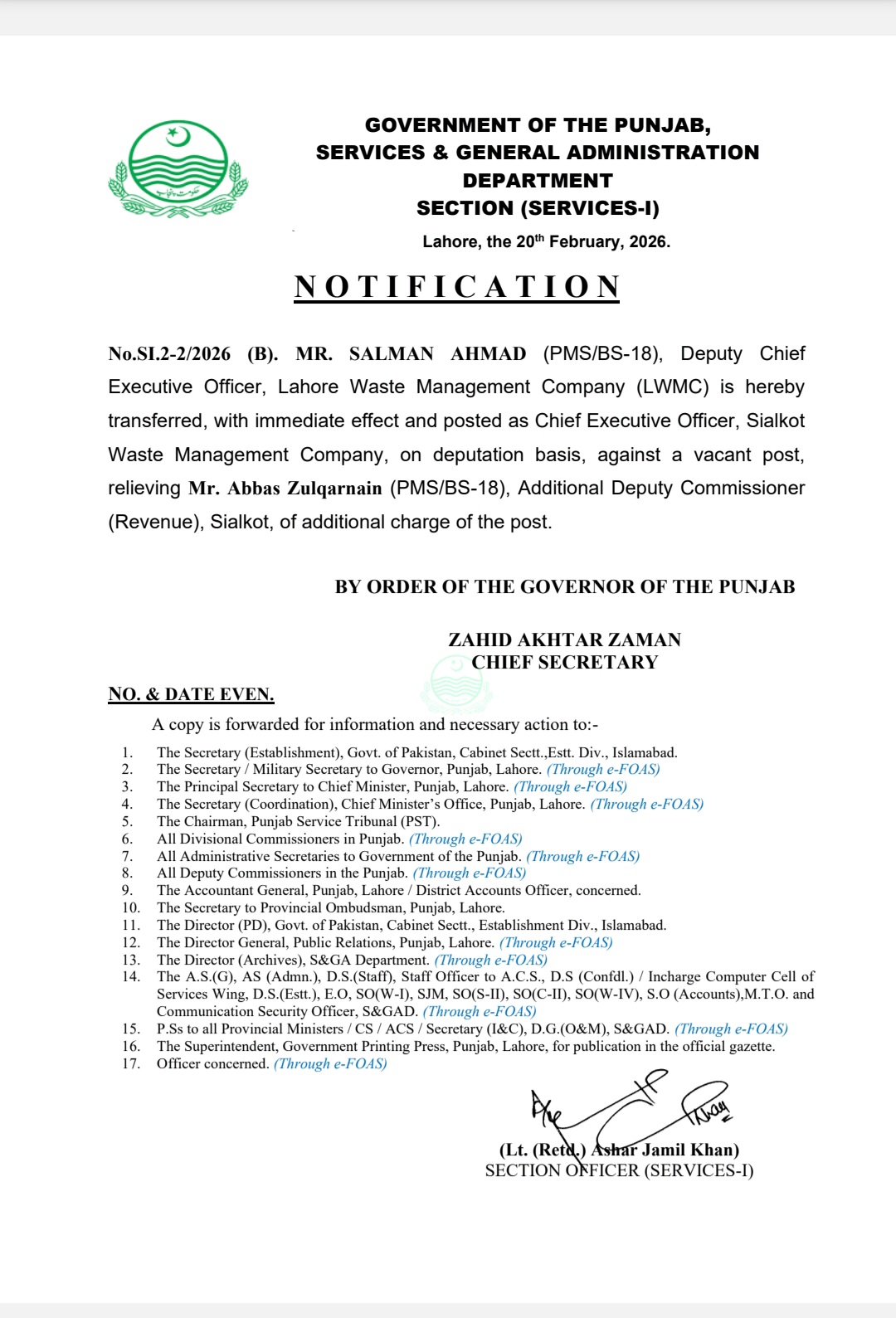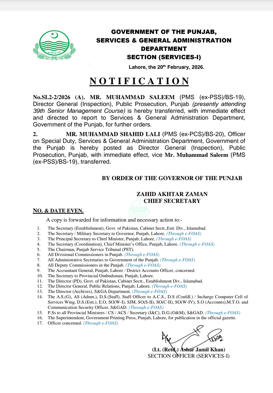 ڈی جی انسپیکشن پبلیک پراسیکیوشن محمد سلیم ساگر کو تبدیل کر کےاو ایس ڈی بنا دیا گیا ہے انھیں ایس اینڈ جی اے ڈی میں رپورٹ کرنے کی ہدایت کی گئی ہے اور تقرری کے منتظر محمد شاہد لالی کو ڈی جی انسپیکشن پبلیک پراسیکیوشن پنجاب تعینات کیا گیا ہے۔ ڈپٹی چیف ایگزیکٹو آفیسر لاہور ویسٹ مینجمنٹ کمپنی سلمان احمد کو تبدیل کر کے چیف ایگزیکٹو آفیسر سیالکوٹ ویسٹ مینجمنٹ کمپنی تعینات کیا گیا ہے جبکہ ایڈیشنل ڈپٹی کمسنر ریونیو سیالکوٹ عباس ذوالقرنین سے چیف ایگزیکٹو آفیسر سیالکوٹ ویسٹ مینجمنٹ کمپنی کے عہدہ کا اضافی چارج واپس لے لیا گیا ہے۔
