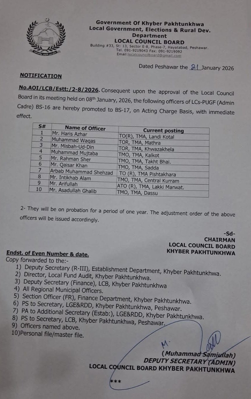 حکومت خیبر پختونخواہ لوکل گورنمنٹ، الیکشن اور دیہی ترقی۔ محکمہ لوکل کونسل بورڈ نے ایڈمن ونگ کے 10 افسران کو گریڈ 16 سے 17 میں ترقی دے دی ہے ۔اس سلسلہ میں جاری نوٹیفکیشن کے مطابق جن افسران کو ترقیاں دی گئی ہیں ان میں حارث اظہر ٹی او (ر)، ٹی ایم اے، لنڈی کوتل، محمد وقاص ٹی او آر، ٹی ایم اے، متھرا،مصباح الدین ٹی او آر، ٹی ایم اے، خوازہ خیلہ، محمد مجتبیٰ ٹی ایم او، ٹی ایم اے، کلکوٹ، رحمان شیر ٹی ایم او، ٹی ایم اے، تخت بھائی، قیصر خان ٹی ایم او، ٹی ایم اے، صدہ، ارباب محمد شہزاد ٹی او (ر)، ٹی ایم اے پشتخرہ،انتخاب عالم ٹی ایم او، ٹی ایم اے، سنٹرل کرم،عارف اللہ اے ٹی او (ر)، ٹی ایم اے، لکی مروت اوراسد اللہ غالب ٹی ایم او ٹی ایم اے داسو شامل ہیں۔