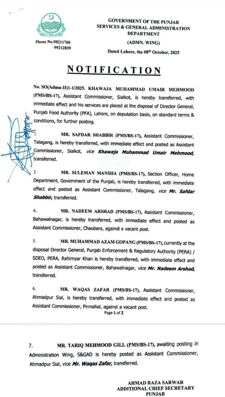 حکومت پنجاب نے سات اسسٹنٹ کمشنرز کے تقرر و تبادلے کے احکامات جاری کئے ہیں۔محکمہ سروسز کی جانب سے جاری نوٹیفکیشن کے مطابق خواجہ محمد عمیر محمود اسسٹنٹ کمشنر، سیالکوٹ کی خدمات ڈیپوٹیشن پرڈائریکٹر جنرل، پنجاب فوڈ اتھارٹی لاہور کے سپرد کر دی گئی ہیں۔صفدر شبیر اسسٹنٹ کمشنر تلہ گنگ کو اسسٹنٹ کمشنر سیالکوٹ تعینات کیا گیا ہے۔ سلیمان منشاء سیکشن آفیسر، ہوم ڈیپارٹمنٹ، حکومت پنجاب، کو اسسٹنٹ کمشنر، تلہ گنگ تعینات کیا گیا ہے۔ ندیم ارشد اسسٹنٹ کمشنر بہاولنگر کی اسسٹنٹ کمشنر چوبارہ تقرری کے احکامات جاری کئے گئے ہیں۔محمد اعظم گوپانگ جو ڈائریکٹر جنرل، پنجاب انفورسمنٹ اینڈ ریگولیٹری اتھارٹی کی ڈسپوزل پر ہیں کو اسسٹنٹ کمشنر بہاولنگر تعینات کیا گیا ہے۔وقاص ظفر اسسٹنٹ کمشنر، احمد پور سیال کو فوری طور پر تبدیل کر کے اسسٹنٹ کمشنر، پیرمحل کے عہدے پر تعینات کیا گیا ہے۔ تقرری کے منتظر طارق محمود گل کو اسسٹنٹ کمشنر احمد پور سیال تعینات کیا گیا ہے۔