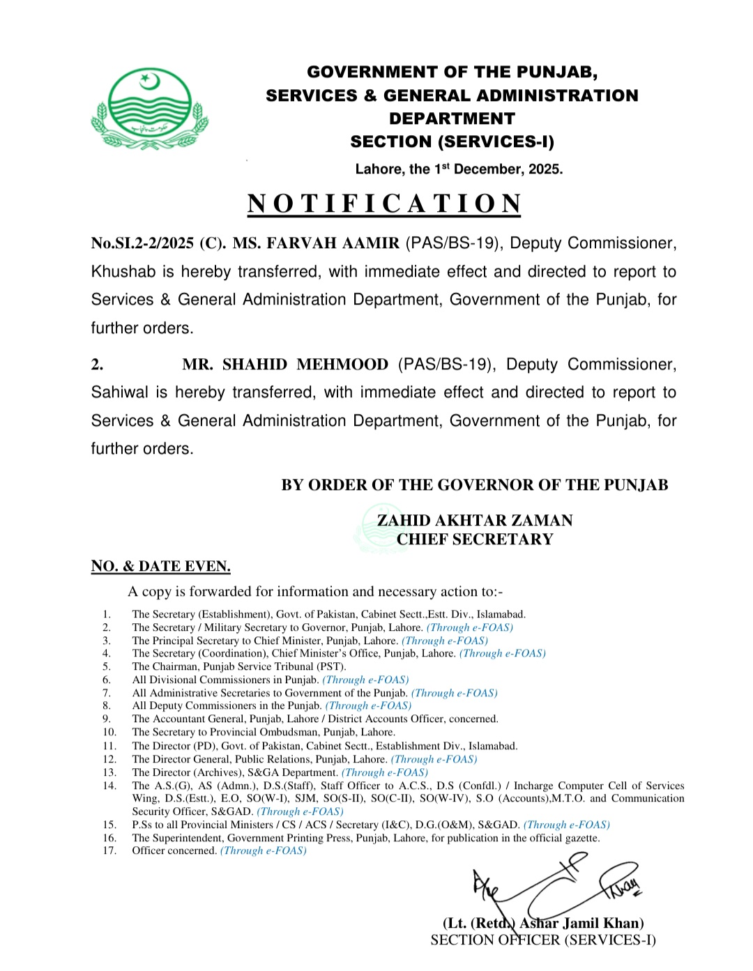 اسی طرح ڈپٹی کمشنر خوشاب فروا عامر۔ ڈپٹی کمشنر ساہیوال شاہد محمود اورایڈیشنل ڈپٹی کمشنر ریونیو مری عمر اویس کو تبدیل کر کے او ایس ڈی بنا دیا گیا ہے تینوں افسران کو محکمہ ایس اینڈ جی اے ڈی رپورٹ کرنے کی ہدایت کی گئی ہے۔