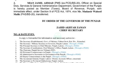 پنجاب تقرروتبادلے،مدثر وحید ملک ممبر وزیراعلٰی معائنہ ٹیم،محمد شاہد لالی ڈی جی انسپیکشن،سلمان احمد سی ای او سیالکوٹ ویسٹ مینجمنٹ کمپنی تعینات