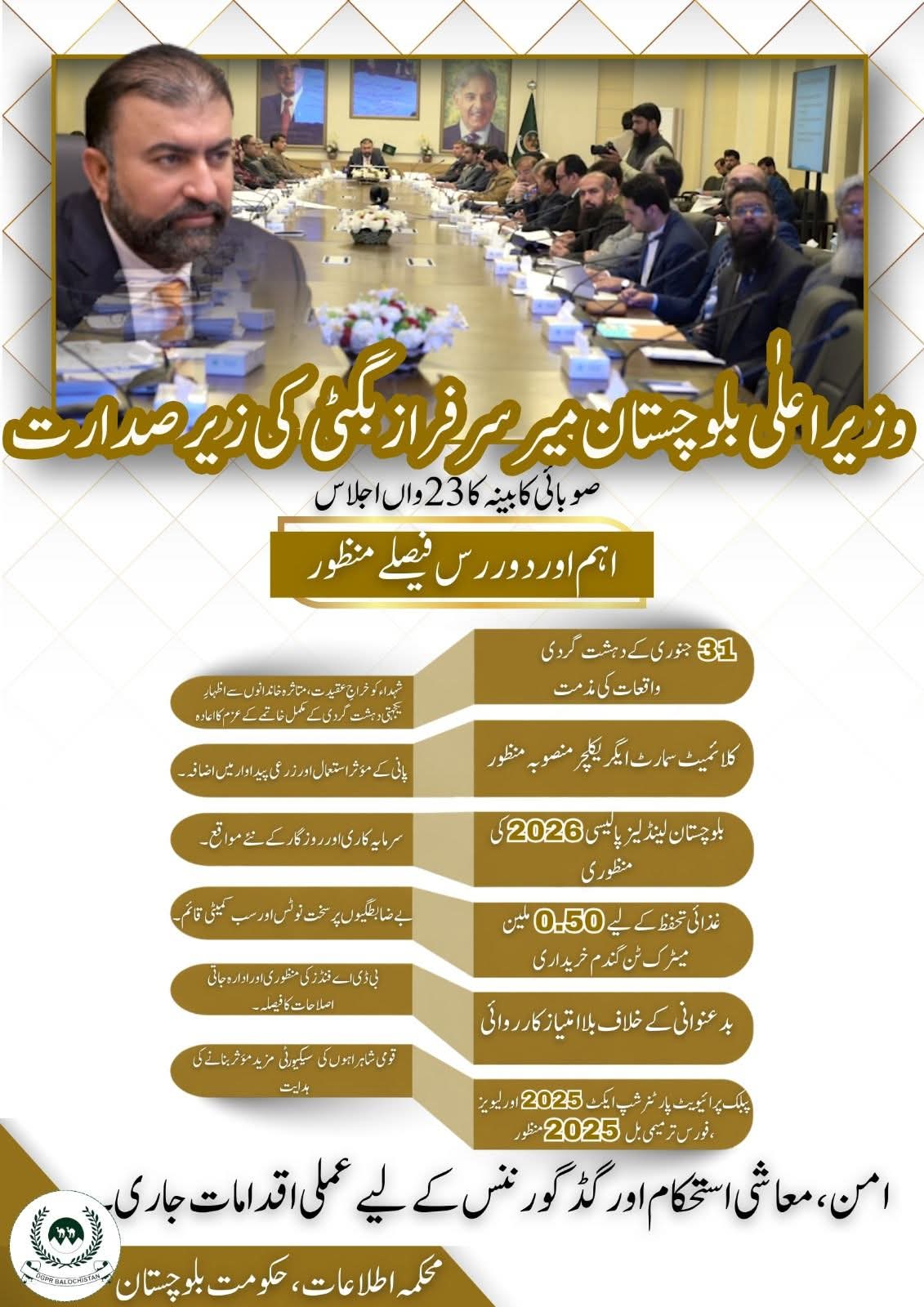 اجلاس میں اس عزم کا اعادہ کیا گیا کہ دہشت گردی کے ناسور کے مکمل خاتمے کے لیے حکومت اور سیکیورٹی فورسز متحد اور پُرعزم ہیں۔ حالیہ واقعات کے بعد بروقت اور مؤثر ردعمل پر سیکیورٹی اداروں کی کارکردگی کو سراہا گیا زرعی شعبے میں بہتری کے لیے کابینہ نے “واٹر کنزرویشن اینڈ پروڈکٹیویٹی انہانسمنٹ اِن بلوچستان تھرو کلائمیٹ اسمارٹ ایگریکلچر” منصوبے کی منظوری دی جو کورین ایگزم بینک کے قرض کے تحت شروع کیا جائے گا۔