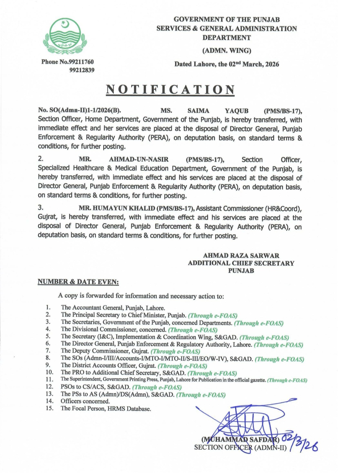 پنجاب حکومت نے 3 افسران کے تقرر و تبادلوں کے احکامات جاری کئے ہیں۔سیکشن ہوم ڈیپارٹمنٹ صائمہ یعقوب ۔سیکشن افسر اسپیشلائزڈ ہیلتھ کئیر اینڈ میڈیکل ایجوکیشن احمد الناصر اور اسسٹنٹ کمشنر ہیڈ کوارٹر گجرات ہمایوں خالد کو تبدیل کر کے تینوں افسران کی خدمات مزید تقرری کے لئے ڈی جی پیرا کے سپرد کردیں گئی ہیں اس ضمن میں باضابطہ نوٹیفکیشن جاری کر دیا گیا ہے۔