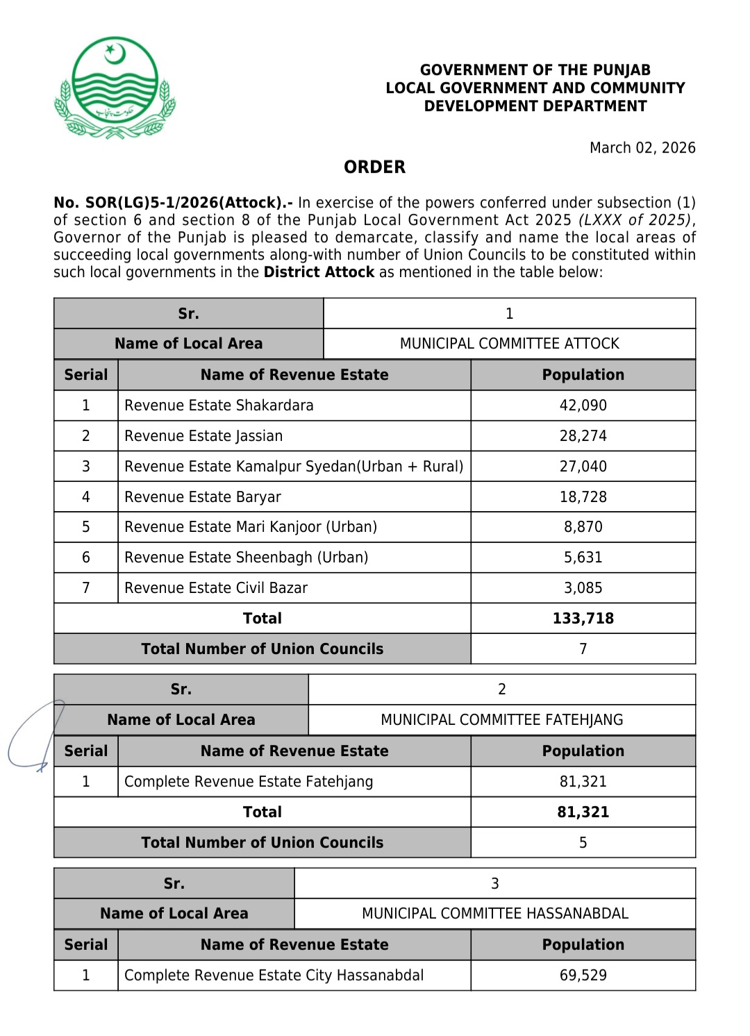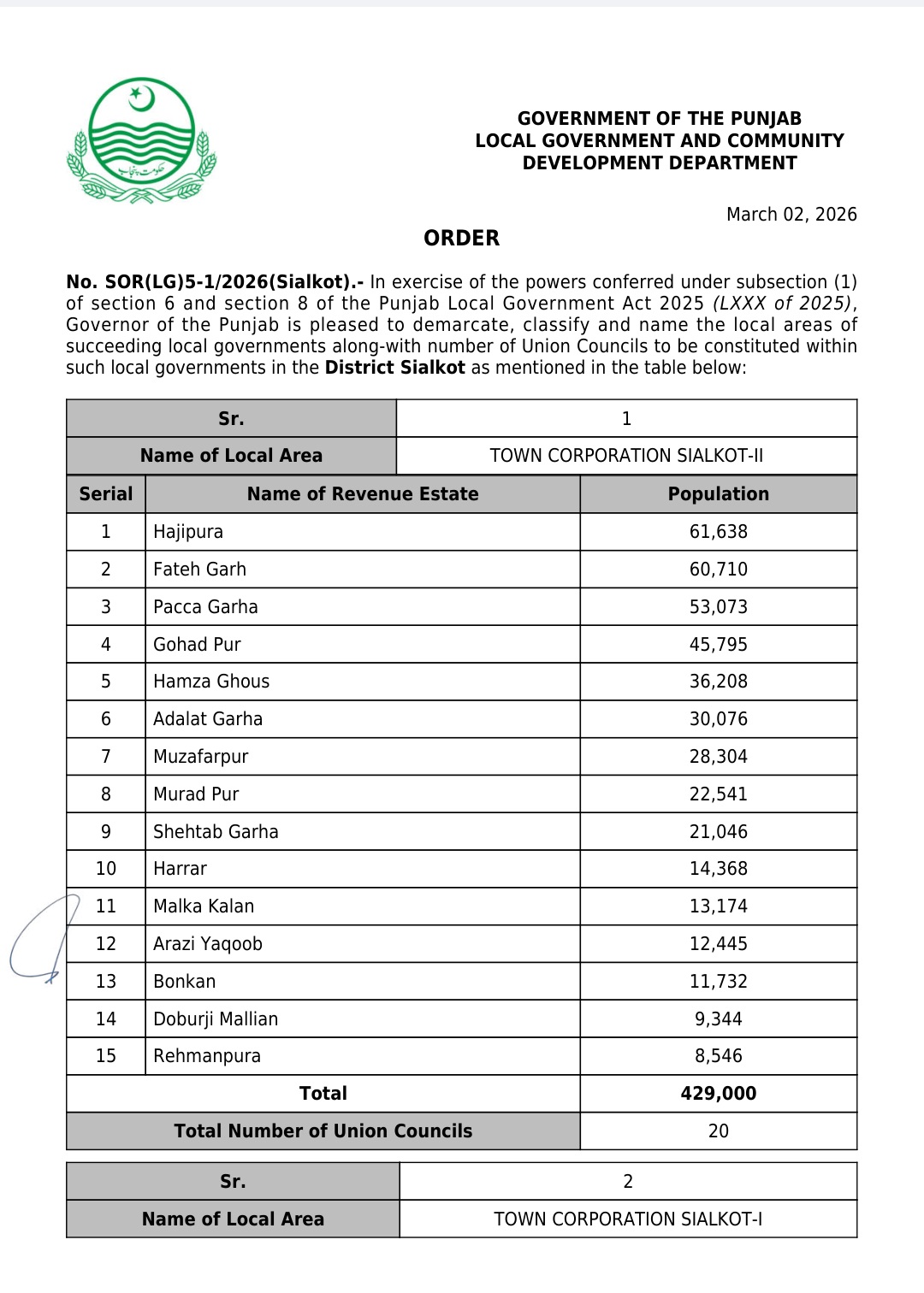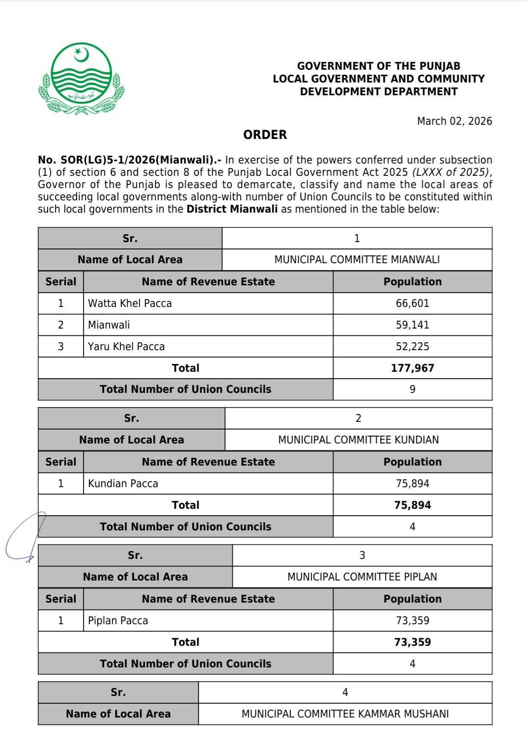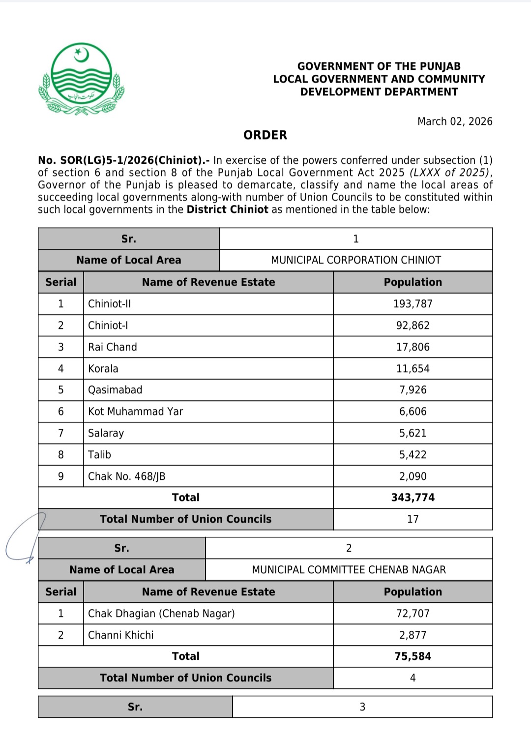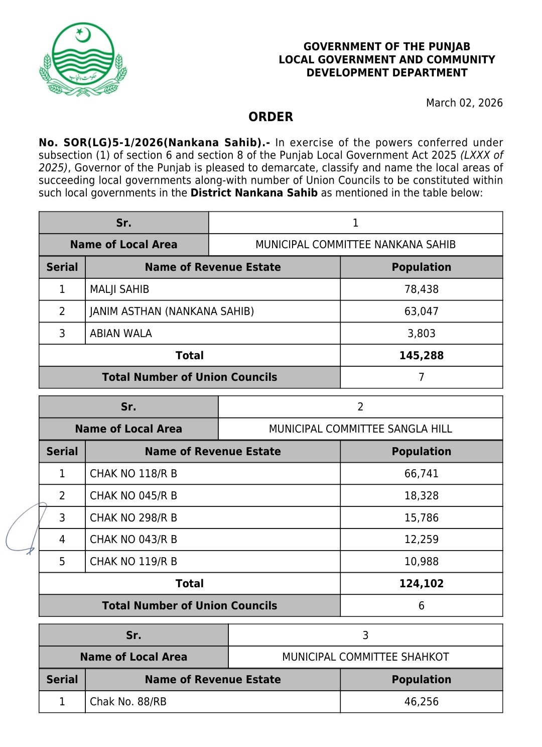 جن کی تفصیلات الیکشن کمیشن آف پاکستان کو بھی فراہم کر دی گئی ہے۔اعتراضات اور دیگر قانونی تقاضے پورے کرنے کے بعد گزٹ نوٹیفکیشن جاری کیا جائے گا۔جس کے بعد نئے بلدیاتی اداروں کی باقاعدہ تشکیل، اختیارات و اثاثہ جات کی منتقلی اور انھیں فعال بنانے کا عمل شروع کیا جائے گا۔پنجاب میں نئے بلدیاتی اداروں کی تعداد میں ریکارڈ اضافہ کیا گیا ہے۔