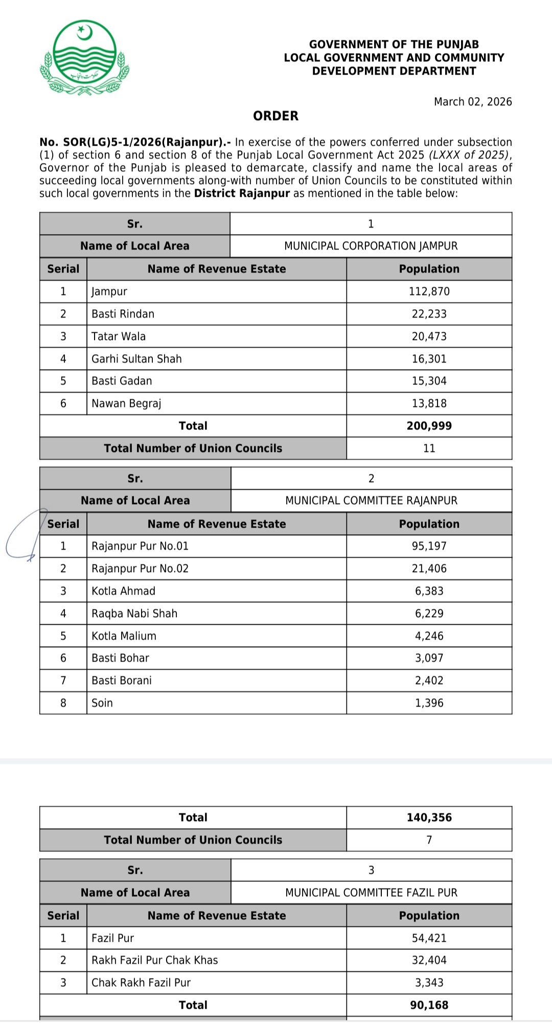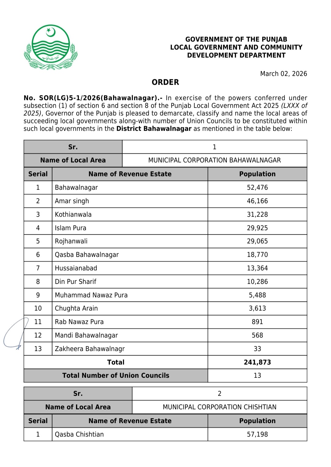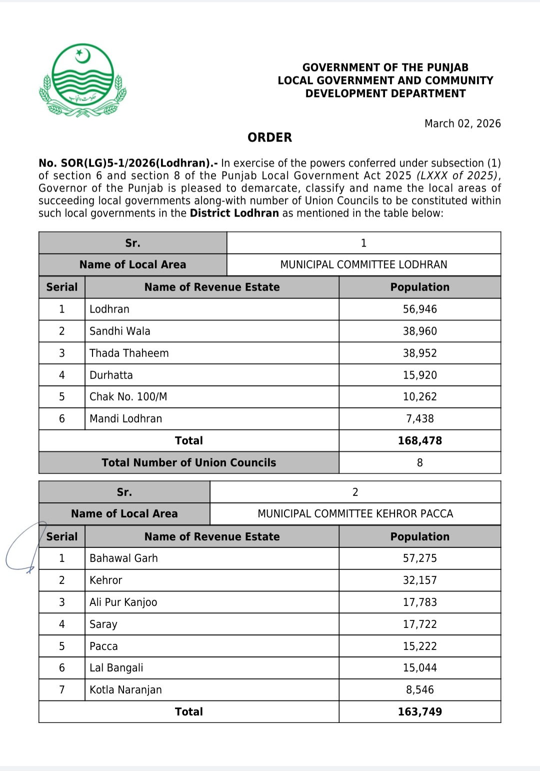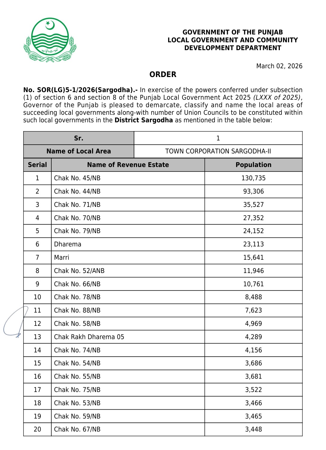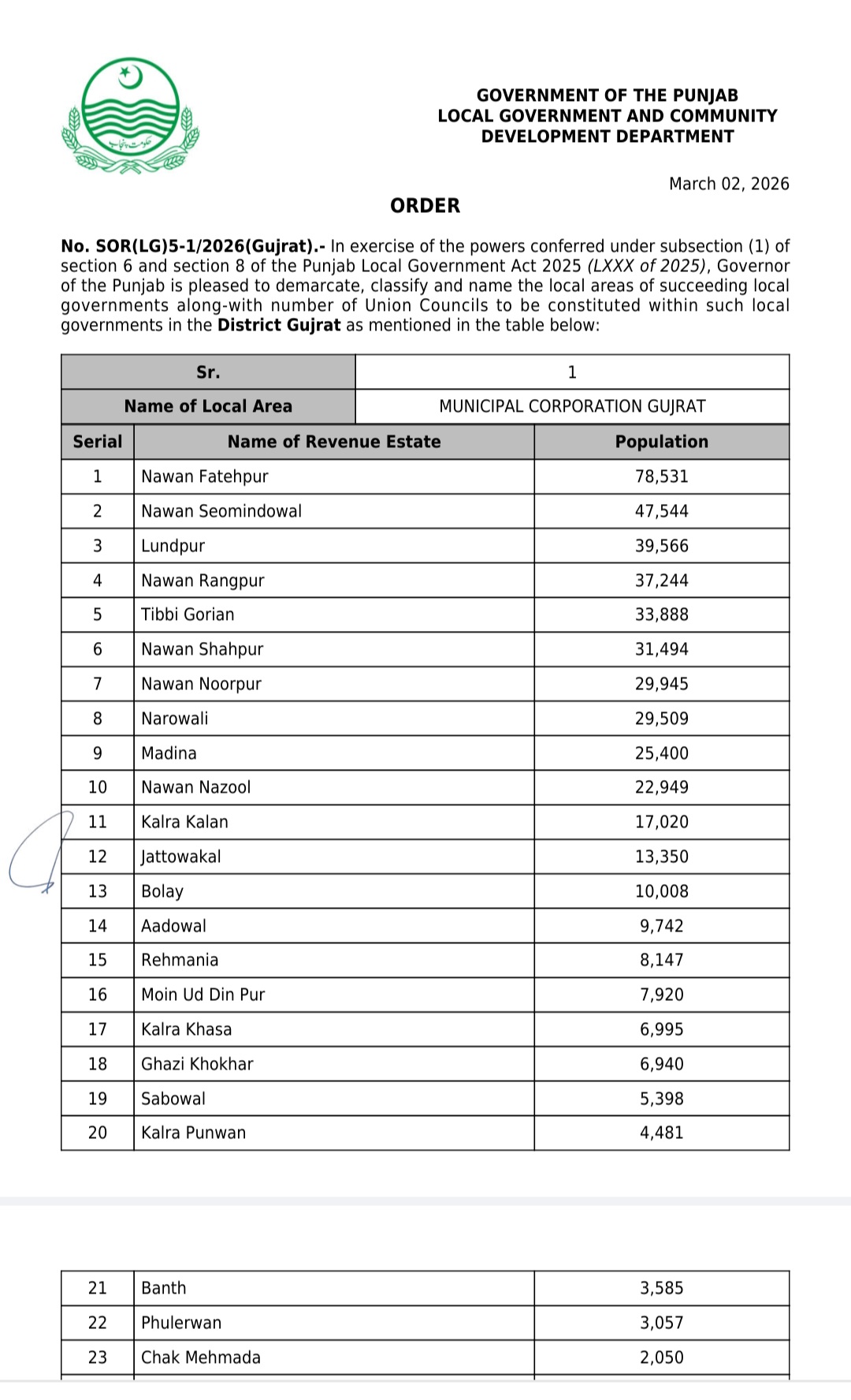 جن کی تفصیلات الیکشن کمیشن آف پاکستان کو بھی فراہم کر دی گئی ہے۔اعتراضات اور دیگر قانونی تقاضے پورے کرنے کے بعد گزٹ نوٹیفکیشن جاری کیا جائے گا۔جس کے بعد نئے بلدیاتی اداروں کی باقاعدہ تشکیل، اختیارات و اثاثہ جات کی منتقلی اور انھیں فعال بنانے کا عمل شروع کیا جائے گا۔پنجاب میں نئے بلدیاتی اداروں کی تعداد میں ریکارڈ اضافہ کیا گیا ہے۔