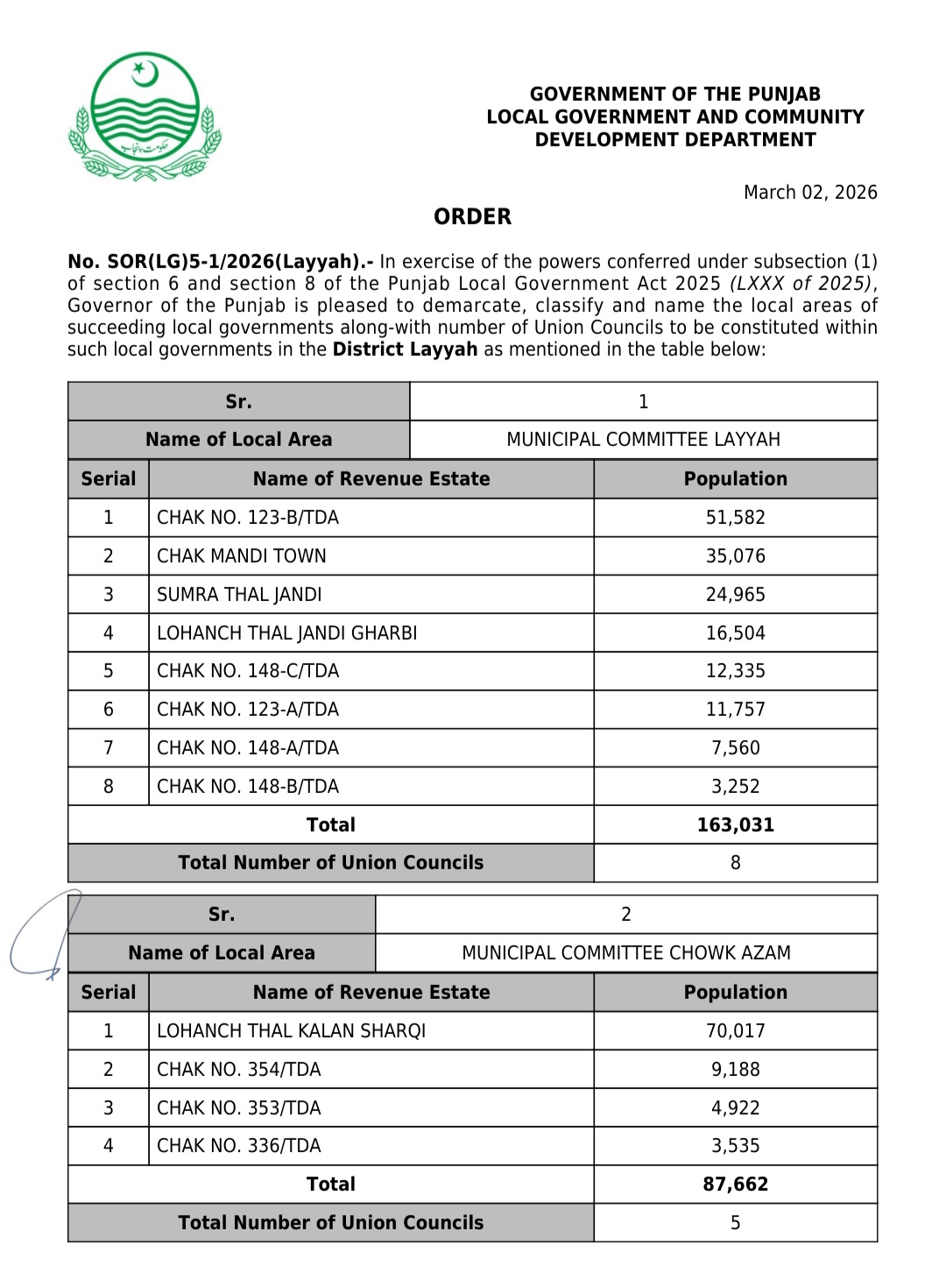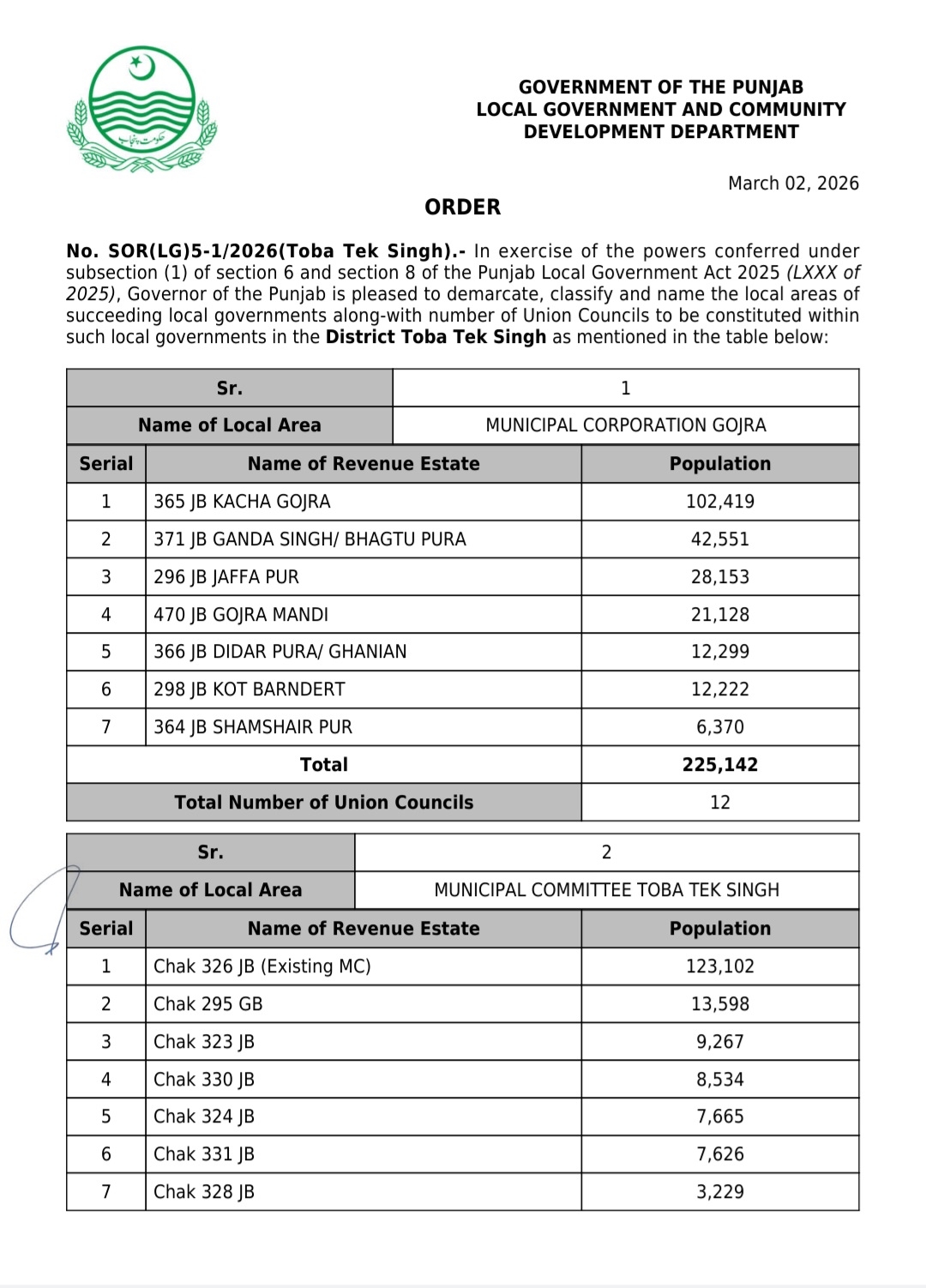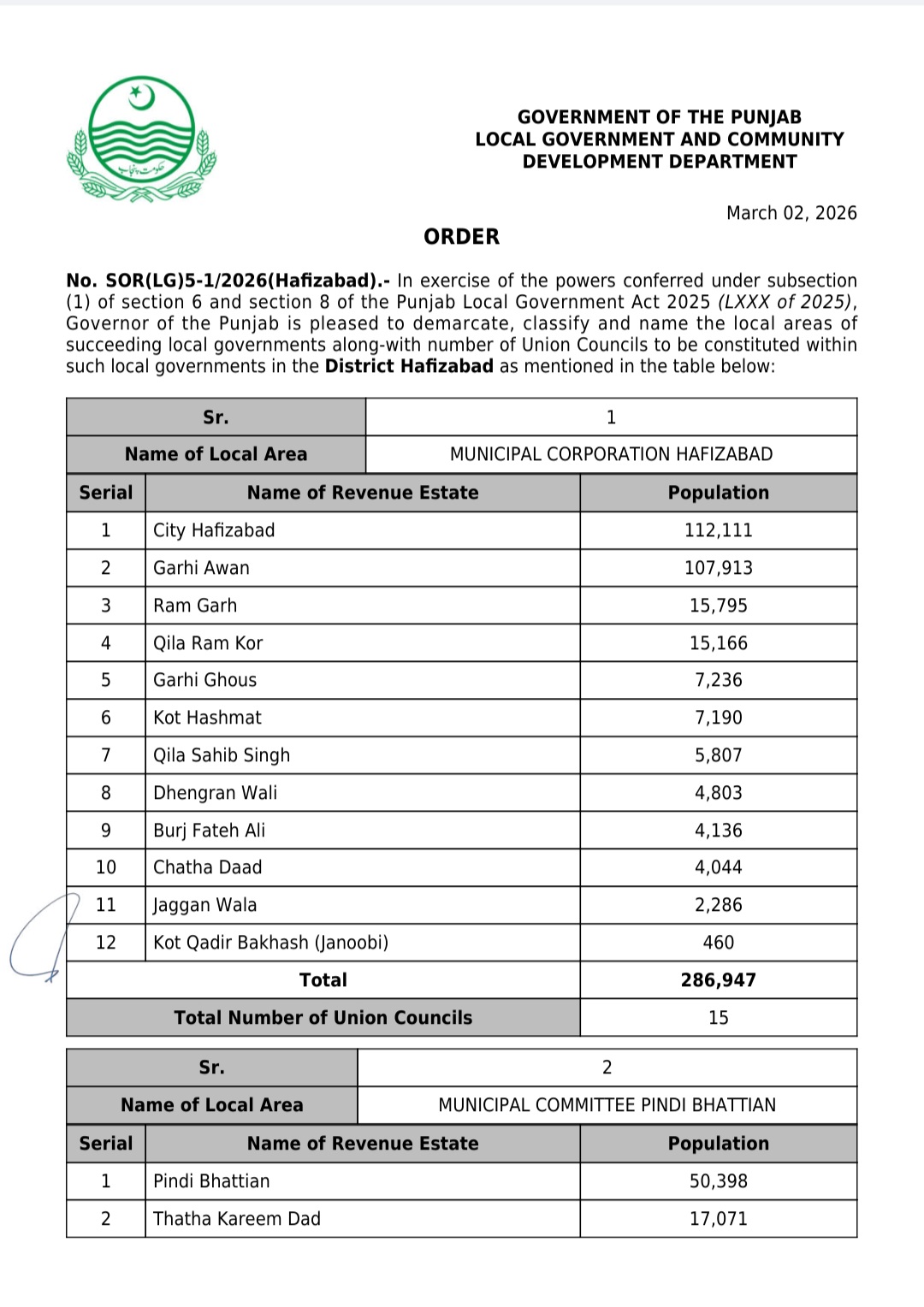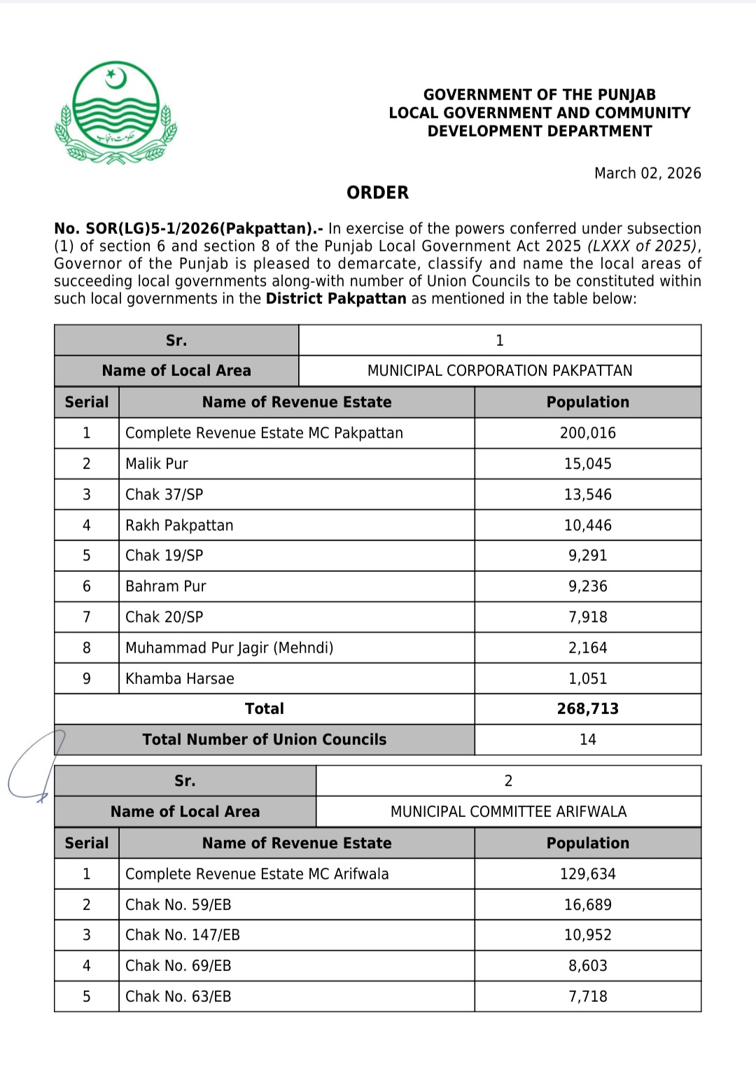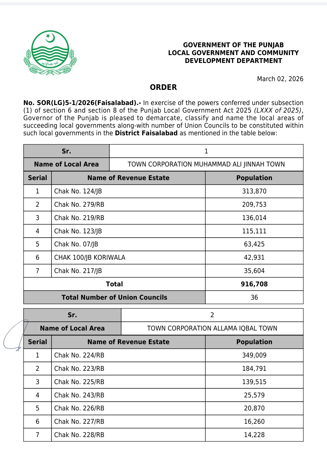پنجاب کے439بلدیاتی اداروں کی حد بندیوں اور تشکیل کے نوٹیفکیشنز جاری کر دیئے گئے ہیں۔محکمہ بلدیات پنجاب نے پنجاب لوکل گورنمنٹ ایکٹ 2025ء اور حلقہ بندیوں کے رولز کے تحت یونین کونسلوں کے بھی نوٹیفکیشنز جاری کئے ہیں
