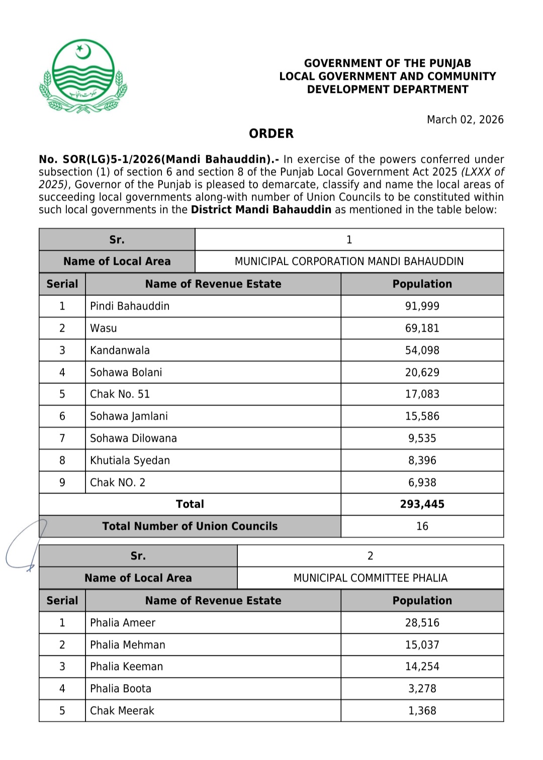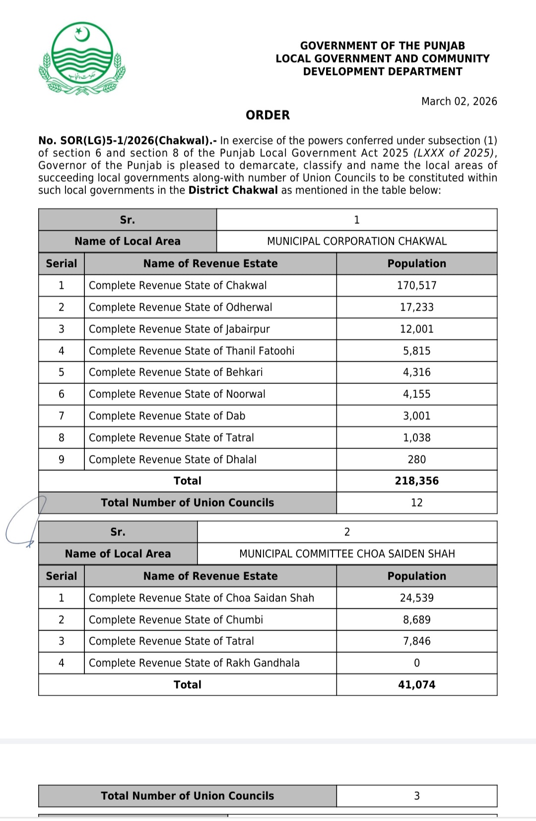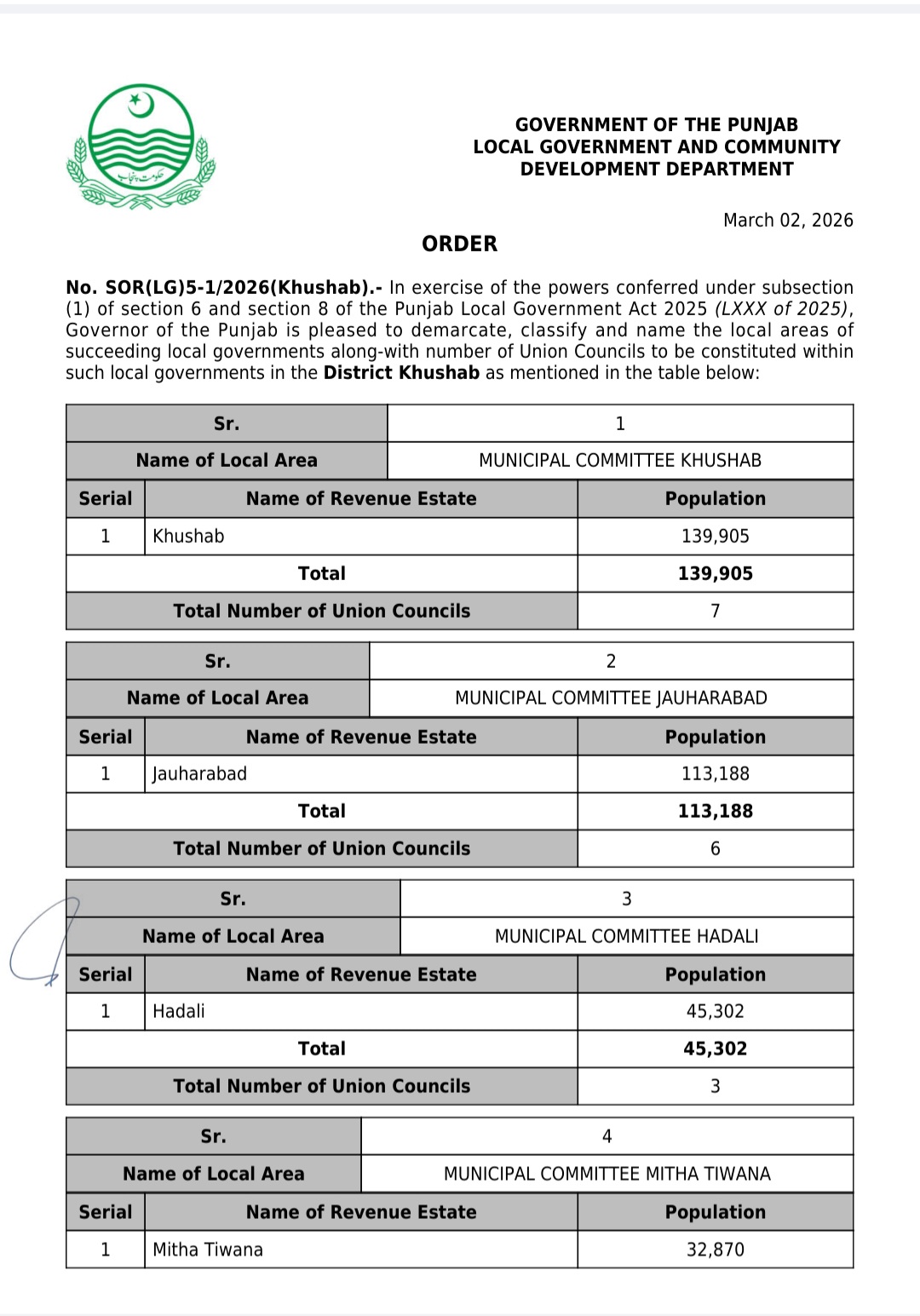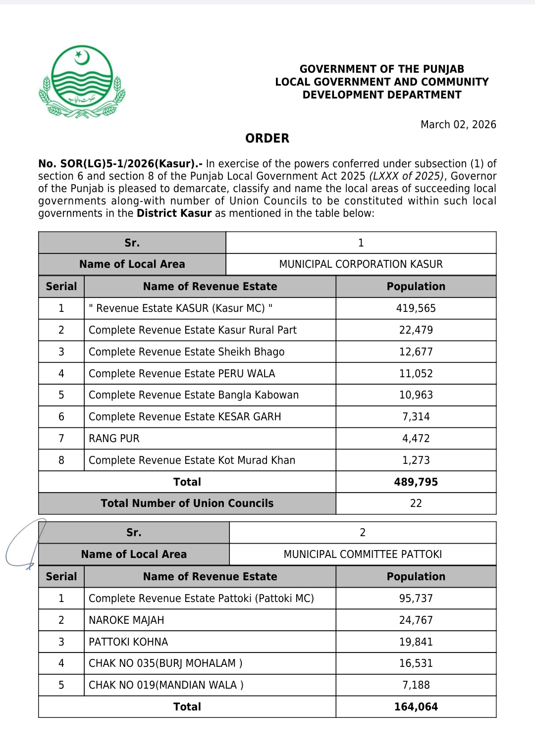 پنجاب کے439بلدیاتی اداروں کی حد بندیوں اور تشکیل کے نوٹیفکیشنز جاری کر دیئے گئے ہیں۔محکمہ بلدیات پنجاب نے پنجاب لوکل گورنمنٹ ایکٹ 2025ء اور حلقہ بندیوں کے رولز کے تحت یونین کونسلوں کے بھی نوٹیفکیشنز جاری کئے ہیں