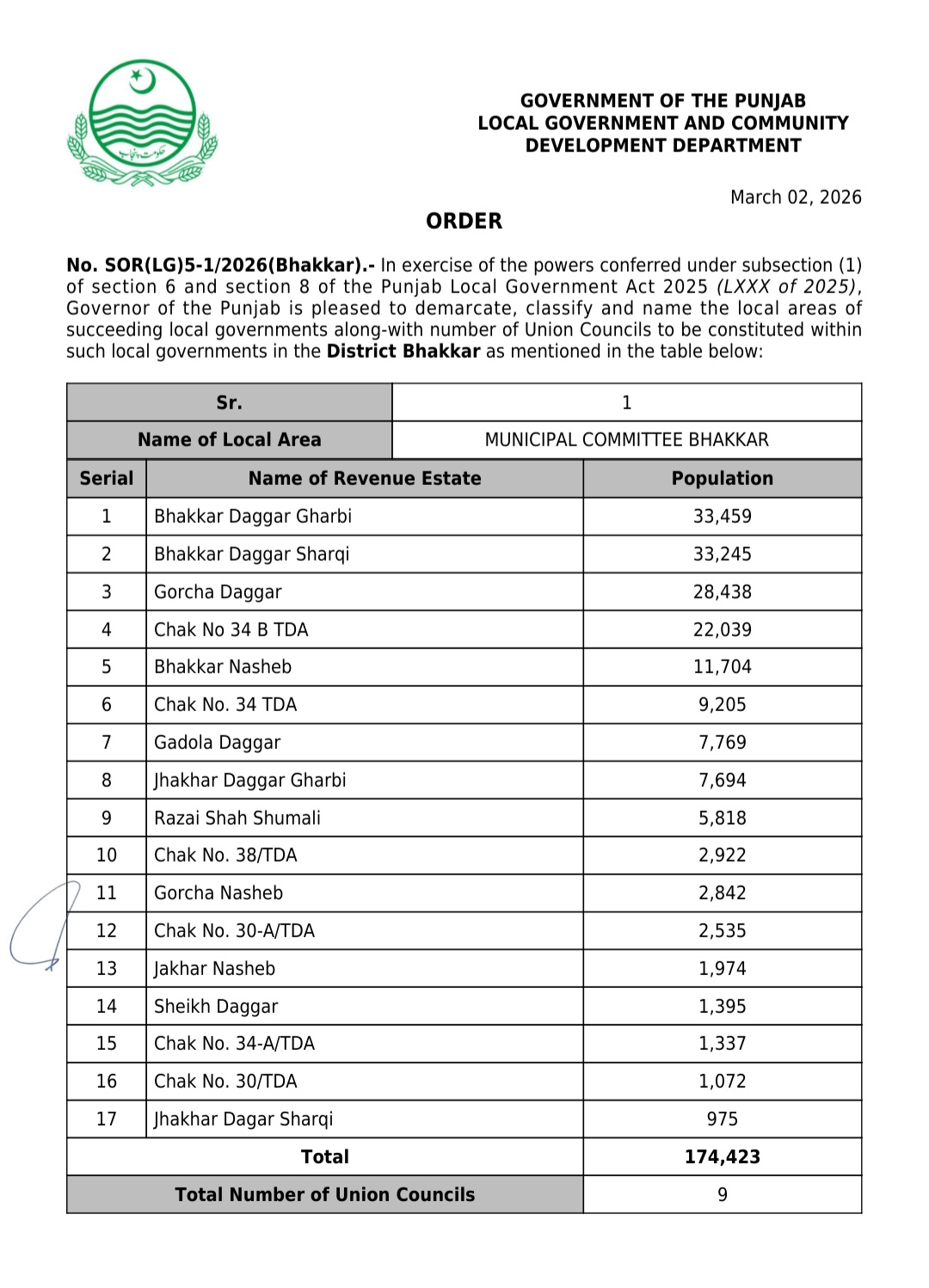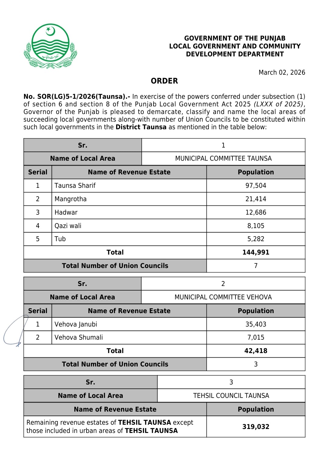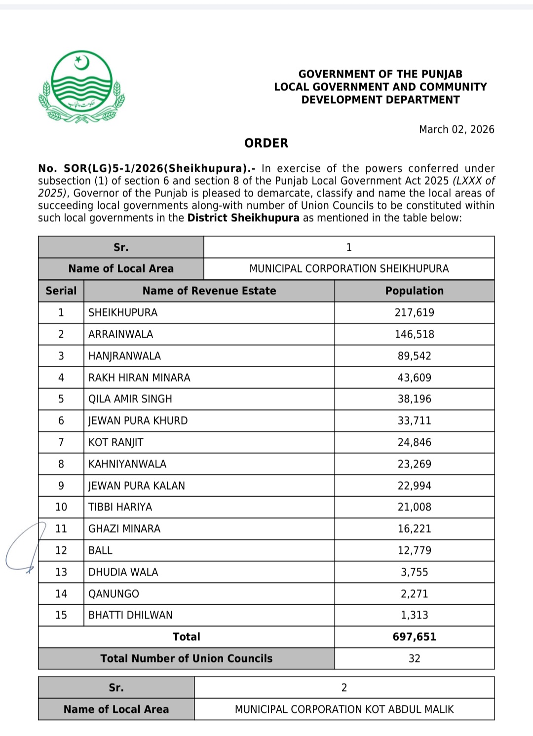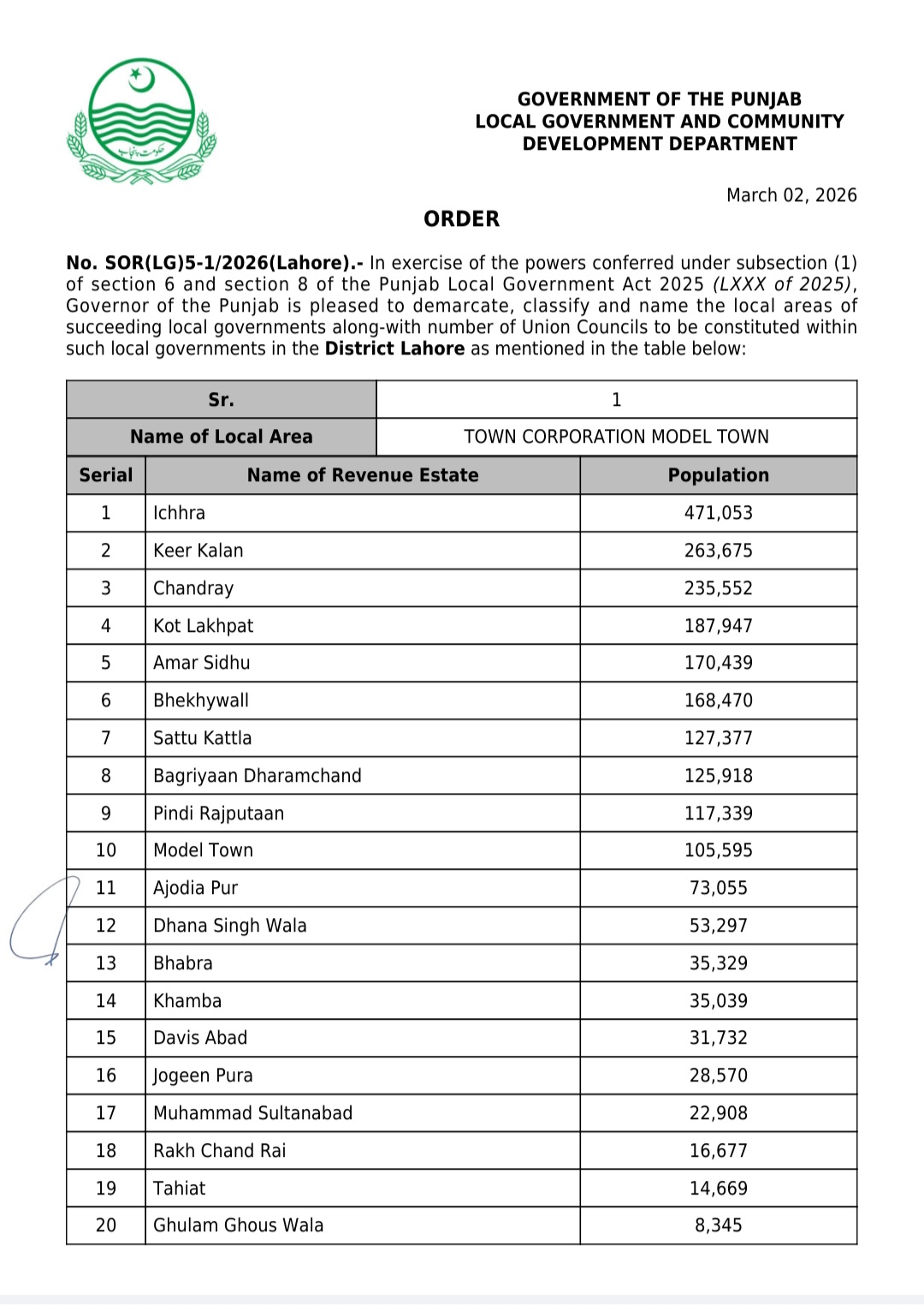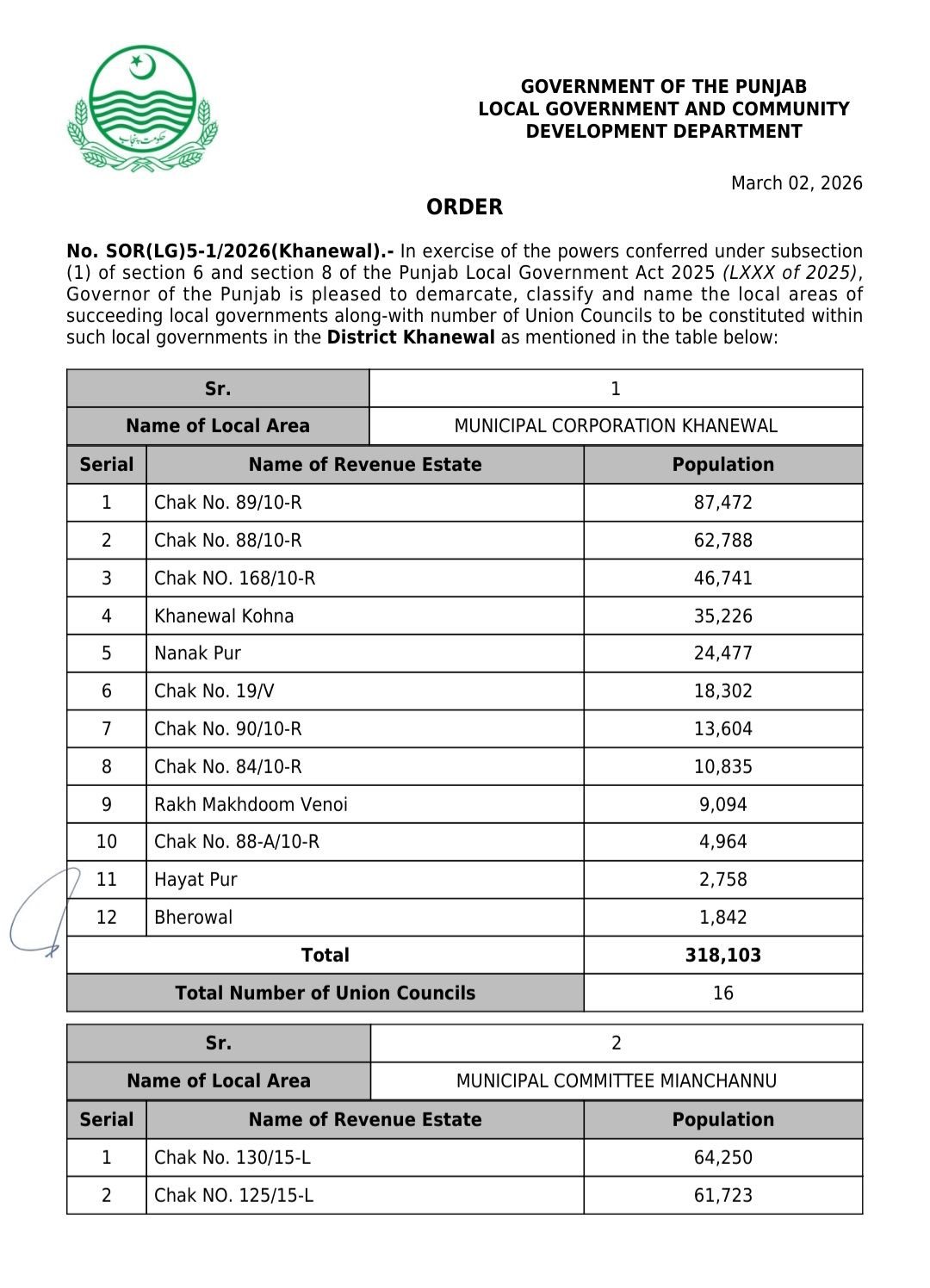 پنجاب کے439بلدیاتی اداروں کی حد بندیوں اور تشکیل کے نوٹیفکیشنز جاری کر دیئے گئے ہیں۔محکمہ بلدیات پنجاب نے پنجاب لوکل گورنمنٹ ایکٹ 2025ء اور حلقہ بندیوں کے رولز کے تحت یونین کونسلوں کے بھی نوٹیفکیشنز جاری کئے ہیں