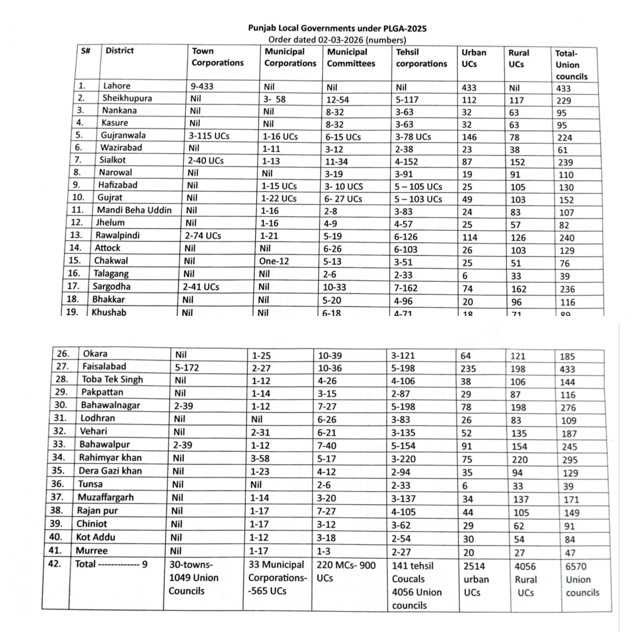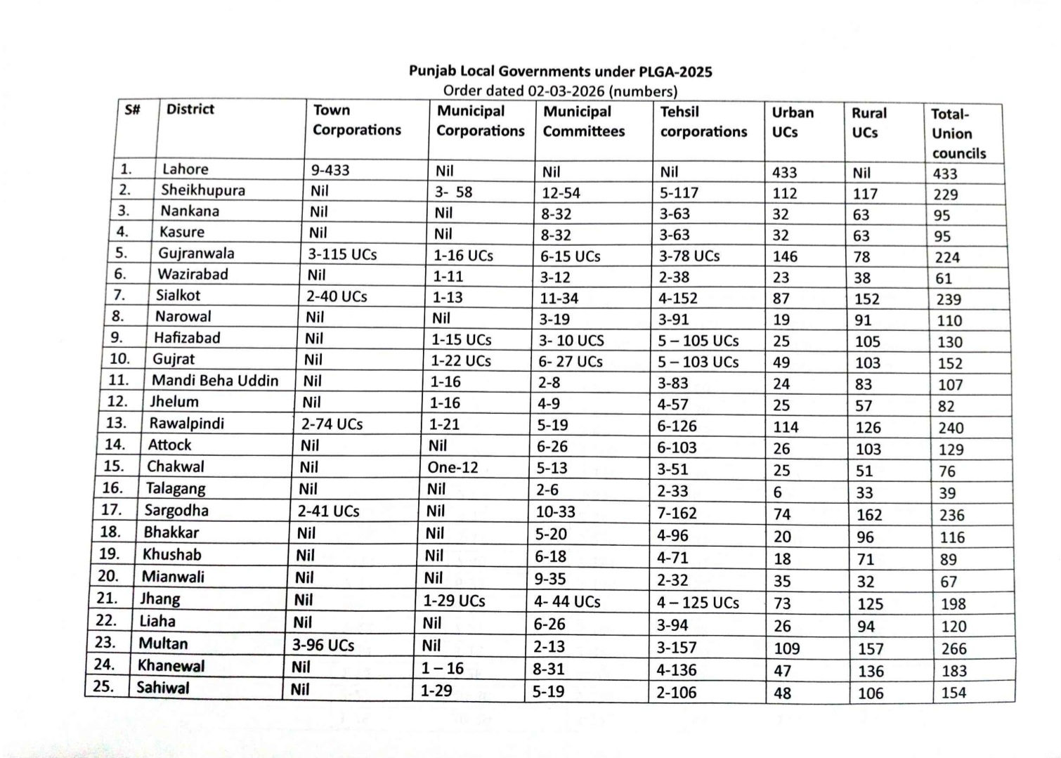 میونسپل کمیٹیوں کی تعداد جو 182 تھی اب 220 ہو گئیں ہیں۔تحصیل کونسلز 141 ہیں۔