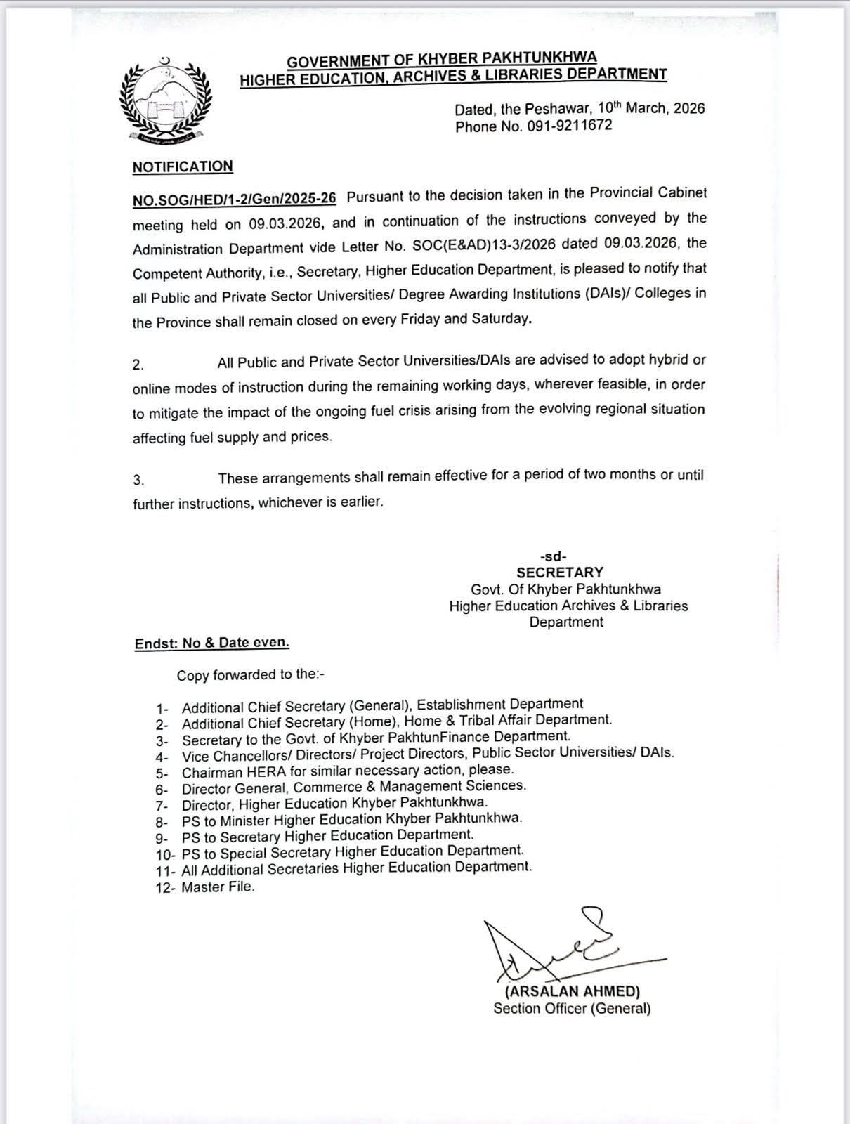 خیبرپختونخوا میں جامعات اور ڈگری ایوارڈنگ اداروں کے اوقات کار میں عارضی تبدیلی کا اعلان کر دیا گیا.صوبے بھر کی تمام سرکاری و نجی جامعات جمعہ اور ہفتہ کو بند رہیں گی۔ڈگری ایوارڈنگ ادارے اور کالجز بھی جمعہ اور ہفتہ کو بند رکھنے کا نوٹیفکیشن جاری کر دیا گیا۔باقی ایام میں جامعات کو ہائبرڈ یا آن لائن تدریسی نظام اپنانے کی ہدایت کر دی گئی۔ایندھن کی فراہمی اور قیمتوں کی صورتحال کے باعث متبادل تدریسی طریقہ کار اپنانے کی تجویز پر عملدرامد شروع ہوگیا۔اعلامیے میں تعلیمی اداروں کے لیے ہائبرڈ اور آن لائن کلاسز کو ترجیح دینے کی ہدایت کر دی گئی۔فیصلے کا اطلاق ابتدائی طور پر دو ماہ کے لیے ہوگا۔نئی ہدایات جاری ہونے تک موجودہ انتظامات برقرار رہیں گے۔ہائیر ایجوکیشن، آرکائیوز اینڈ لائبریریز ڈیپارٹمنٹ نے باقاعدہ نوٹیفکیشن جاری کر دیا۔تمام وائس چانسلرز اور متعلقہ اداروں کو فیصلے پر عملدرآمد کی ہدایت جاری کر دی گئی۔