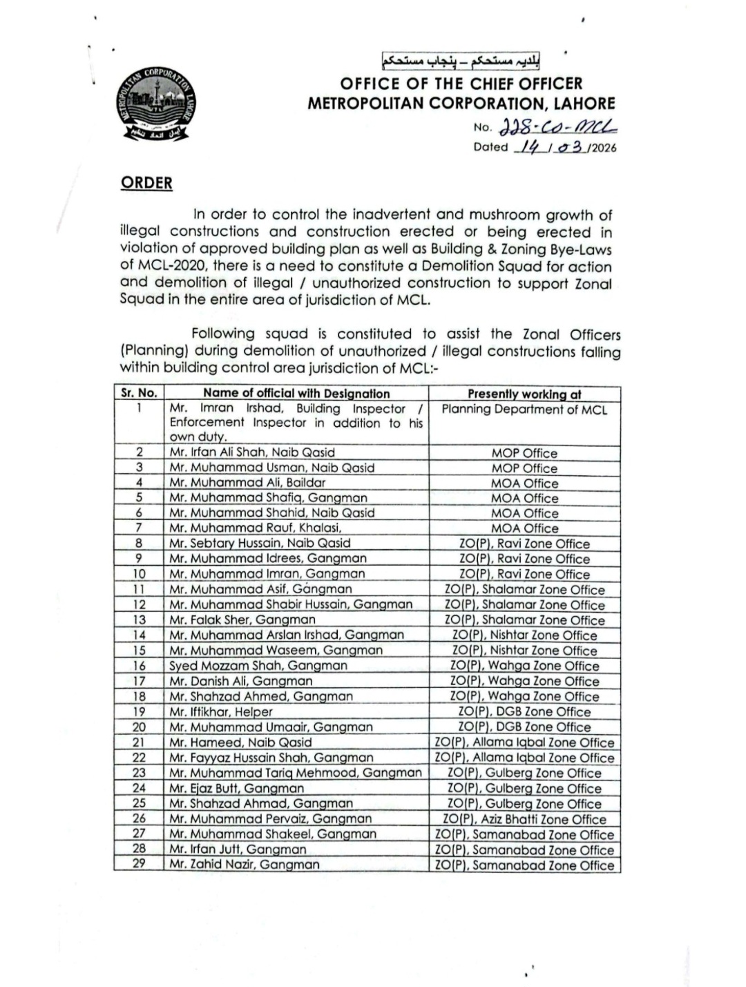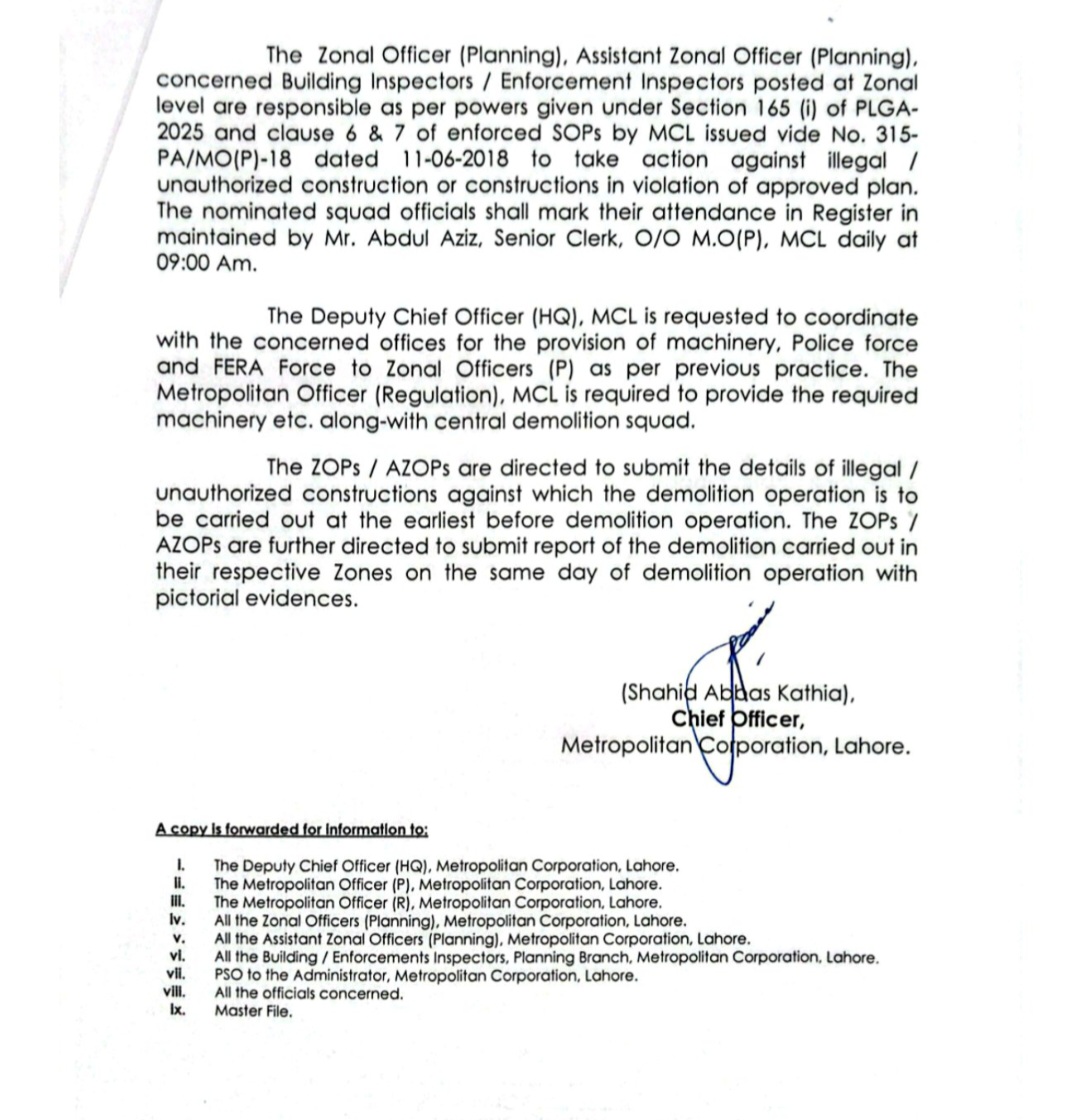 اس سلسلہ میں تمام زونل آفیسر پلاننگ سے غیر قانونی تعمیرات کی فہرست طلب کر لی گئی ہے۔کارروائی روزانہ کی بنیاد پر ہوگی۔29 ملازمین پر مشتمل مسماری اسکواڈ کا نوٹیفکیشن چیف آفیسر ایم سی ایل شاہد عباس کاٹھیا اور میٹروپولیٹن آفیسر پلاننگ ڈاکٹر رائے امتیاز حسن کی جانب سے جاری کیا گیا ہے۔جس کے مطابق منظور شدہ بلڈنگ پلان کے ساتھ ساتھ MCL-2020 کے بلڈنگ اینڈ زوننگ بائی لاز کی خلاف ورزی کرتے ہوئے تعمیر کی جانے والی غیر قانونی تعمیرات اور بلڈنگ بائی لاز ،ماسٹر پلان اور نقشہ کی خلاف ورزی کو کنٹرول کرنے کے لیے، MCL-2020 کے زونل حلقوں میں غیر قانونی/غیر مجاز تعمیرات کو مسمار کرنے کے لیے ایک ڈیمالیشن اسکواڈ تشکیل دینے کی ضرورت ہے۔ایم سی ایل کے بلڈنگ کنٹرول ایریا کے دائرہ اختیار میں آنے والی غیر مجاز / غیر قانونی تعمیرات کو مسمار کرنے کے دوران زونل آفیسرز (پلاننگ) کی مدد کے لیے درج ذیل سکواڈ تشکیل دیا گیا ہے:-جو عمران ارشاد، بلڈنگ انسپکٹر/انفورسمنٹ انسپکٹر، عرفان علی شاہ، نائب قاصد،محمد عثمان، نائب قاصد، محمد علی، بیلدار، محمد شفیق، گینگ مین، محمد شاہد، نائب قاصد محمد رؤف، سبطع حسین، نائب قاصد محمد ادریس، گینگ مین، محمد عمران، گینگ مین، محمد آصف، گینگ مین، محمد شبیر حسین، گینگ مین، فلک شیر، گینگ مین، محمد وسیم، گینگ مین، سید معظم شاہ، گینگ مین، دانش علی، گینگ مین شہزاد احمد، گینگ مین، افتخار ہیلپر،محمد عمیر، گینگ مین، حمیدنائب قاصد، فیاض حسین شاہ، گینگ مین، محمد طارق محمود، گینگ مین، اعجاز بٹ، گینگ مین، مسٹر شہزاد احمد، گینگ مین، محمد پرویز، گینگ مین، محمد شکیل، گینگ مین، عرفان جٹ، گینگ مین، زاہد نذیر، گینگ مین پر مشتمل ہوگا۔نوٹیفکیشن کے مطابق زونل آفیسر (پلاننگ)، اسسٹنٹ زونل آفیسر (پلاننگ)۔ زونل سطح پر تعینات متعلقہ بلڈنگ انسپکٹرز/ انفورسمنٹ انسپکٹرز PLGA-2025 کے سیکشن 165 (i) اور MCL کے ذریعے جاری کردہ نافذ کردہ SOPs کی شق 6 اور 7 کے تحت دیے گئے اختیارات کے مطابق ذمہ دار ہیں منصوبہ نامزد اسکواڈ کے اہلکار روزانہ صبح 9:00 بجے مسٹر عبدالعزیز، سینئر کلرک، O/O M.O(P)، MCL کے زیر انتظام رجسٹر میں اپنی حاضری کو نشان زد کریں گے۔ڈپٹی چیف آفیسر (HQ)، MCL سے درخواست کی جاتی ہے کہ وہ سابقہ طرز عمل کے مطابق زونل آفیسرز (P) کو مشینری، پولیس فورس اور پیرا فورس کی فراہمی کے لیے متعلقہ دفاتر کے ساتھ رابطہ قائم کریں۔میٹروپولیٹن آفیسر (ریگولیشن)، MCL کو مرکزی ڈیمالیشن اسکواڈ کے ساتھ ضروری مشینری وغیرہ فراہم کرنے کی ضرورت ہے۔زونل آفیسرز پلاننگ، اسسٹنٹ زونل آفیسرز پلاننگ کو ہدایت کی گئی ہے کہ وہ ان غیر قانونی / غیر مجاز تعمیرات کی تفصیلات جمع کرائیں جن کے خلاف مسمار کرنے کے آپریشن کو مسمار کرنے کے آپریشن سے پہلے جلد از جلد انجام دیا جائے۔ ZOPs/AZOPs کو مزید ہدایت کی گئی ہے کہ وہ اپنے متعلقہ زون میں مسماری کی کارروائی کے اسی دن تصویری شواہد کے ساتھ رپورٹ پیش کریں۔