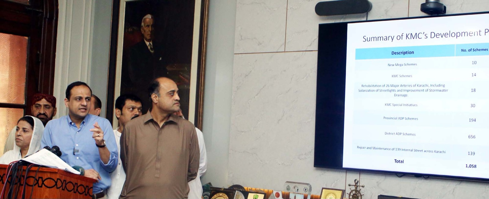 کی 24 مارکیٹوں میں بھی ترقیاتی کام جاری ہیں۔ کراچی کے پرانے ورثے کو بھی بہتر کرنے کا عزم اٹھایا ہے جبکہ ایمپریس مارکیٹ کی بحالی کے منصوبے پر بھی کام جاری ہے، رمضان المبارک کے باعث تاجروں کے کاروبار کو متاثر کیے بغیر کام کیا جا رہا ہے اور ایمپریس مارکیٹ کے ڈیڑھ سو سال پرانے گھنٹے کو بھی بحال کر دیا گیا ہے جبکہ تین سو گاڑیوں کی پارکنگ بھی تعمیر کی گئی ہے،کے ایم سی بلڈنگ کی سو سال پرانی تاریخی عمارت ہے جس کی بحالی اور بہتری کا کام کیا جا رہا ہے، بلدیہ عظمیٰ کراچی کی عمارت کو شمسی توانائی پر منتقل کر دیا گیا ہے، انہوں نے کہا کہ ڈینسو ہال کی پرانی مارکیٹ کو درست کیا گیا ہے اور حسن علی ہوتھی مارکیٹ کی تزئین و آرائش مکمل کی جا چکی ہے جبکہ لی مارکیٹ پر کام جاری ہے اور لیاری میں بھی ترقیاتی منصوبوں کا آغاز ہو چکا ہے، سولجر بازار مارکیٹ جو سو سال قبل تعمیر کی گئی تھی اس کی بحالی کا کام بھی کیا جا رہا ہے جبکہ مچھی میانی مارکیٹ اور کینٹ اسٹیشن سول لائنز مارکیٹ کی مرمت اور بحالی کے منصوبے بھی جاری ہیں،30 جون سے پہلے اس کام کو مکمل کرلیا جائے گا، انہوں نے کہا کہ حب ریور روڈ اور طوری بنگش روڈ کی خراب صورتحال کے باعث شہریوں کو مشکلات کا سامنا تھا اس لیے طوری بنگش روڈ پر ترقیاتی کام شروع کر دیے گئے ہیں جس پر ایک ارب روپے خرچ کیے جائیں گے، انہوں نے کہا کہ کے ایم سی کا وژن ہے کہ کراچی کے ساتوں اضلاع میں یکساں ترقیاتی کام کیے جائیں، میئر کراچی نے کہا کہ کڈنی ہل پر برڈ آوری کے منصوبے کا آغاز کر دیا گیا ہے جس پر 20 کروڑ روپے خرچ کیے جائیں گے جبکہ وہاں پانچ لاکھ درخت لگانے میں فاریسٹ ڈپارٹمنٹ اور سول سوسائٹی نے تعاون کیا ہے، اسی طرح گٹر باغیچہ میں عوام کے لیے پارک تعمیر کیا جارہا ہے جبکہ گلشن حدید اسٹیل ٹاؤن کی مرکزی سڑک کی تعمیر پر 50 کروڑ روپے خرچ کیے جائیں گے، انہوں نے کہا کہ حال ہی میں وزیراعلیٰ سندھ نے خالد بن ولید فلائی اوور کا افتتاح کیا جبکہ عظیم پورہ انٹر سیکشن پر بھی فلائی اوور کی تعمیر جاری ہے تاکہ وہاں ٹریفک سگنل ختم کیا جاسکے، انہوں نے کہا کہ وہ روزانہ انجینئرز سے رابطے میں رہتے ہیں اور رمضان کے دوران بھی ترقیاتی کام جاری ہیں، انہوں نے کہا کہ شارع فیصل اور یونیورسٹی روڈ کو ایک اہم کوریڈور کے طور پر بہتر بنایا جا رہا ہے کیونکہ بی آر ٹی منصوبے کی وجہ سے ٹریفک کا دباؤ شارع فیصل، شاہراہ پاکستان، راشد منہاس روڈ، کارساز اور ڈالمیا روڈ پر منتقل ہو جاتا ہے، اس لیے چار ارب روپے کی لاگت سے چار اہم کوریڈورز کو بہتر بنانے کا منصوبہ بنایا گیا ہے، اس کے علاوہ پہلوان گوٹھ کا منصوبہ شروع کیا گیا ہے جس کا سنگ بنیاد رکھا جا چکا ہے، میئر کراچی نے کہا کہ شہر میں کئی دہائیوں سے نئے قبرستان قائم نہیں کیے گئے تھے اس لیے 43 کروڑ روپے کی لاگت سے نئے قبرستان تعمیر کیے جائیں گے کیونکہ طارق روڈ، عیسیٰ نگری اور دیگر قبرستان مکمل بھر چکے ہیں، انہوں نے کہا کہ میمن گوٹھ روڈ دو ماہ میں مکمل کی جائے گی جبکہ شادمان ٹاؤن میں آئی ٹی پارک کا افتتاح کیا جائے گا اور ماڑی پور روڈ پر اسپورٹس گراؤنڈ کا کام تیزی سے جاری ہے جسے 31 مئی تک مکمل کر لیا جائے گا،انہوں نے بتایا کہ شاداب فٹبال گراؤنڈ کا کام مکمل ہو چکا ہے جبکہ بلدیہ عظمیٰ کراچی کی جانب سے بلدیہ ٹاؤن میں عوام کے لیے 25 ایکڑ زمین پر اسپورٹس اسٹیڈیم تعمیر کیا جا رہا ہے جس پر ایک ارب روپے سے زائد خرچ ہوں گے، اس کے علاوہ شہر کی 26 سڑکوں پر ساڑھے پانچ ارب روپے کی لاگت سے تعمیر اور بحالی کا کام بھی شروع کیا جا رہا ہے جن میں صہبااختر روڈ، مرزا آدم خان روڈ، خواجہ اجمیر نگری پولیس اسٹیشن سے بابا موڑ سرجانی تک سڑک، شاہراہ عثمان سے اورنگی، میٹروول روڈ، ملیر پندرہ سے سعودآباد اور ہاشم رضا روڈ شامل ہیں، میئر کراچی نے کہا کہ ایک ارب روپے کی لاگت سے اسٹریٹ لائٹس کو سولر سسٹم پر منتقل کیا جا رہا ہے جبکہ نالوں کی بہتری کے لیے بھی ایک ارب روپے خرچ کیے جائیں گے، انہوں نے کہا کہ سات ہزار روڈ پر قائم تجاوزات کے خاتمے کے لیے اقدامات 