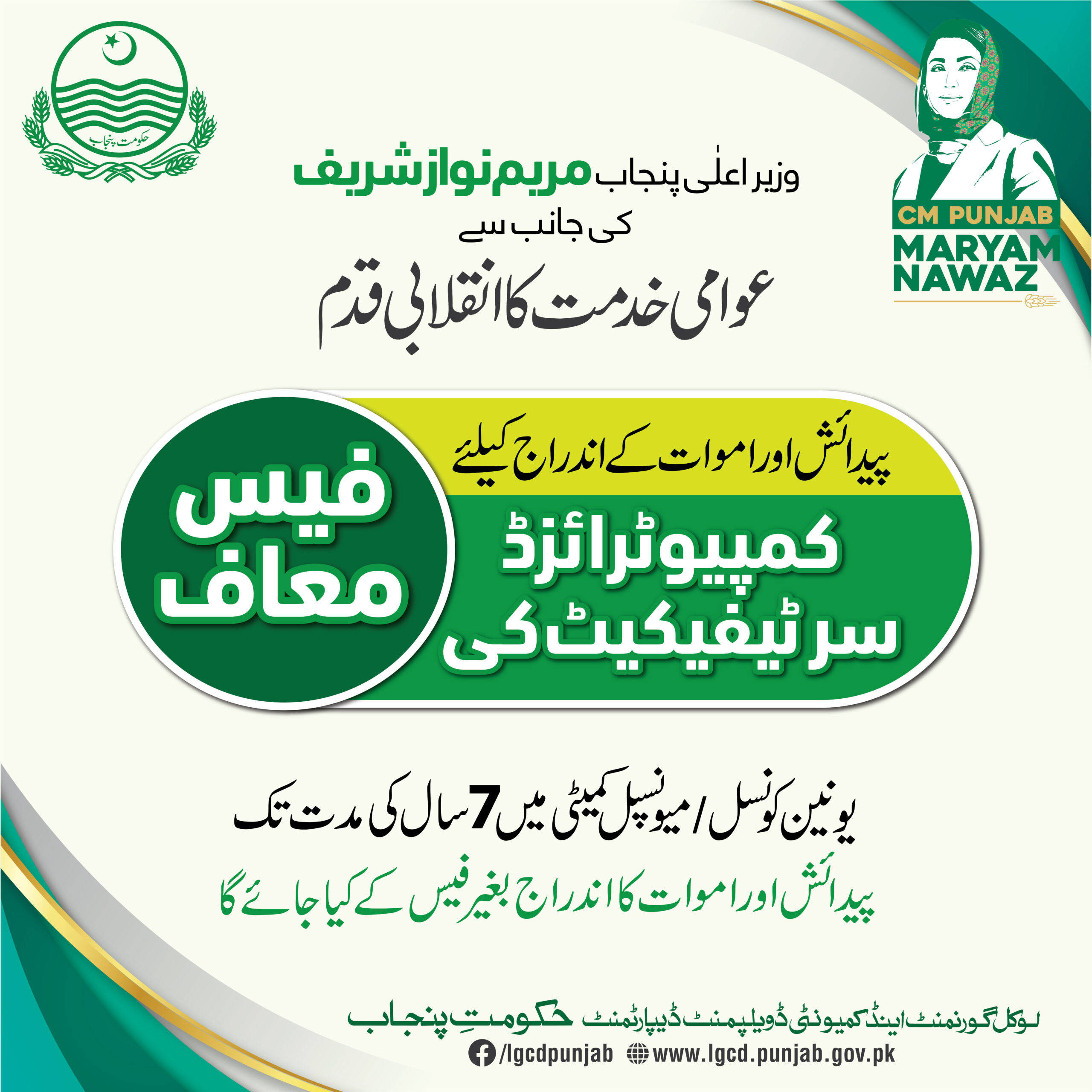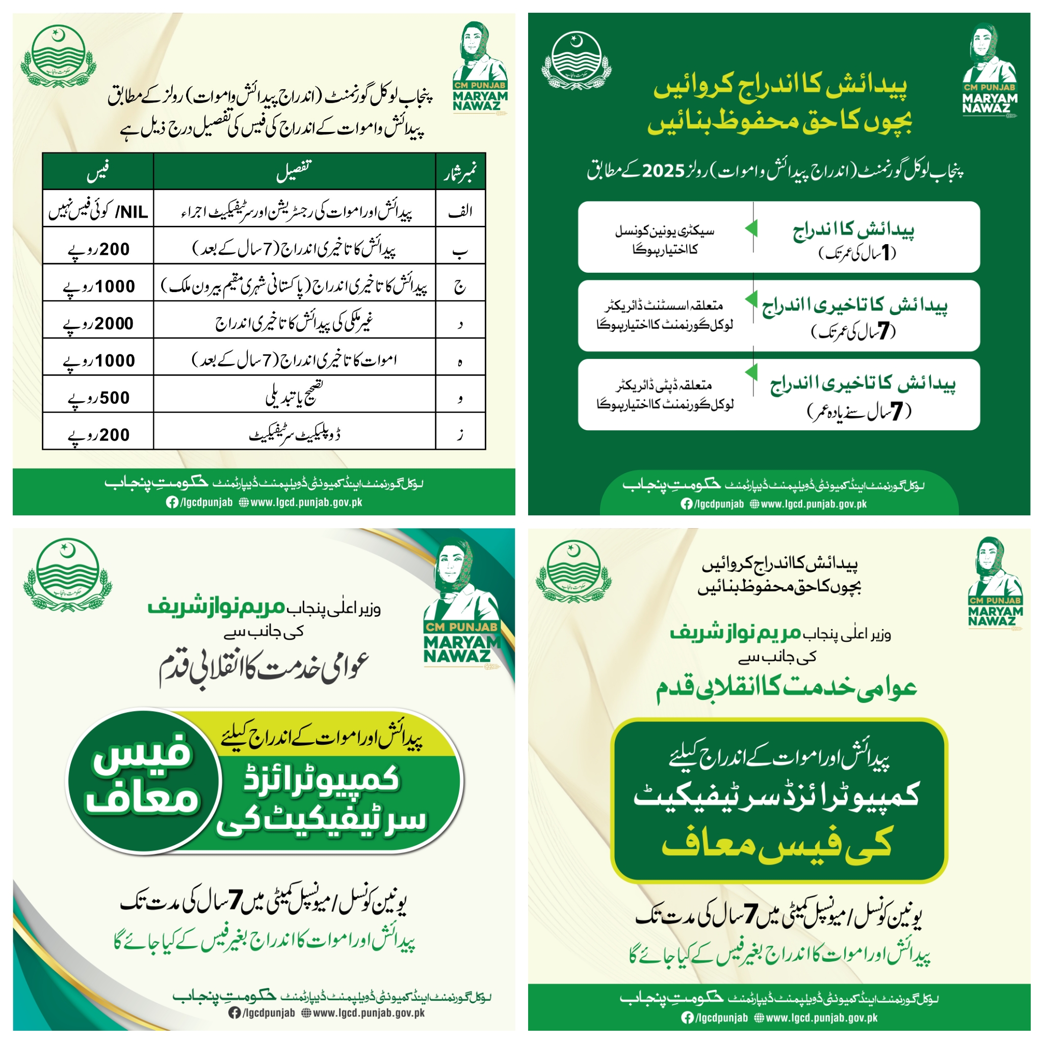 پنجاب لوکل گورنمنٹ اینڈ کمیونٹی ڈویلپمنٹ کی جانب سے پیدائش و اموات کے نئے شیڈول کے مطابق سات سال تک پیدائش و اموات کی رجسٹریشن اور سرٹیفکیٹ کا اجراء مفت ہے جس کی کوئی فیس نہیں ہوگی۔پیدائش کے تاخیری اندراج 7 سال کے بعد کی فیس 200 روپے مقرر کی گئی ہے۔پیدائش کا تاخیری اندراج پاکستانی شہری مقیم بیرون ملک فیس 1000 روپے ہے۔غیر ملکی پیدائش کا تاخیری اندراج کی فیس 2000 روپے مقرر کی گئی ہے۔اموات کے تاخیری اندراج 7 سال کے بعد کی فیس 1000 روپے،تصیح یا تبدیلی کی فیس 500 روپے جبکہ ڈپلیکیٹ سرٹیفکیٹ کی فیس 200 روپے مقرر کی گئی ہے۔سرکاری فیس سے زائد وصولی کی صورت میں متعلقہ یونین کونسل کے سیکرٹری کے خلاف کارروائی ہو گی۔سیکرٹری بلدیات شکیل احمد میاں نے انتباہ جاری کر دیا ہے۔