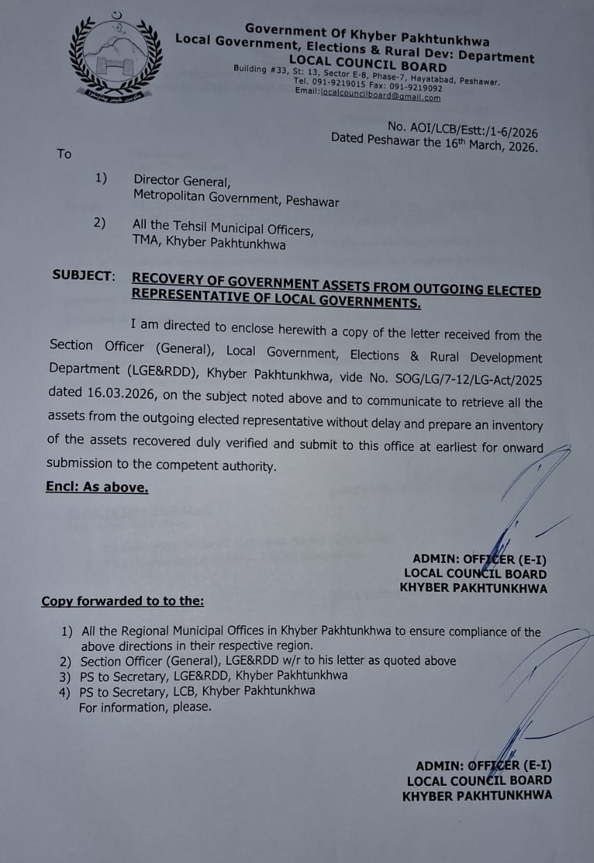 محکمہ لوکل گورنمنٹ،الیکشنز و دیہی ترقی خیبرپختونخوا نے سبکدوش ہونے والے بلدیاتی نمائندوں کے حوالے سے حکومتی اثاثوں کی رپورٹ طلب کر لی ہے۔اس سلسلہ میں ڈائریکٹر جنرل میٹروپولیٹن گورنمنٹ پشاور،تمام ٹی ایم اوز کو مراسلہ جاری کر دیا گیا ہے۔جو لوکل کونسل بورڈ کی جانب سے جاری کیا گیا ہے۔مراسلہ میں کہا گیا ہے کہ سیکشن آفیسر (جنرل) لوکل گورنمنٹ، الیکشنز اینڈ رورل ڈیولپمنٹ ڈیپارٹمنٹ (LGE&RDD)، خیبر پختونخواہ سے موصول ہونے والے خط کی ایک کاپی منسلک کرنے کی ہدایت کی گئی ہے، جس میں نمبر SOG/LG/7-12/LG-Act/2025 مورخہ 16.03.2026 کو اوپر دیے گئے تمام مضامین کو دوبارہ اطلاع دی گئی ہے۔ سبکدوش ہونے والے منتخب نمائندے سے بلا تاخیر اور وصول شدہ اثاثوں کی انوینٹری تیار کریں جس کی باقاعدہ تصدیق کی گئی ہو اور جلد از جلد اس دفتر میں جمع کروائیں تاکہ مجاز اتھارٹی کو پیش کی جا سکے۔
