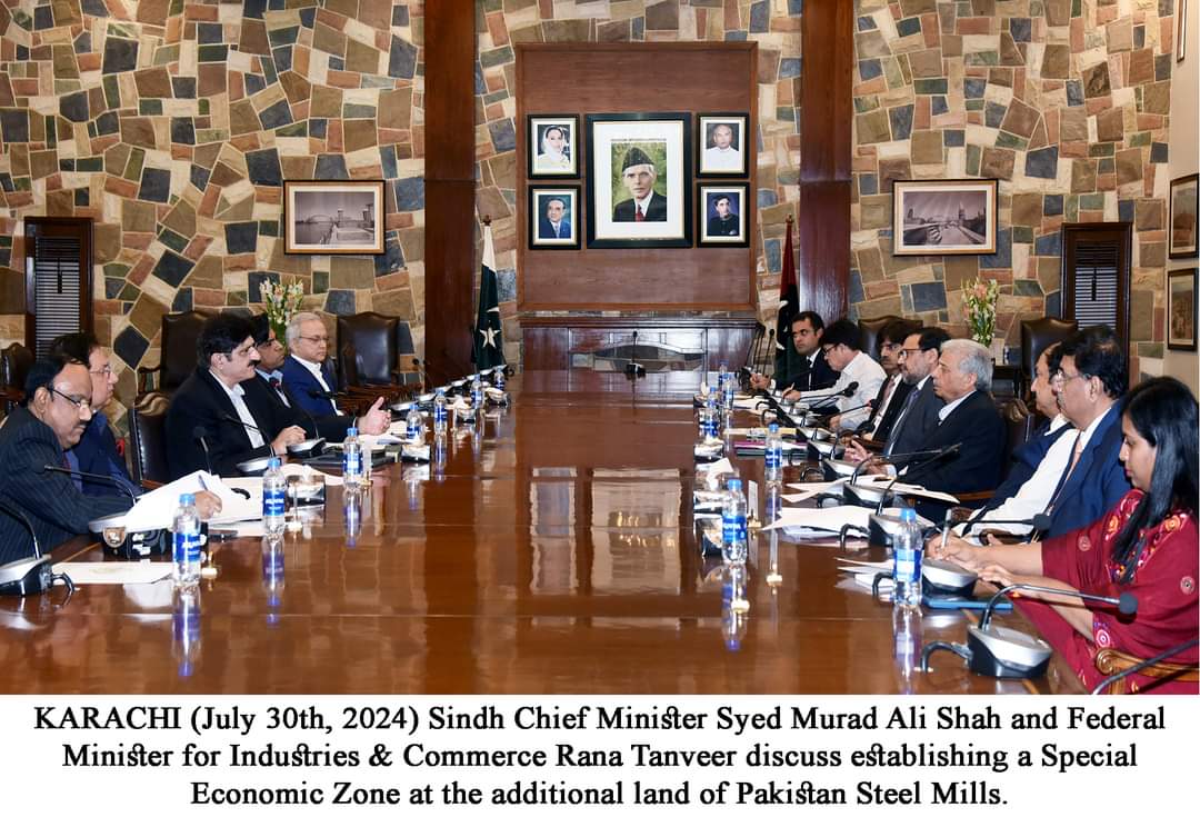 کراچی (30 جولائی) وزیراعلیٰ سندھ سید مراد علی شاہ اور وفاقی وزیر برائے صنعت و پیداوار رانا تنویر نے وزیراعلیٰ ہاؤس میں ملاقات کے دوران پاکستان اسٹیل مل کی بحالی اوراضافی اراضی پر اسپیشل اکنامک زون کے قیام پر تبادلہ خیال کیا ۔ اجلاس میں صوبائی وزیر صنعت جام اکرام دھاریجو، چیف سیکرٹری آصف حیدر شاہ،وزیراعلیٰ سندھ کے پرنسپل سیکریٹری آغا واصف، سیکرٹری صنعت یاسین شر نے شرکت کی جبکہ وفاقی وزیر کی معاونت وفاقی سیکرٹری صنعت سیف انجم اور ان کی ٹیم نے کی۔وزیراعلیٰ سندھ نے کہا کہ اسپیشل اکنامک زون کے قیام کے منصوبے پر 30 مئی 2024 کو کابینہ میں تفصیلی غور کیاگیا۔ انہوں نے مزید کہا کہ ان کی کابینہ نے وفاقی حکومت کو پاکستان اسٹیل مل کی اضافی اراضی پر اسپیشل اکنامک زون (SEZ) کے قیام کی تجویز دی۔مرادعلی شاہ نے کہا کہ ان کی کابینہ کی رائے ہے کہ پاکستان اسٹیل ملز پلانٹ کے لیے مختص 700 ایکڑ اراضی کو اسٹیل ملز پلانٹ کی بحالی یا نئی اسٹیل مل کے قیام کے لیے برقرار رکھا جائے، اس مقصد کے حصول کےلیے زمین کی اضافی ضرورت پر باہمی طور پر کام کیا جانا چاہئے۔جس پر وفاقی وزیر رانا تنویر نے تجویز پیش کی کہ وفاقی حکومت صوبائی حکومت کو پرانے اسٹیل مل پلانٹ کو بحال کرنے یا 700 ایکڑ پر نیا پلانٹ لگانے کی اجازت دینے کے لیے تیار ہے۔وزیراعلیٰ سندھ نے کہا کہ 4,840 ایکڑ اراضی کو وفاقی اور صوبائی حکومت کے لیے اسپیشل اکنامک زون SEZ قائم کرنے کے لیے استعمال کیا جا سکتا ہے۔ رانا تنویر نے کہا کہ وفاقی حکومت اپنے وسائل سے اسپیشل اکنامک زون کو ترقی دے گی اور اسے چینی سرمایہ کاروں کے حوالے کیاجائے گا۔ مرادعلی شاہ نے کہا کہ سمندر کے قریب واقع ہونے کی وجہ سے اسپیشل اکنامک زون کا انفرااسٹرکچر پانی اور گیس کی بنیادی سہولیات سے آراستہ ہوگا۔ انہوں نے مزید کہا کہ یہ سہولتیں SEZ کو ملک کے بہترین زونز میں سے ایک بنانے کے لیے اہم ہیں۔صوبائی اور وفاقی حکومتوں نے جلد از جلد کاغذی کارروائی مکمل کرنے پر اتفاق کیا تاکہ زون کا فوری قیام عمل میں لایا جا سکے۔خصوصی اقتصادی زون روزگار کے مواقع پیدا کرے گا اور ملکی معیشت میں بہتری کا سبب بنے گا ۔ وزیراعلیٰ سندھ نے کہا کہ وہ وفاقی حکومت کے تعاون سے پاکستان اسٹیل ملز کو پی پی پی موڈ پر بحال کرنے کے لیے ہر ممکن کوشش کریں گے تاکہ اس قومی اثاثے کو روزگار اور معاشی ترقی کے لیے استعمال کیا جاسکے۔ مرادعلی شاہ نے کہا کہ ان کی حکومت زرعی معیشت کو مضبوط بنانے کے لیے فصلوں کے پیٹرن متعارف کروانے، صنعتی شعبے کو مضبوط اور بحال کرنے اور نوجوانوں کو فنی تعلیم فراہم کرنے کے لیے سخت کوشاں ہے۔ ٹیکنیکل اور نان ٹیکنیکل افرادی قوت میں اضافہ کرکے انہیں صنعتی شعبے سے وابستہ کیاجائےگا۔
