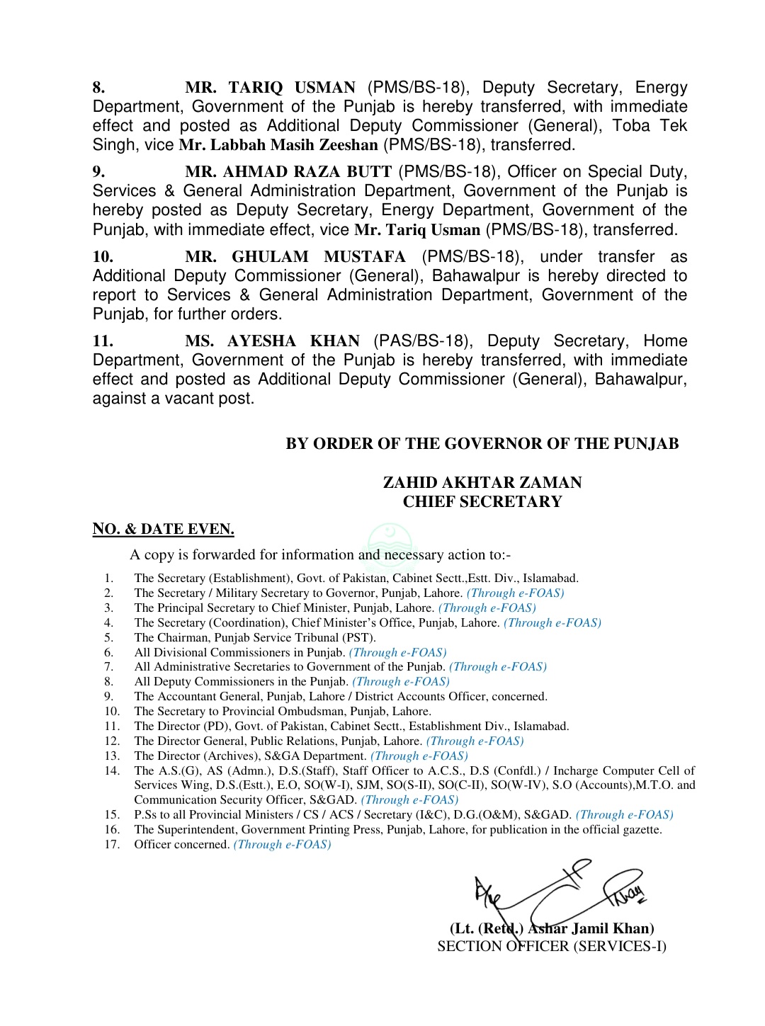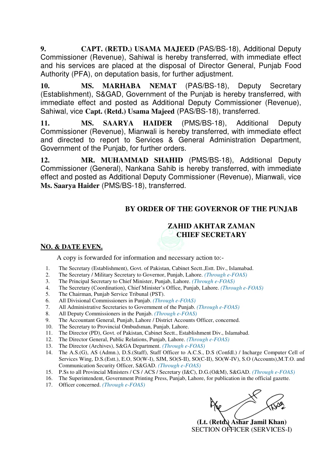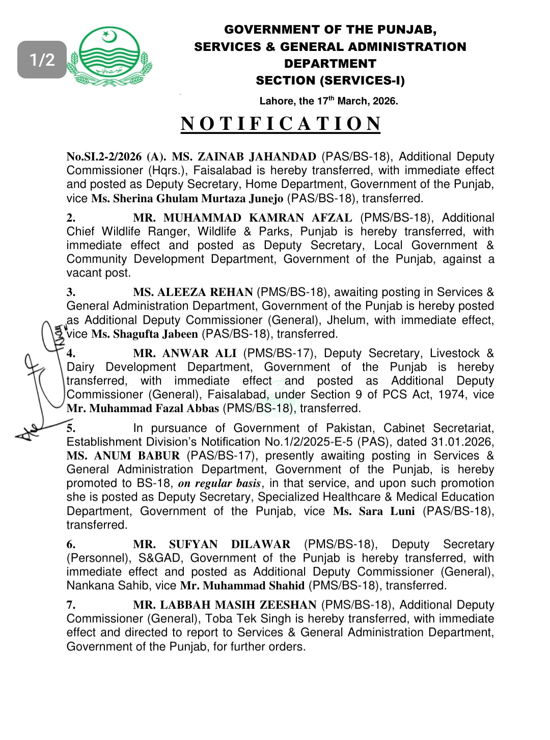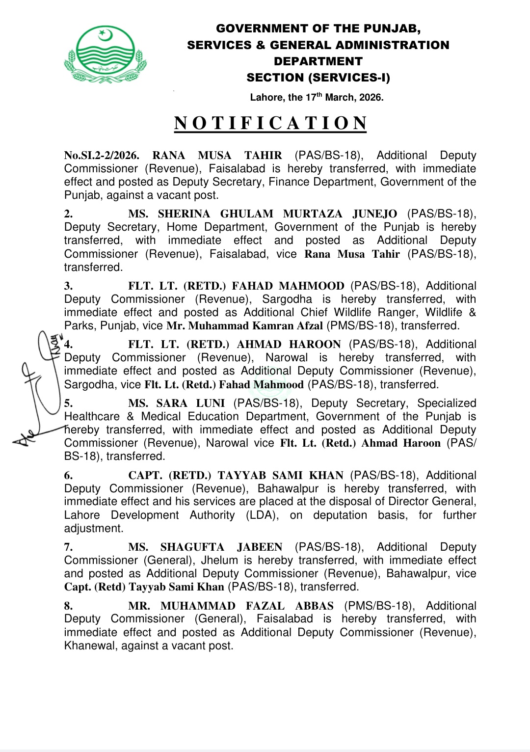 احمد ہارون کو ایڈیشنل ڈپٹی کمشنر ریونیو سرگودھا تعینات کردیا گیا ہے۔سارہ لونی کو ایڈیشنل ڈپٹی کمشنر ریونیو ناروال تعینات کردیا گیا ہے۔شگفتہ جبین کو ایڈیشنل ڈپٹی کمشنر ریونیو بہاولپور تعینات کردیا گیا ہے۔محمد فضل عباس کو ایڈیشنل ڈپٹی کمشنر ریونیو خانیوال تعینات کردیا گیا ہے۔مرحبا نعمت کو ایڈیشنل ڈپٹی کمشنر ریونیو ساہیوال تعینات کردیا گیا ہے۔محمد شاہد کو ایڈیشنل ڈپٹی کمشنر ریونیو میانوالی تعینات کردیا گیا۔علیزہ ریحان کو ایڈیشنل ڈپٹی کمشنر جنرل جہلم تعینات کردیا گیا ہے۔انور علی کو ایڈیشنل ڈپٹی کمشنر جنرل فیصل آباد تعینات کردیا گیا ہے۔سفیان دلاور کو ایڈیشنل ڈپٹی کمشنر جنرل ننکانہ صاحب تعینات کردیا گیا ہے۔طارق عثمان کو ایڈیشنل ڈپٹی کمشنر جنرل ٹوبہ ٹیک سنگھ تعینات کردیا گیا ہے۔عائشہ خان کو ایڈیشنل ڈپٹی کمشنر جنرل بہاولپور تعینات کردیا گیا ہے۔