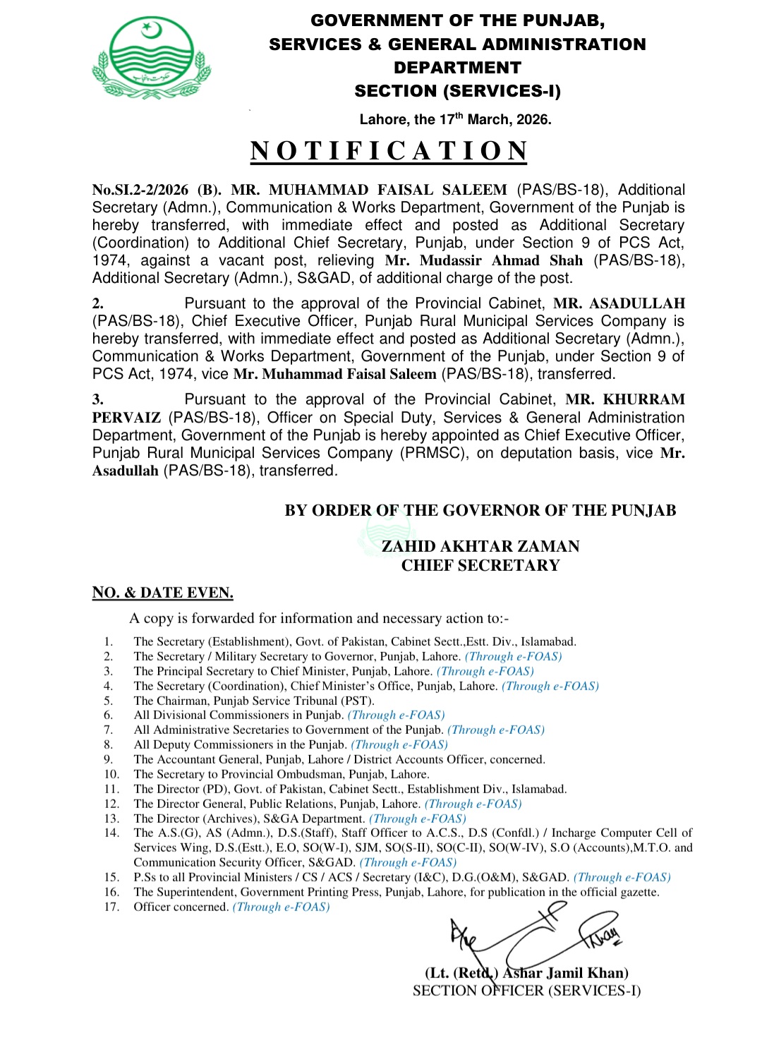 اسد اللہ چیف ایگزیکٹیو آفیسر، پنجاب رورل میونسپل سروسز کمپنی کو فوری طور پر تبدیل کر کے۔ ایڈیشنل سیکرٹری (ایڈمن) کمیونیکیشن اینڈ ورکس ڈیپارٹمنٹ حکومت پنجاب تعینات کیا گیا ہے۔ خرم پرویز آفیسر آن سپیشل ڈیوٹی، سروسز اینڈ جنرل ایڈمنسٹریشن ڈیپارٹمنٹ، حکومت پنجاب کو یہاں بطور چیف ایگزیکٹو آفیسر، پنجاب رورل میونسپل سروسز کمپنی (PRMSC) تعینات کیا گیا ہے۔