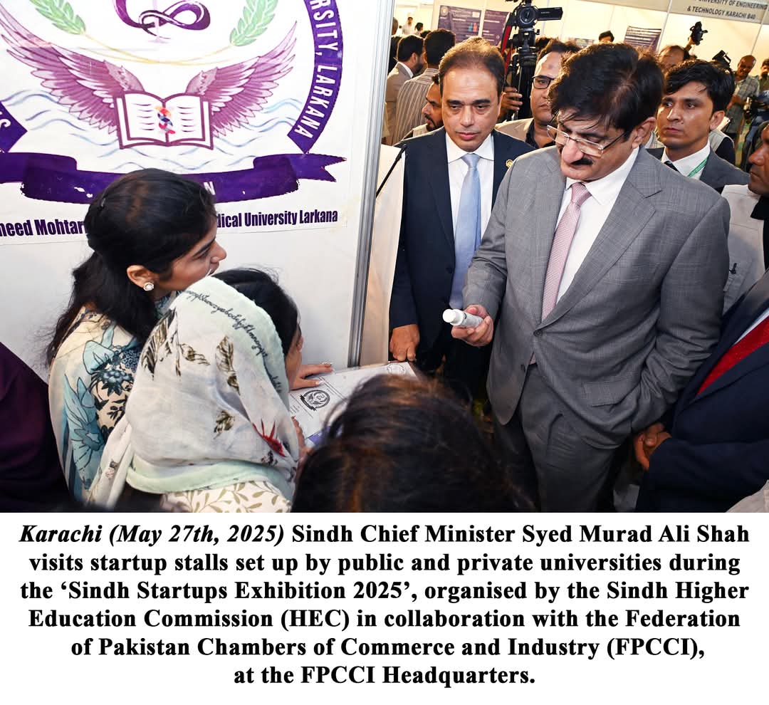 وزیر اعلیٰ سندھ سید مراد علی شاہ نے کہا ہے کہ حالیہ بھارت کے ساتھ کشیدگی کے دوران عوام کی طاقت اور ٹیکنالوجی نے مل کر اہم کردار ادا کیا اور نوجوانوں پر زور دیا کہ وہ قومی سرمایہ کاری اور دفاع میں اپنا بھرپور کردار ادا کریں۔وہ سندھ ہائر ایجوکیشن کمیشن (ایچ ای سی) کے زیرِ اہتمام اور فیڈریشن آف پاکستان چیمبرز آف کامرس اینڈ انڈسٹری (ایف پی سی سی آئی) کے اشتراک سے منعقدہ "پہلی سندھ اسٹارٹ اپس نمائش 2025