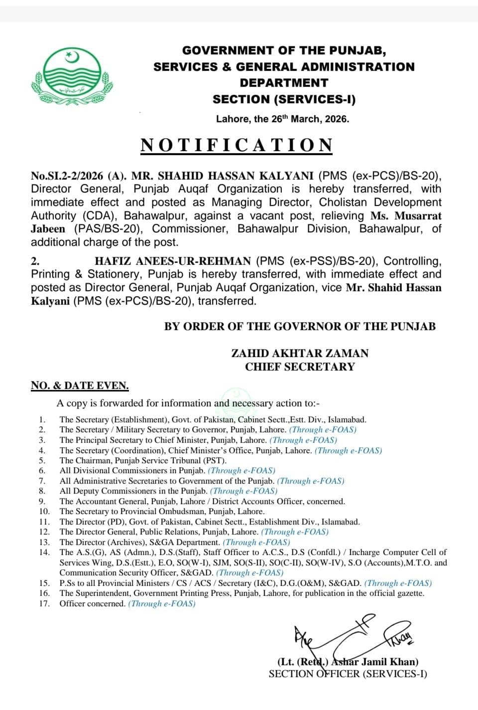 پنجاب میں بڑے پیمانے پرتقرروتبادلے،اسد اللہ تبدیل،خرم پرویز چیف ایگزیکٹو آفیسر پنجاب رورل میونسپل سروسز کمپنی تعینات