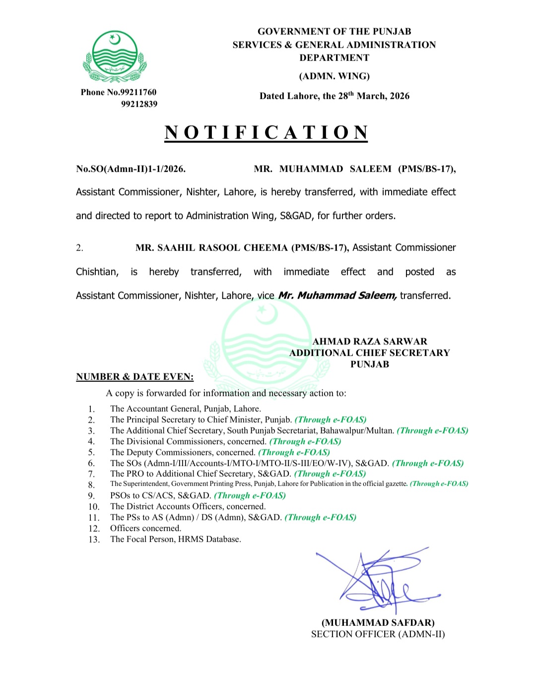 حکومت پنجاب نے دو اسسٹنٹ کمشنرز کے تقرروتبادلے کے احکامات جاری کئے ہیں۔اسسٹنٹ کمشنر نشتر لاہور محمد سلیم کو تبدیل کردیا گیا ہے انھیں محکمہ سروسز رپورٹ کرنے کی ہدایت کی گئی ہے۔اسسٹنٹ کمشنر چشتیاں ساحل رسول چیمہ کو تبدیل کردیا گیاہے۔ساحل رسول چیمہ کو اسسٹنٹ کمشنر نشتر لاہور تعینات کردیا گیا۔