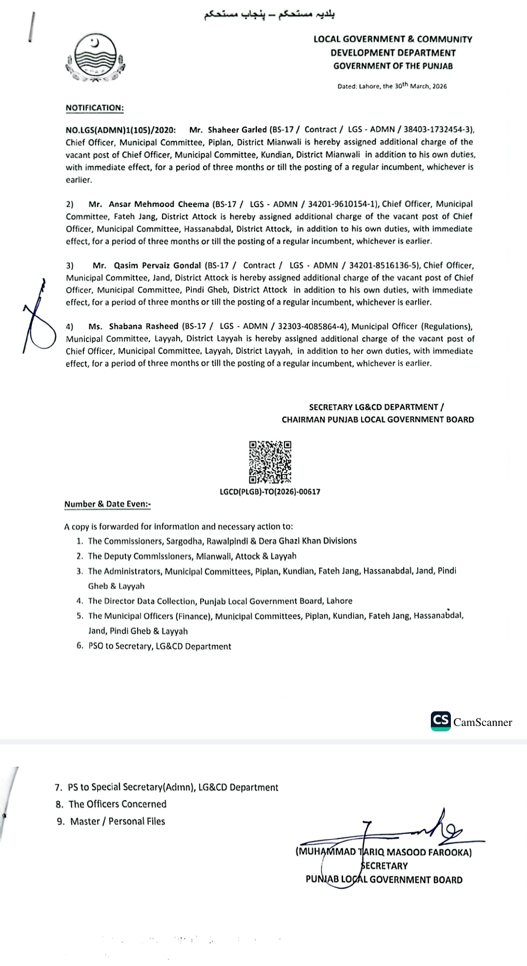 محکمہ بلدیات پنجاب نے 4 افسران کو چیف آفیسر کی اضافی ذمہ داریاں سونپ دی ہیں۔سیکرٹری بلدیات و چیئرمین لوکل گورنمنٹ بورڈ کی جانب سے جاری نوٹیفکیشن کے مطابق شہیر گارلڈ چیف آفیسر میونسپل کمیٹی پیلاں ضلع میانوالی کو چیف آفیسر کندیاں کی خالی آسامی کا چارج تفویض کیا گیا ہے۔عنصر محمود چیمہ چیف آفیسر میونسپل کمیٹی فتح جنگ کو چیف آفیسر میونسپل کمیٹی حسن ابدال کا اضافی چارج سونپ دیا گیا ہے۔قاسم پرویز گوندل چیف آفیسر میونسپل جنڈ کو چیف آفیسر ایم سی پنڈی گھیب ضلع اٹک کا اضافی چارج تفویض کیا گیا ہے۔شبانہ رشید میونسپل آفیسر ریگولیشنز لیہ چیف آفیسر ایم سی لیہ کا اضافی چارج دینے کے احکامات جاری کئے گئے ہیں۔