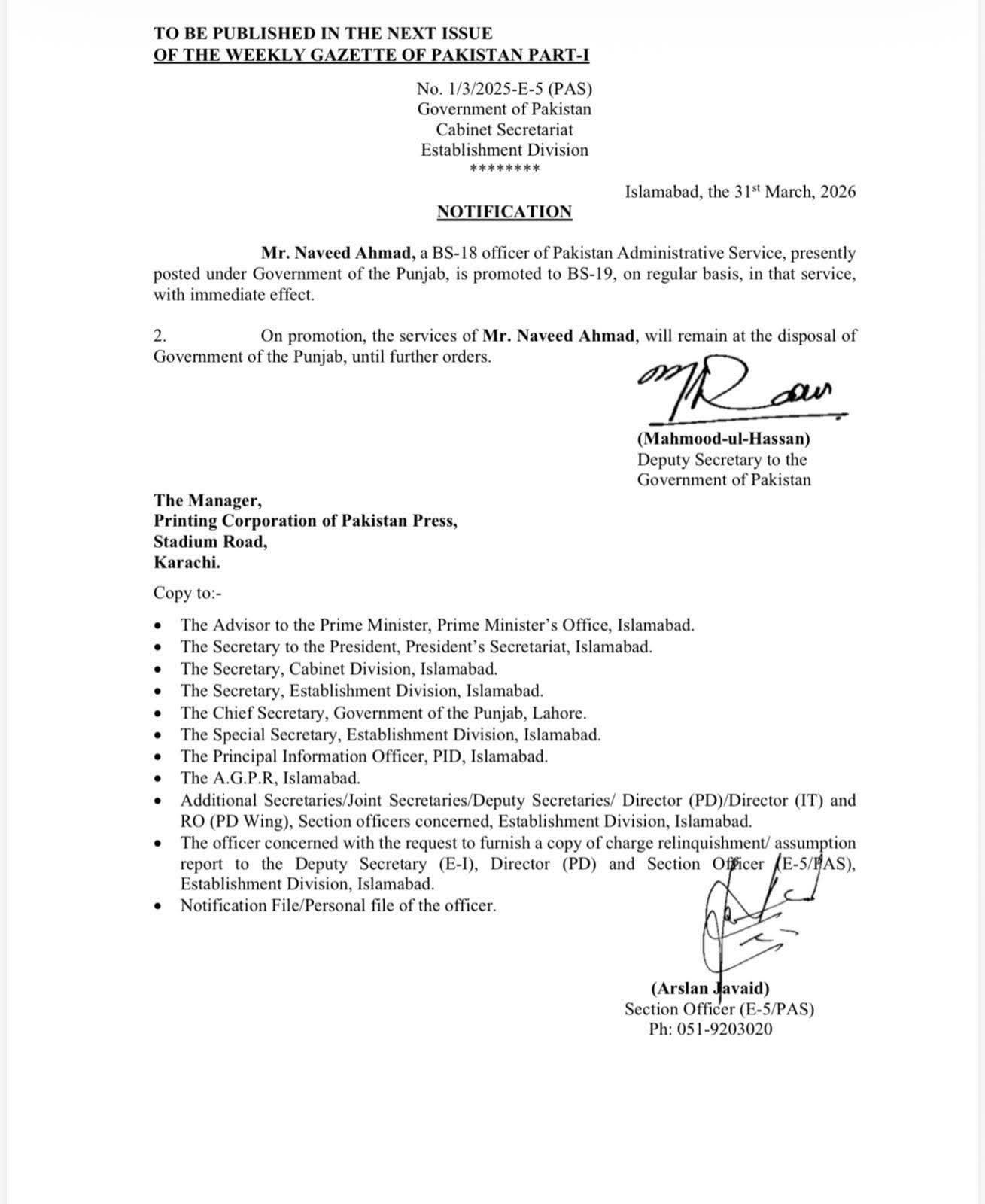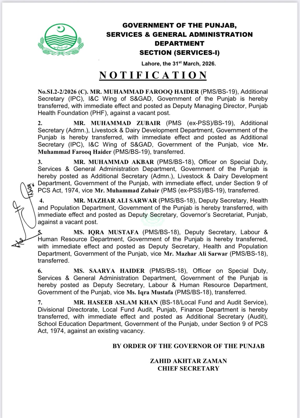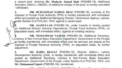 محمد فاروق حیدر ایڈیشنل سیکرٹری (IPC)، S&GAD کے I&C ونگ، حکومت پنجاب کو فوری طور پر تبدیل کر کے ڈپٹی مینیجنگ ڈائریکٹر، پنجاب ہیلتھ فاؤنڈیشن (PHF) کے طور پر ایک خالی آسامی پر تعینات کیا گیا ہے۔ محمد زبیر ایڈیشنل سیکرٹری (ایڈمن)، محکمہ لائیو سٹاک اینڈ ڈیری ڈویلپمنٹ، حکومت پنجاب کو فوری طور پر تبدیل کر کے ایڈیشنل سیکرٹری (IPC)، S&GAD، حکومت پنجاب کے I&C ونگ کے طور پر تعینات کیا گیا ہے۔ محمد اکبر آفیسر آن سپیشل ڈیوٹی، سروسز اینڈ جنرل ایڈمنسٹریشن ڈیپارٹمنٹ، حکومت پنجاب کو اس طرح ایڈیشنل سیکرٹری (ایڈمن)، لائیو سٹاک اینڈ ڈیری ڈویلپمنٹ ڈیپارٹمنٹ، حکومت پنجاب، PCS ایکٹ 1974 کے سیکشن 9 کے تحت فوری اثر کے ساتھ تعینات کیا گیا ہے۔مظہر علی سرور ڈپٹی سیکرٹری، ہیلتھ اینڈ پاپولیشن ڈیپارٹمنٹ، حکومت پنجاب کو فوری طور پر تبدیل کر کے ڈپٹی سیکرٹری، گورنر سیکرٹریٹ، پنجاب، ایک خالی آسامی پر تعینات کیا گیا ہے۔اقراء مصطفیٰ ڈپٹی سیکرٹری لیبر اینڈ ہیومن ریسورس ڈیپارٹمنٹ، حکومت پنجاب کو فوری طور پر تبدیل کیا گیا ہے اور انہیں ڈپٹی سیکرٹری، صحت و آبادی، حکومت پنجاب تعینات کیا گیا ہے۔ثریا حیدر آفیسر آن سپیشل ڈیوٹی، سروسز اینڈ جنرل ایڈمنسٹریشن ڈیپارٹمنٹ، حکومت پنجاب کو ڈپٹی سیکرٹری، لیبر اینڈ ہیومن ریسورس ڈیپارٹمنٹ، حکومت پنجاب تعینات کیا گیا ہے۔حسیب اسلم خان لوکل فنڈ اینڈ آڈٹ سروس)، ڈویژنل ڈائریکٹوریٹ، لوکل فنڈ آڈٹ، پنجاب، محکمہ خزانہ کو فوری طور پر تبدیل کر کے ایڈیشنل سیکرٹری (آڈٹ)، سکول ایجوکیشن ڈیپارٹمنٹ، حکومت پنجاب، PCS ایکٹ، 1974 کے سیکشن 9 کے تحت، موجودہ اسامی کے خلاف تعینات کیا گیا ہے۔علاوہ ازیں اسٹیبلشمنٹ ڈویژن نے ڈپٹی کمشنر گوجرانوالہ نوید احمد کی مستقل بنیادوں پر گریڈ 19 میں ترقی کا باقاعدہ نوٹیفکیشن جاری کر دیا ہے۔