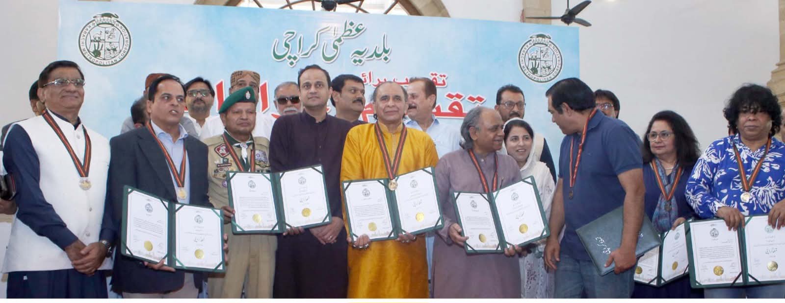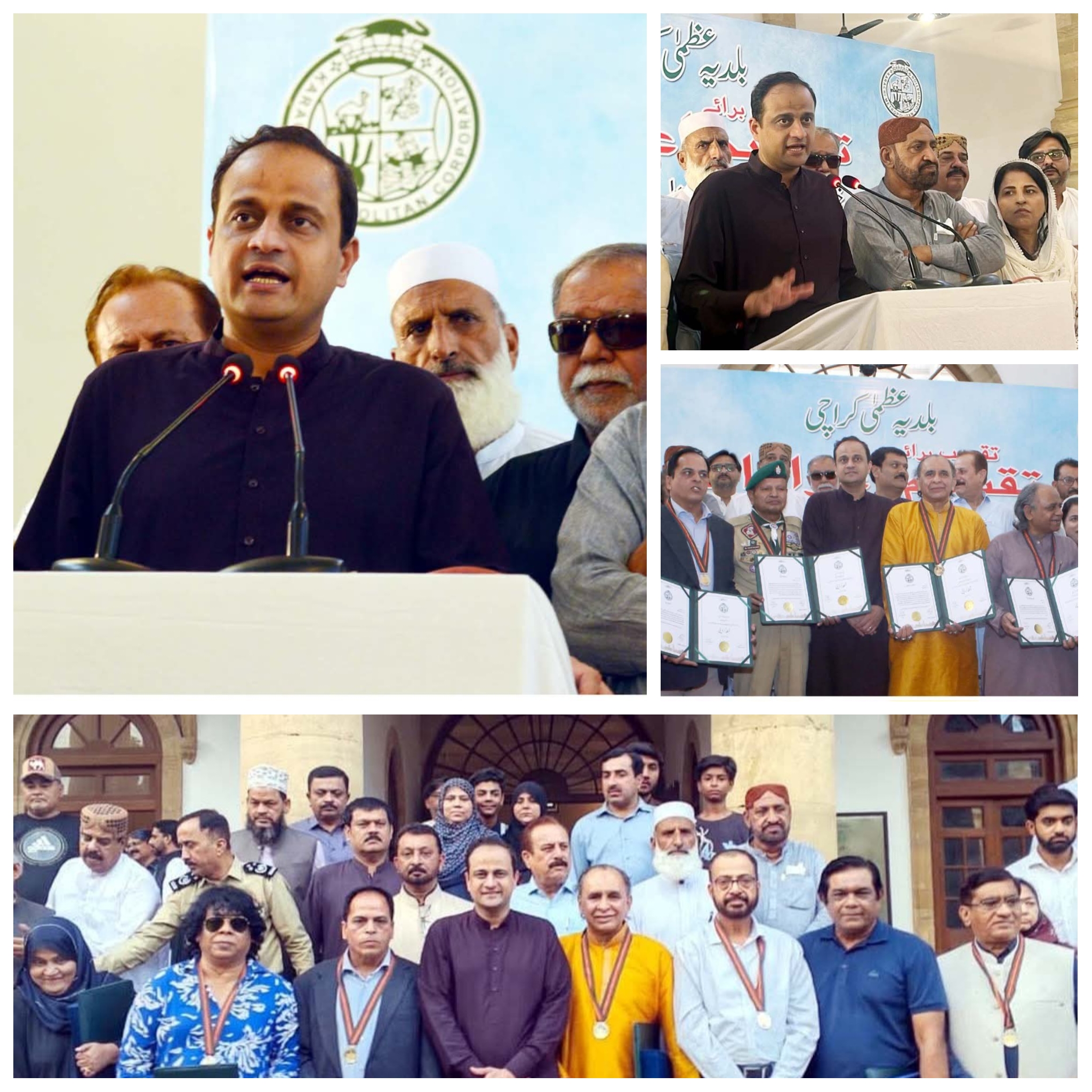 میئر کراچی بیرسٹر مرتضیٰ وہاب نے کہا ہے کہ شہر کا نام روشن کرنے والے افراد ہمارے اصل ہیروز ہیں اور ان کی خدمات کو سراہنا ہم سب کی ذمہ داری ہے جن شخصیات کو آج تمغہ کراچی سے نوازا گیا ہے وہ مبارکباد کے مستحق ہیں اور بطور شہری میں ان سب کا مشکور ہوں کہ انہوں نے اپنے فن، ہنر اور کاوشوں سے کراچی، سندھ اور پاکستان کا نام روشن کیا،شہر کی خدمت کرنے والی نمایاں شخصیات ہمارے لیے قابلِ فخر اثاثہ ہیں جبکہ شہداء کی قربانیاں ہمیشہ سنہری حروف میں یاد رکھی جائیں گی، ان افراد کو ”تمغہ کراچی“ دینا دراصل ان کی خدمات کے اعتراف اور خراجِ تحسین کا اظہار ہے،ان خیالات کا اظہار انہوں نے اتوار کے روز خالق دینا ہال میں شہر کراچی کی معروف شخصیات کو ”تمغہ کراچی“ کا اعزاز عطا کئے جانے کی تقریب سے بطور مہمان خصوصی خطاب کرتے ہوئے کیا،اس موقع پر میونسپل کمشنر کے ایم سی ابرار جعفر، کے ایم سی سٹی کونسل میں پارلیمانی لیڈر کرم اللہ وقاصی، ڈپٹی پارلیمانی لیڈر دل محمد، جمن دروان، سٹی کونسل کے اراکین، سینئر ڈائریکٹر محکمہ کھیل و ثقافت کے ایم سی مہدی مالوف، ڈائریکٹر محکمہ کھیل و ثقافت شمس نور مسعودی،کے ایم سی کے محکمہ جاتی سربراہان اور افسران سمیت مختلف شعبہ ہائے زندگی سے تعلق رکھنے والی شخصیات بھی بڑی تعداد میں موجود تھیں، منعقدہ تقریب میں ”تمغہ کراچی“ پانے والی نمایاں شخصیات میں سابق کرکٹر راشد لطیف، بلدیہ عظمیٰ کراچی محکمہ فائربریگیڈ کے فائرفائٹر شہید فرقان شوکت، انسٹیٹیوٹ لیبر اینڈ ریسرچ کرامات علی، شعبہ تحقیق و تصنیف،معروف نیوز کاسٹر اور میڈیا کنسلٹنٹ کے ایم سی علی حسن ساجد، شعبہ پینٹنگ غلام عباس کمانگر، شعبہ صحافت تصنیف و تالیف شاہ ولی اللہ جنیدی، شعبہ فائن آرٹس محترمہ معصومہ حالائی، شعبہ سمندری حیات و تحقیق ڈاکٹر عابد رضا، شعبہ خطاطی کاشف خان، شعبہ کلاسیکل موسیقی استاد مظہر عمراؤ بندو خان، شعبہ فنون لطیفہ امجد رانا اور شعبہ خدمات عامہ اسکاؤٹنگ طاہر شیخ اور دیگر شامل تھے،