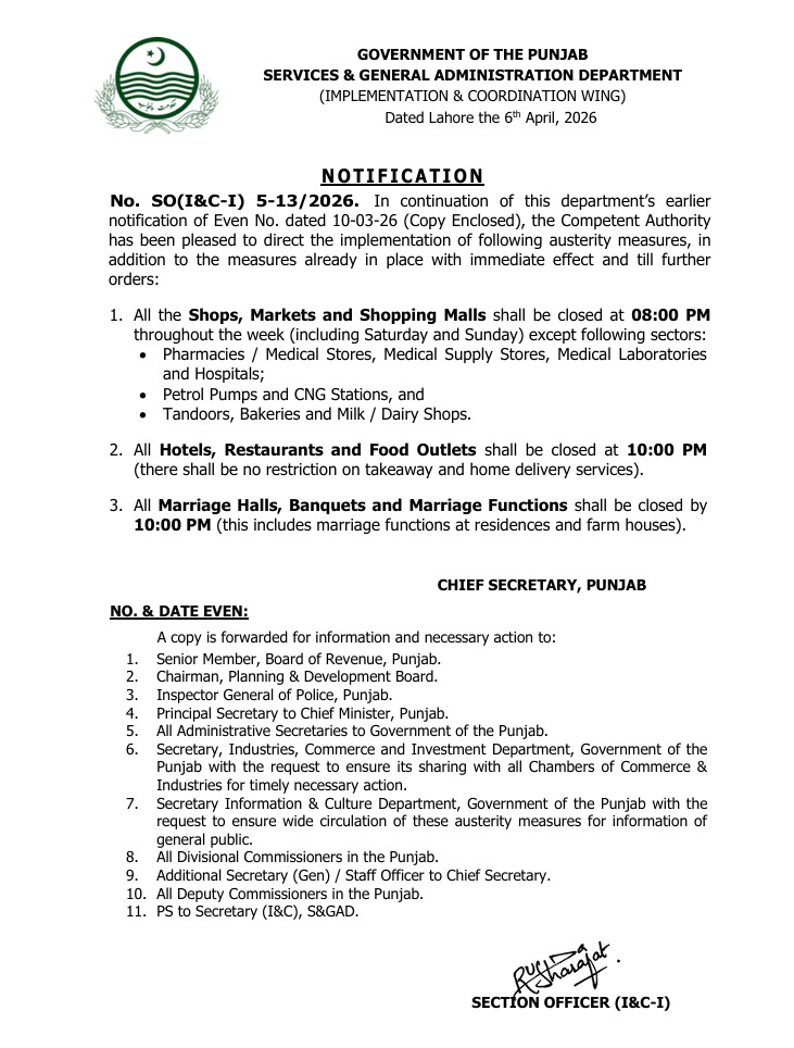 پنجاب حکومت کا بڑا فیصلہ، وزیراعلیٰ پنجاب کی ہدایت پر صوبے بھر میں کفایت شعاری کے سخت اقدامات نافذ کردیے گئے۔ ڈپٹی کمشنر لاہور نے مارکیٹیں رات 8 بجے، ریسٹورنٹس اور شادی ہالز 10 بجے بند کرنے کے احکامات پر عملدرآمد کی ہدایت کردی۔موجودہ معاشی صورتحال کے پیش نظر، وزیراعلیٰ پنجاب کی خصوصی ہدایت پر پنجاب بھر میں بچت اور کفایت شعاری کے نئے اقدامات کا نوٹیفکیشن جاری کردیا گیا ہے۔ ڈپٹی کمشنر لاہور کیپٹن (ر) محمد علی اعجاز کی ہدایت کہ تمام مارکیٹیں اور شاپنگ مالز رات 8 بجے جبکہ ریسٹورنٹس اور شادی ہالز رات 10 بجے بند ہوجائیں گے۔ سرکاری محکموں کیلئے بھی سخت پالیسی اپناتے ہوئے سرکاری گاڑیوں کے فیول کوٹے میں 50 فیصد کٹوتی، نئی گاڑیوں کی خریداری پر پابندی اور سرکاری عشائیوں پر مکمل پابندی عائد کردی گئی ہے۔ ڈپٹی کمشنر نے تمام اسسٹنٹ کمشنرز کو ان احکامات پر سختی سے عملدرآمد کو یقینی بنانے کی ہدایت کی ہے۔