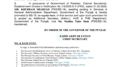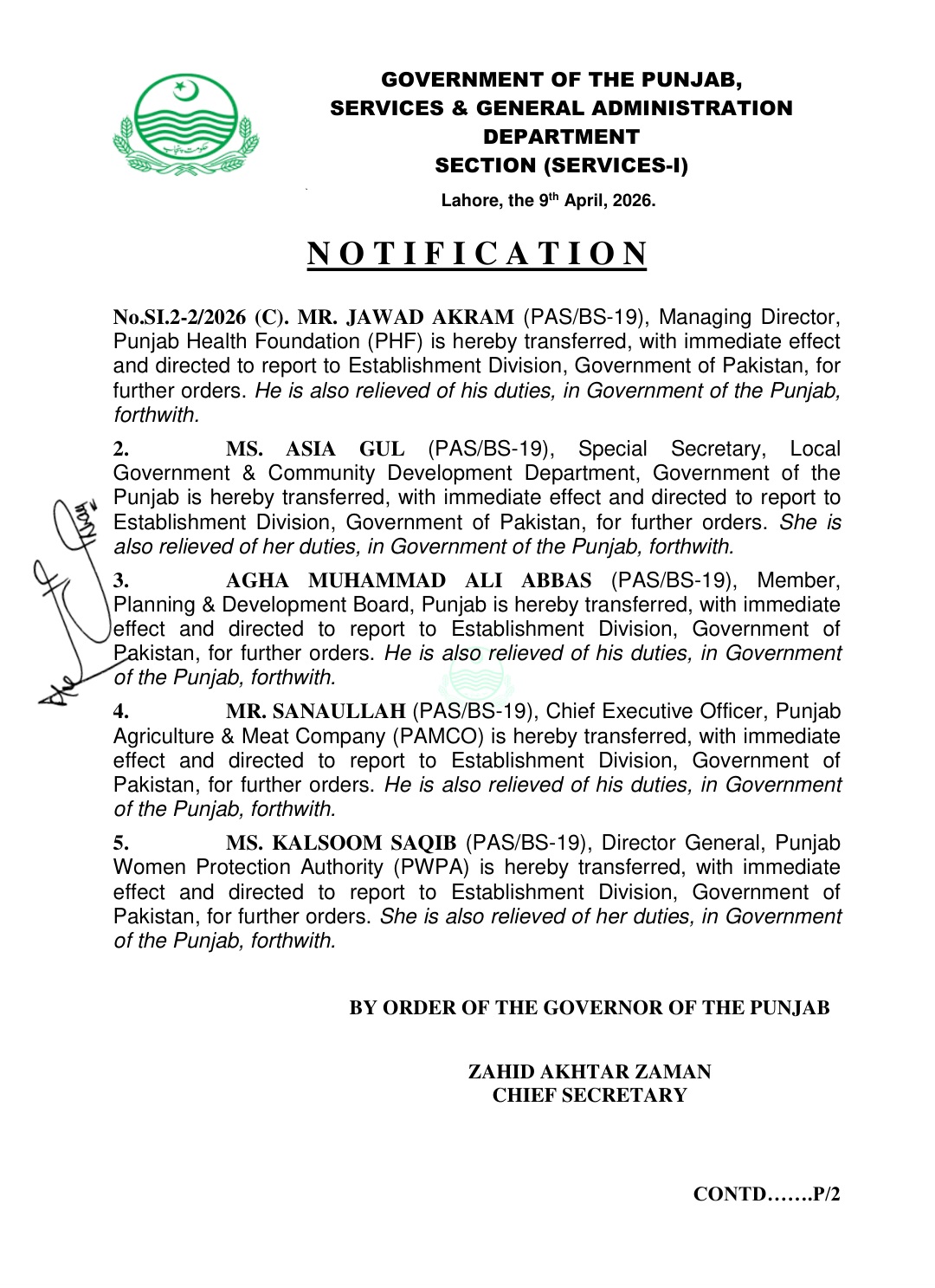 جواد اکرم منیجنگ ڈائریکٹر، پنجاب ہیلتھ فاؤنڈیشن کو فوری طور پر تبدیل کر دیا گیا ہے اور انہیں مزید احکامات کے لیے اسٹیبلشمنٹ ڈویژن، حکومت پاکستان کو رپورٹ کرنے کی ہدایت کی گئی ہے۔ انہیں حکومت پنجاب میں اپنے فرائض سے بھی فوری طور پر فارغ کر دیا گیا ہے۔ آسیہ گل سپیشل سیکرٹری، لوکل گورنمنٹ اینڈ کمیونٹی ڈویلپمنٹ ڈیپارٹمنٹ، حکومت پنجاب کو فوری طور پر تبدیل کر دیا گیا ہے اور انہیں مزید احکامات کے لیے اسٹیبلشمنٹ ڈویژن، حکومت پاکستان کو رپورٹ کرنے کی ہدایت کی گئی ہے۔آغا محمد علی عباس ممبر، پلاننگ اینڈ ڈویلپمنٹ بورڈ، پنجاب کو فوری طور پر تبدیل کر دیا گیا ہے اور مزید احکامات کے لیے اسٹیبلشمنٹ ڈویژن، حکومت پاکستان کو رپورٹ کرنے کی ہدایت کی گئی ہے۔ انہیں حکومت پنجاب میں اپنے فرائض سے بھی فوری طور پر فارغ کر دیا گیا ہے۔ ثناء اللہ چیف ایگزیکٹو آفیسر، پنجاب ایگریکلچر اینڈ میٹ کمپنی (PAMCO) کو فوری طور پر تبدیل کر دیا گیا ہے اور انہیں مزید احکامات کے لیے اسٹیبلشمنٹ ڈویژن، حکومت پاکستان کو رپورٹ کرنے کی ہدایت کی گئی ہے۔کلثوم ثاقب ڈائریکٹر جنرل، پنجاب ویمن پروٹیکشن اتھارٹی (PWPA) کو فوری طور پر تبدیل کر دیا گیا ہے اور انہیں مزید احکامات کے لیے اسٹیبلشمنٹ ڈویژن، حکومت پاکستان کو رپورٹ کرنے کی ہدایت کی گئی ہے۔ وہ حکومت پنجاب میں اپنی ذمہ داریوں سے بھی فوراً فارغ ہو گئی ہیں.چیف سیکرٹری پنجاب زاہد اختر زمان کی جانب سے نوٹیفکیشن جاری کر دیا گیا ہے۔