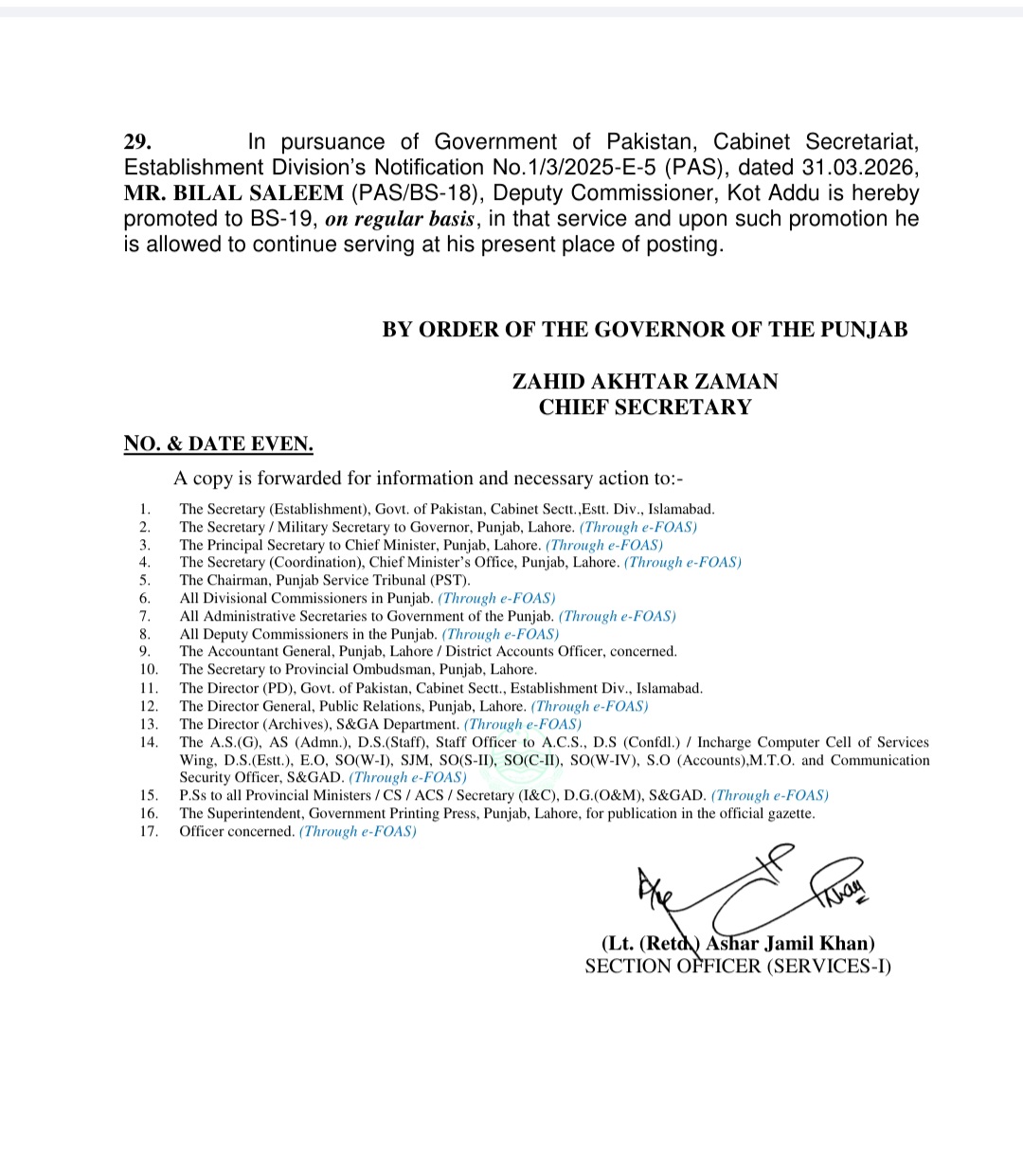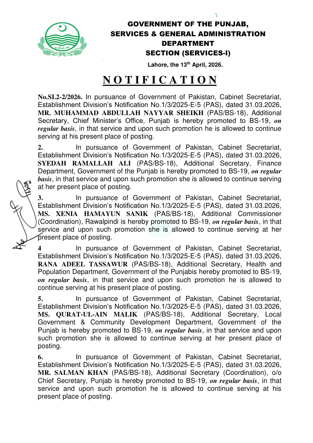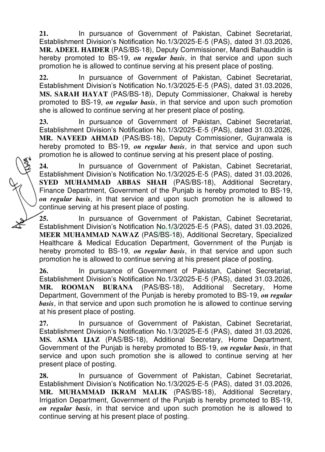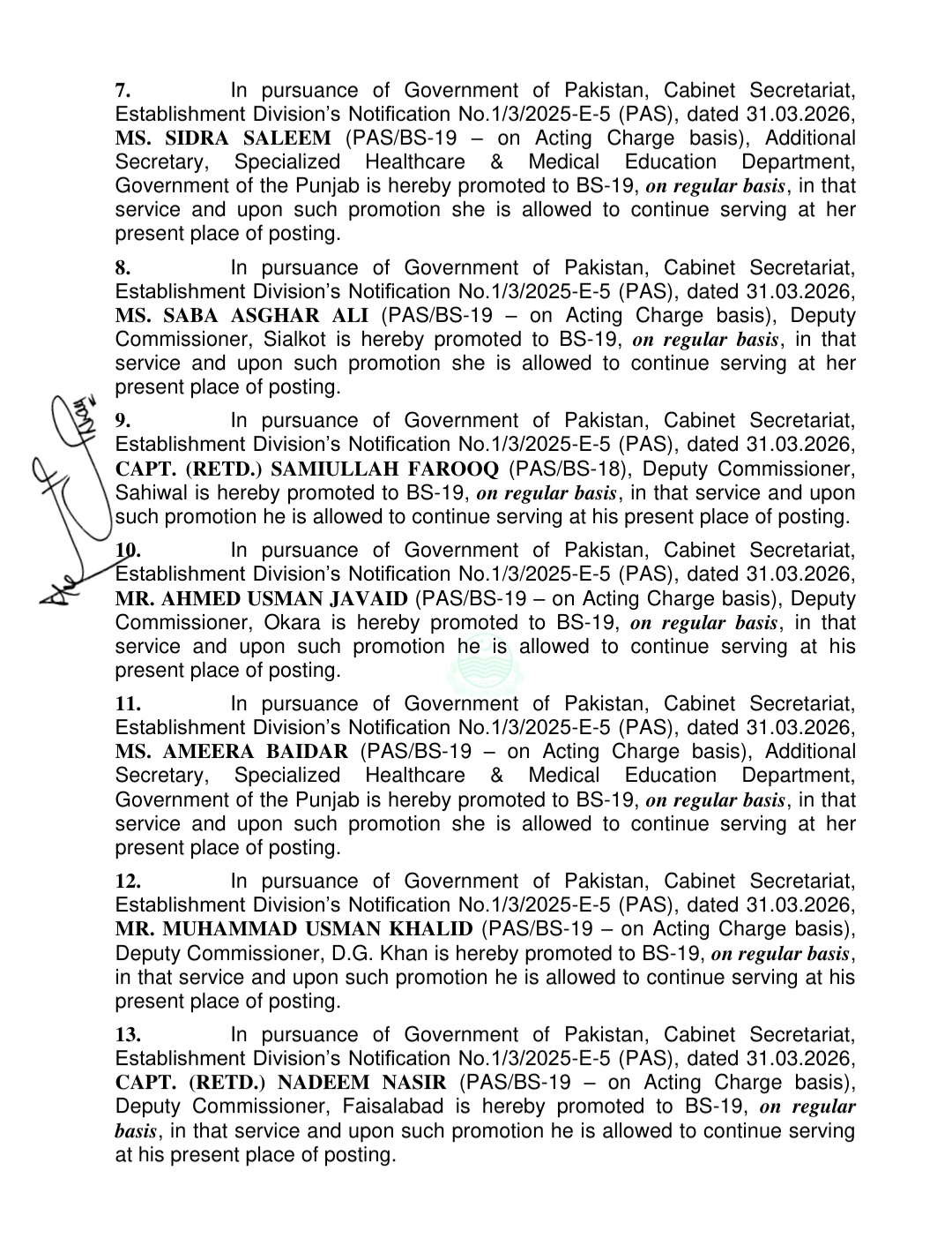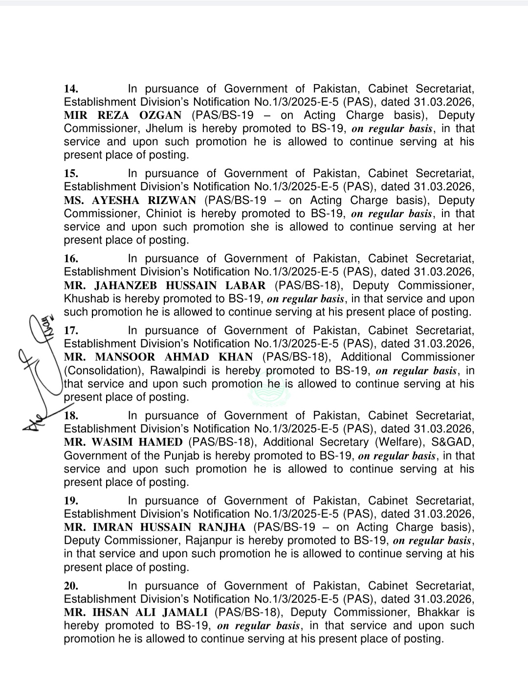 میر رضا اوزگان ڈپٹی کمشنر، جہلم، عائشہ رضوان ڈپٹی کمشنر، چنیوٹ، جہانزیب حسین لابر ڈپٹی کمشنر، خوشاب، منصور احمد خان ایڈیشنل کمشنر (کنسولیڈیشن) راولپنڈی،وسیم حمید ایڈیشنل سیکرٹری (ویلفیئر)، ایس اینڈ جی اے ڈی، حکومت پنجاب، عمران حسین رانجھا ڈپٹی کمشنر، راجن پور اوراحسان علی جمالی ڈپٹی کمشنر، بھکر کو BS-19 میں مستقل بنیادوں پر اس سروس میں ترقی دی جاتی ہے اور اس طرح کی ترقی کے بعد انہیں اپنی موجودہ پوسٹنگ پر خدمات جاری رکھنے کی اجازت دی گئی ہے۔