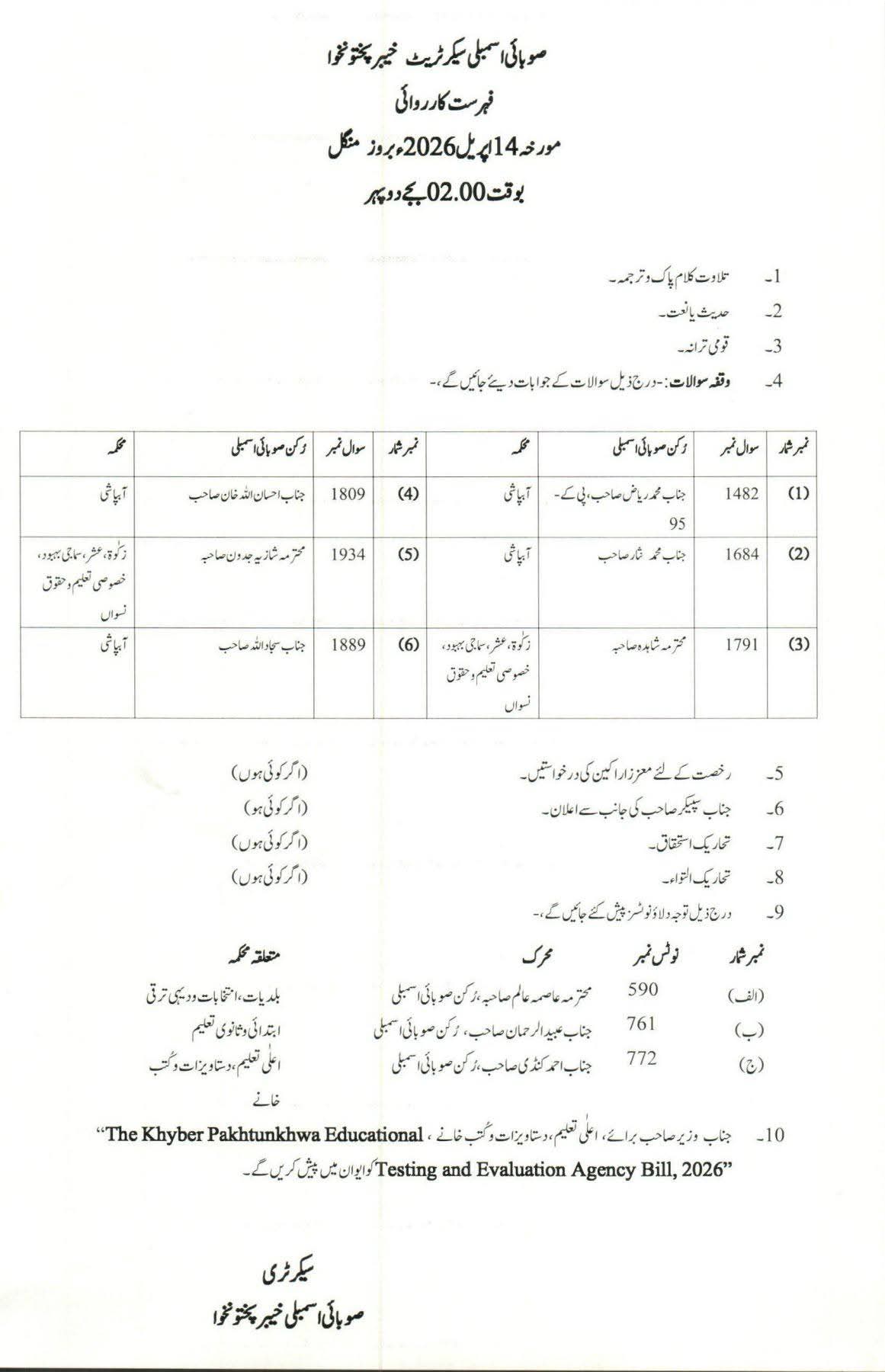 پشاور(بلدیات ٹائمز) لوکل گورنمنٹ ایمپلائز فیڈریشن خیبر پختونخوا کی مسلسل اور بھرپور کوششوں کے نتیجے میں صوبائی اسمبلی کے نویں اجلاس میں کل مورخہ 14 اپریل 2026 کو ایک اہم توجہ دلاؤ نوٹس (نمبر 590) پیش کیا جائیگا۔ یہ نوٹس ممبر صوبائی اسمبلی محترمہ عاصمہ عالم نے محکمہ لوکل گورنمنٹ کی توجہ دلانے کے لیے دیا۔نوٹس میں کہا گیا ہے کہ محکمہ بلدیات نے 12 مئی 2025 کو جاری ایک مراسلے کے تحت صوبہ بھر کے 82 دستکاری اسکولوں اور انڈسٹریل سینٹرز کو 15 جون 2025 سے بند کرنے کے احکامات جاری کر دیے ہیں۔
