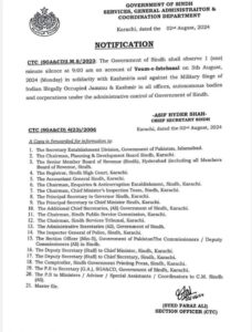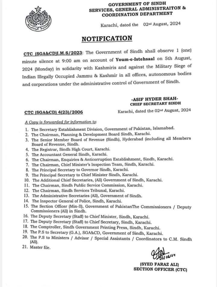 CTC (SGA&CD]I.M.S/2023: حکومت سندھ کشمیریوں سے اظہار یکجہتی اور فوجی محاصرے کے خلاف 5 اگست 2024 (پیر) کو یوم استحقاق کے موقع پر صبح 9:00 بجے 1 (ایک) منٹ کی خاموشی اختیار کرے گی۔ حکومت سندھ کے انتظامی کنٹرول کے تحت تمام دفاتر، خود مختار اداروں اور کارپوریشنوں میں ہندوستان کے غیر قانونی طور پر مقبوضہ جموں و کشمیر کے۔