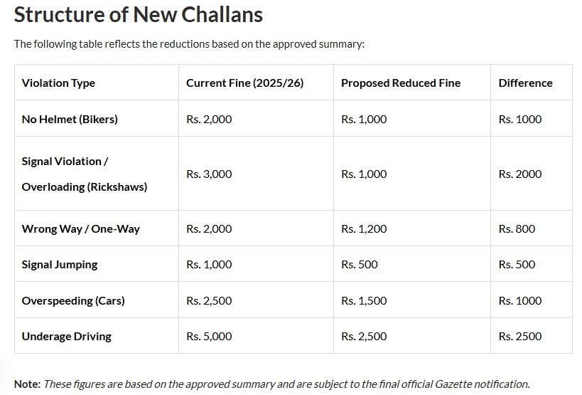 ◀️ہیلمٹ کی خلاف ورزی کا جرمانہ 2000 سے کم کرکے 1000 روپے کرنے کی تجویز◀️رکشہ پر سگنل کی خلاف ورزی یا اوور لوڈنگ کرنے پر جرمانہ 3000 سے کم کرکے 1000 روپے کرنے کی تجویز◀️رانگ وے یا ون وے کی خلاف ورزی پر جرمانہ 2000 سے کم کرکے 1200 روپے کرنے کی تجویز◀️سگنل کراس کرنے کی خلاف ورزی پر جرمانہ 1000 سے کم کرکے 500 روپے کرنے کی تجویز◀️اوور سپیڈنگ پر جرمانہ 2500 سے کم کرکے 1500 روپے کرنے کی تجویز◀️کم عمر ڈرائیونگ پر جرمانہ 5000 سے کم کرکے 2500 روپے کرنے کی تجویز