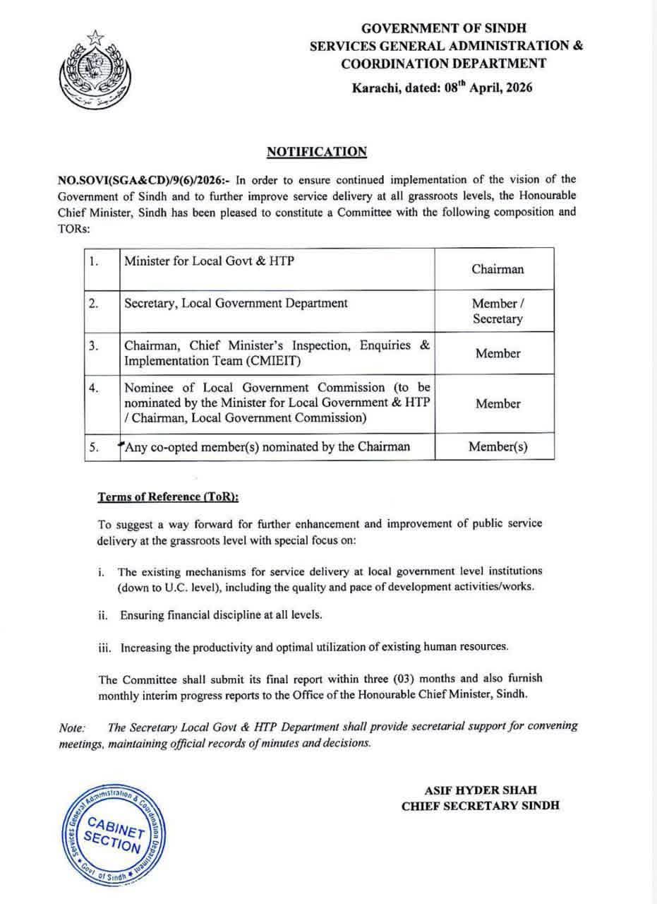 حکومت سندھ کے سروسز، جنرل ایڈمنسٹریشن اینڈ کوآرڈینیشن ڈیپارٹمنٹ نے بلدیاتی اداروں میں عوامی خدمات کی فراہمی کو مزید مؤثر بنانے اور مقامی سطح پر بہتری لانے کے لیے ایک اعلیٰ سطحی کمیٹی تشکیل دینے کا نوٹیفکیشن جاری کر دیا ہے۔ یہ نوٹیفکیشن 8 اپریل 2026 کو کراچی میں جاری کیا گیا۔جاری کردہ اعلامیے کے مطابق کمیٹی کے چیئرمین وزیر بلدیات و ہاؤسنگ، ٹاؤن پلاننگ ہوں گے جبکہ سیکریٹری بلدیات کو کمیٹی کاسیکریٹری مقرر کیا گیا ہے۔ اس کے علاوہ وزیر اعلیٰ کے انسپیکشن، انکوائریز اینڈ امپلیمنٹیشن ٹیم (CMIEIT) کے چیئرمین، لوکل گورنمنٹ کمیشن کے نامزد نمائندے، اور چیئرمین کی جانب سے نامزد دیگر اراکین بھی کمیٹی کا حصہ ہوں گے۔کمیٹی کے قیام کا مقصد مقامی سطح پر عوامی خدمات کی فراہمی کے نظام کو مزید بہتر بنانا ، خاص طور پر یونین کونسل سطح تک موجودہ سروس ڈیلیوری کے طریقہ کار کا جائزہ لینا، ترقیاتی کاموں کے معیار اور رفتار کو بہتر بنانا، مالیاتی نظم و ضبط کو یقینی بنانا، اور انسانی وسائل کے مؤثر استعمال کو فروغ دینا شامل ہے۔کمیٹی بلدیاتی کاؤنسلز کے متعلق وصول ہونے والی مالی اور انتظامی شکایات، فنڈز کے غلط استمعال، غیر قانونی بھرتیوں، آمدنی میں بےظابطگیوں کا بھی جائزہ لے گی۔مزید برآں، کمیٹی کو ہدایت دی گئی ہے کہ وہ تین ماہ کے اندر اپنی حتمی رپورٹ پیش کرے جبکہ ہر ماہ عبوری پیش رفت رپورٹ بھی وزیر اعلیٰ سندھ کے دفتر کو ارسال کرے گی۔نوٹیفکیشن کے مطابق، سیکریٹری بلدیات کمیٹی کے اجلاسوں کے انعقاد، منٹس کی تیاری اور سرکاری ریکارڈ کی دیکھ بھال کے لیے سیکریٹریل معاونت فراہم کریں گے۔