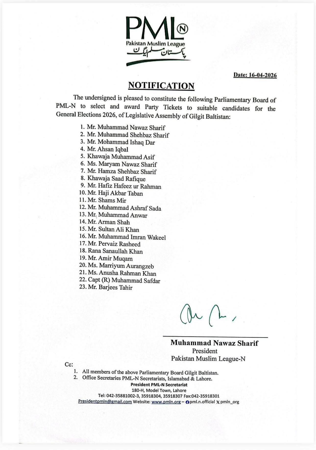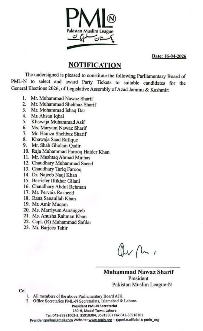 مسلم لیگ ن کے قائد میاں محمد نواز شریف کی جانب سےگلگت بلتستان اور آزاد کشمیر کی قانون ساز اسمبلیوں کے عام انتخابات 2026 کے لئے موزوں امیدواروں کو منتخب کرنے اور پارٹی ٹکٹ دینے کے لیے مسلم لیگ ن کے