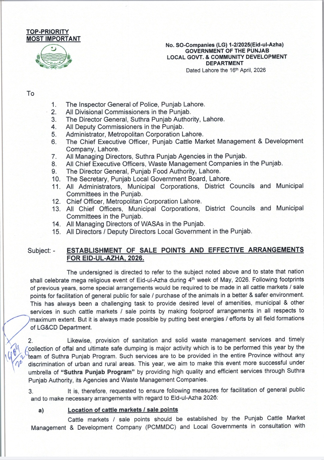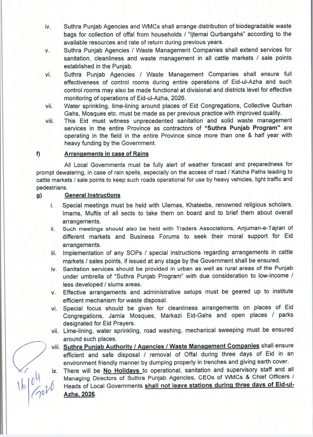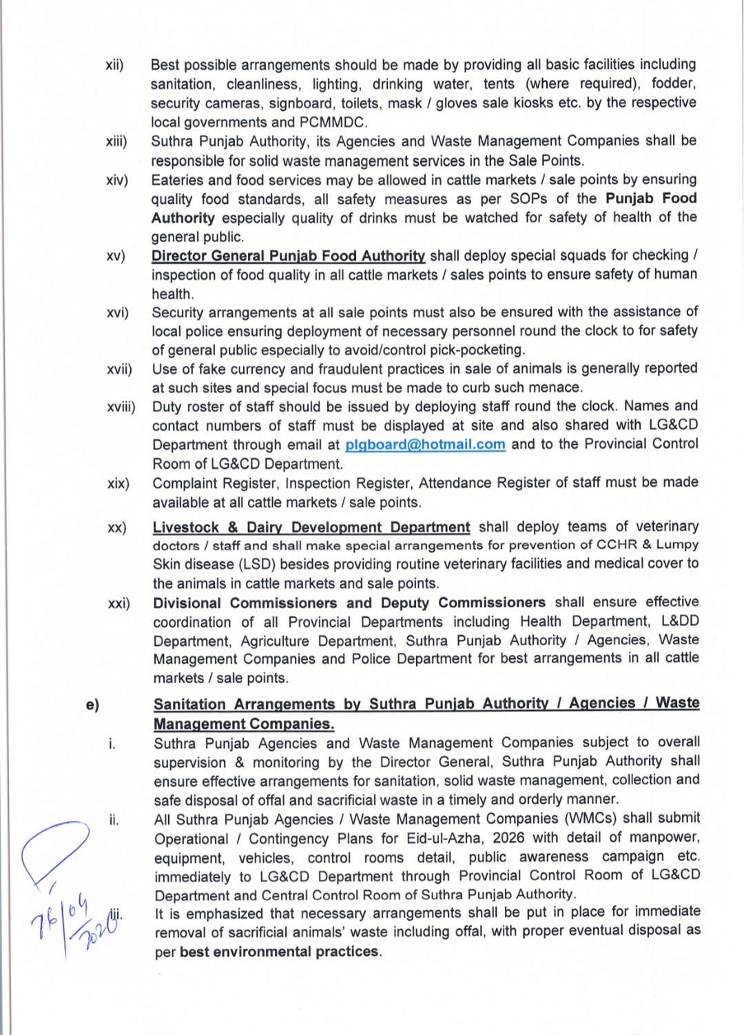 لیکن یہ ہمیشہ ایل جی اینڈ سی ڈی ڈیپارٹمنٹ کی تمام فیلڈ فارمیشنوں کی طرف سے بہترین توانائیاں/کاوشیں لگا کر ممکن ہوا ہے۔ اسی طرح، صفائی اور سالڈ ویسٹ مینجمنٹ کی خدمات کی فراہمی، حتمی محفوظ ڈمپنگ کو بروقت جمع کرنا ایک اہم سرگرمی ہے جو اس سال سُتھرا پنجاب پروگرام کی 22 ٹیموں کے ذریعہ انجام دی جانی ہے۔اس طرح کی خدمات پورے صوبے میں شہری اور دیہی علاقوں کی تفریق کے بغیر فراہم کی جانی ہیں۔ اس سال، ہمارا مقصد "ستھرا پنجاب پروگرام” کی چھتری کے تحت سُتھرا پنجاب اتھارٹی، اس کی ایجنسیوں اور ویسٹ مینجمنٹ کمپنیوں کے ذریعے اعلیٰ معیار اور موثر خدمات فراہم کر کے اس ایونٹ کو مزید کامیاب بنانا ہے۔ اس لیے عوام الناس کی سہولت کے لیے درج ذیل اقدامات کو یقینی بنانے اور عیدالاضحیٰ 2026:3 کے حوالے سے ضروری انتظامات کرنے کی درخواست کی جاتی ہے۔ a) مویشی منڈیوں / سیل پوائنٹس کا مقام،پنجاب کیٹل مارکیٹ مینجمنٹ اینڈ ڈویلپمنٹ کمپنی (PCMMDC) اور مقامی حکومتوں کی مشاورت سے مویشی منڈیاں/ سیل پوائنٹس قائم کیے جائیں۔