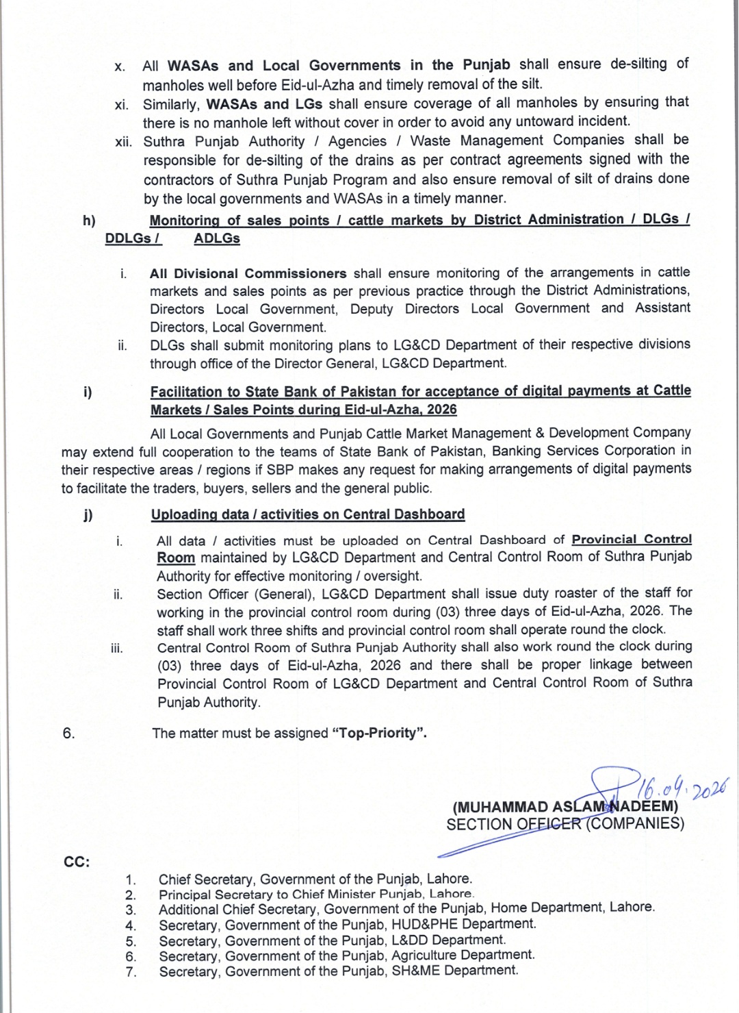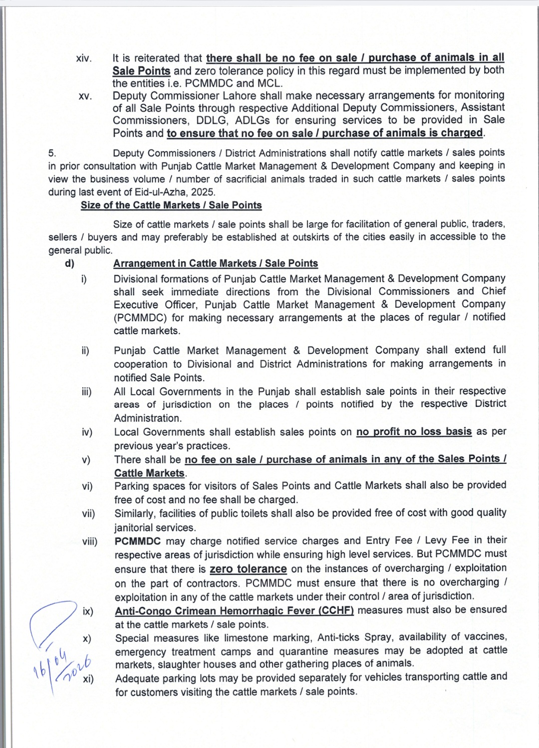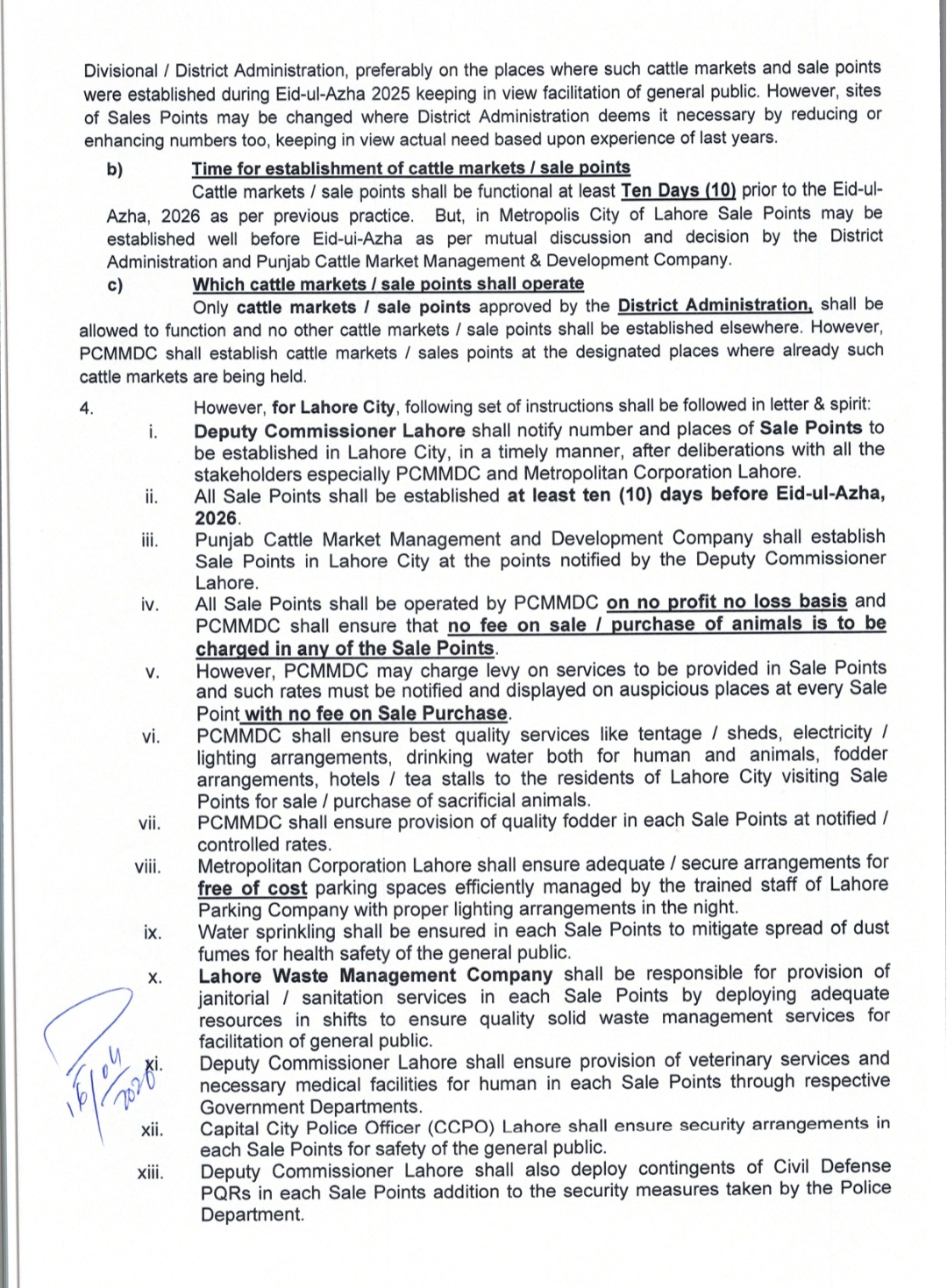 لیکن یہ ہمیشہ ایل جی اینڈ سی ڈی ڈیپارٹمنٹ کی تمام فیلڈ فارمیشنوں کی طرف سے بہترین توانائیاں/کاوشیں لگا کر ممکن ہوا ہے۔ اسی طرح، صفائی اور سالڈ ویسٹ مینجمنٹ کی خدمات کی فراہمی، حتمی محفوظ ڈمپنگ کو بروقت جمع کرنا ایک اہم سرگرمی ہے جو اس سال سُتھرا پنجاب پروگرام کی 22 ٹیموں کے ذریعہ انجام دی جانی ہے۔اس طرح کی خدمات پورے صوبے میں شہری اور دیہی علاقوں کی تفریق کے بغیر فراہم کی جانی ہیں۔ اس سال، ہمارا مقصد "ستھرا پنجاب پروگرام” کی چھتری کے تحت سُتھرا پنجاب اتھارٹی، اس کی ایجنسیوں اور ویسٹ مینجمنٹ کمپنیوں کے ذریعے اعلیٰ معیار اور موثر خدمات فراہم کر کے اس ایونٹ کو مزید کامیاب بنانا ہے۔ اس لیے عوام الناس کی سہولت کے لیے درج ذیل اقدامات کو یقینی بنانے اور عیدالاضحیٰ 2026:3 کے حوالے سے ضروری انتظامات کرنے کی درخواست کی جاتی ہے۔ a) مویشی منڈیوں / سیل پوائنٹس کا مقام،پنجاب کیٹل مارکیٹ مینجمنٹ اینڈ ڈویلپمنٹ کمپنی (PCMMDC) اور مقامی حکومتوں کی مشاورت سے مویشی منڈیاں/ سیل پوائنٹس قائم کیے جائیں۔