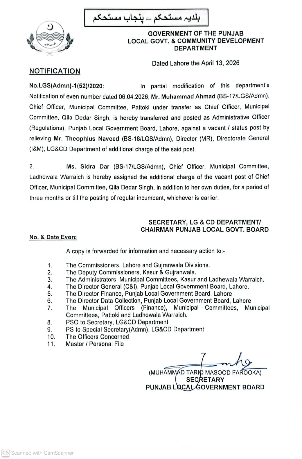 محکمہ بلدیات پنجاب نے چیف سیکرٹری کی طرف سے نکالے گئے آفیسر کو لوکل گورنمنٹ بورڈ میں اہم اسامی پر تعینات کر دیا۔چیف سیکرٹری پنجاب زاہد اختر زمان کی جانب سے بطور سزا ہٹائے گئے گریڈ 17 کے جونیئر آفیسر محمد احمد کو سیکرٹری بلدیات کی جانب سے ایڈمنسٹریٹو آفیسر ریگولیشنز پنجاب لوکل گورنمنٹ بورڈ تعینات کیا گیا ہے جنھیں پہلے چیف آفیسر پتوکی سےچیف آفیسر میونسپل کمیٹی قلعہ دیدار سنگھ تبدیل کیا گیا تھا۔واضع رہے کہ لوکل گورنمنٹ بورڈ کی جس اسامی پر مذکورہ آفیسر کو تعینات کیا گیا ہے اس کے اختیارات میں لوکل گورنمنٹ سروس کے چیف افسران،ایم اوز،ڈی اوز ریگولیشنز اور دیگر کے حوالے سے عدالتی معاملات اور دیگر سروس کے امور ہیں۔اس اسامی پر گریڈ 18 سے 19 کا آفیسر تعینات ہو سکتا ہے۔چیف سیکرٹری پنجاب نے سنگین الزامات پر مذکورہ آفیسر کو تبدیل کیا تھا۔یہ بات اہم ہے کہ ایڈمنسٹریٹو آفیسر ریگولیشنز کا چارج تھیوفلس نوید گریڈ18 کے آفیسر کے پاس ہے جو ڈائریکٹر ایم آر ڈائریکٹوریٹ جنرل آئی اینڈ ایم بھی ہیں۔محمد احمد کو تقرروتبادلے کے معاملات میں خرابی اور افسران کو حراساں کر کے معاملات ڈیل کرنے سمیت سنگین الزامات ہیں۔جو اب لوکل گورنمنٹ بورڈ میں دوبارہ مزید پرکشش سیٹ پر براجمان ہونے کے لئے سرگرم ہے۔